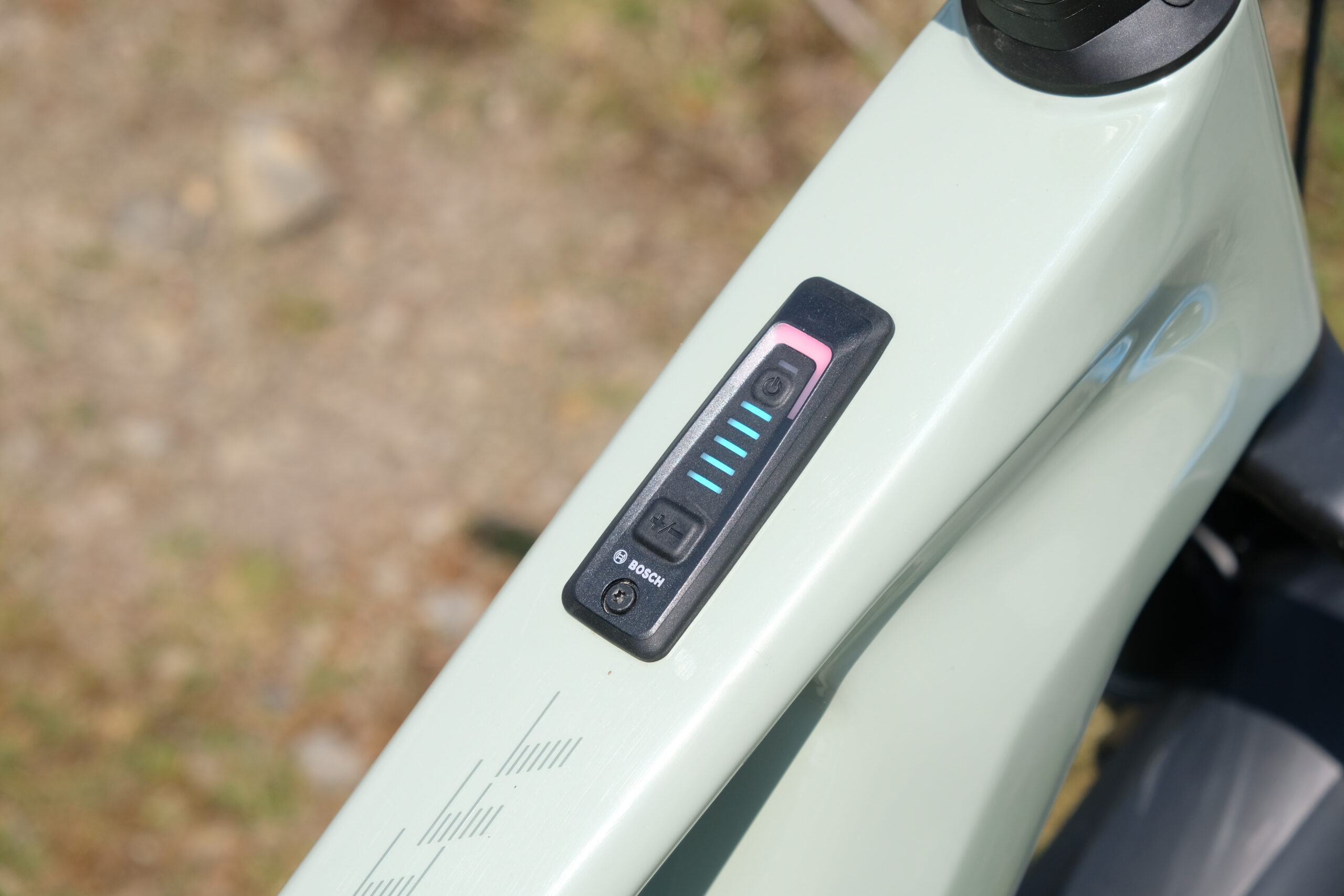 The motor stuff: Bosch Performance Line CX gives out 85Nm of torque and is controlled by a dinky Bluetooth remote next to the left-hand grip, with the top tube panel showing you battery level, what setting you’re in, and also hosting the on/off button.