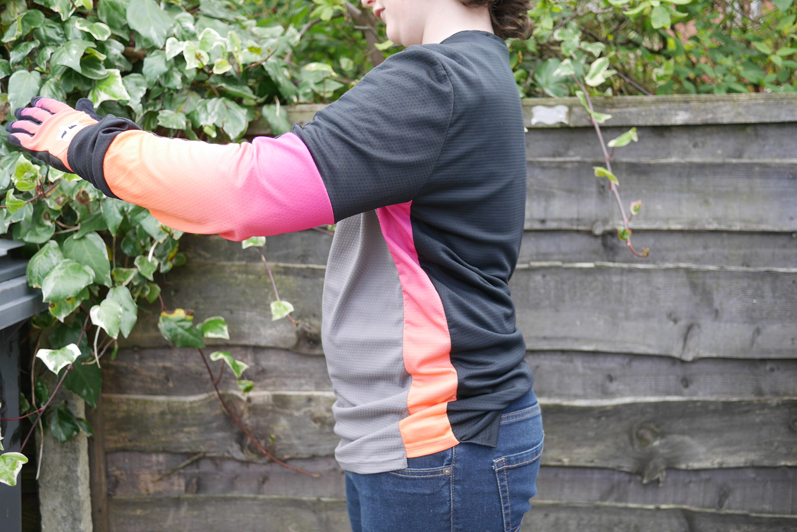 Super snazzy long sleeve jersey from Fox. In black, grey and what we’re going to call ‘Fruit Salad’ colourway. Plus a bonus bit of flouro acid green F O X across the chest. TruDri fabric to wick away sweat. Made from recycled fabrics. MTB-specific cut with room for elbow pads, and comes with a drop tail.