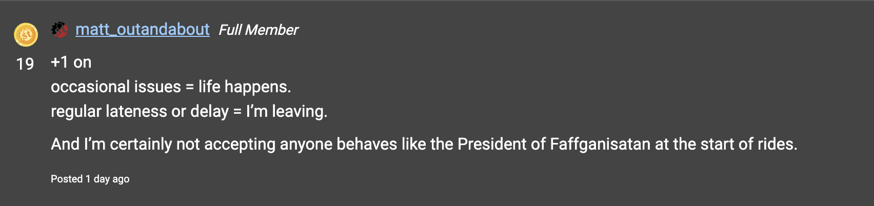 A special one-off award* this week. Congratulations to matt_outandabout for this comment on our Am I Being Unreasonable? MTB Court now in session! member’s content story…