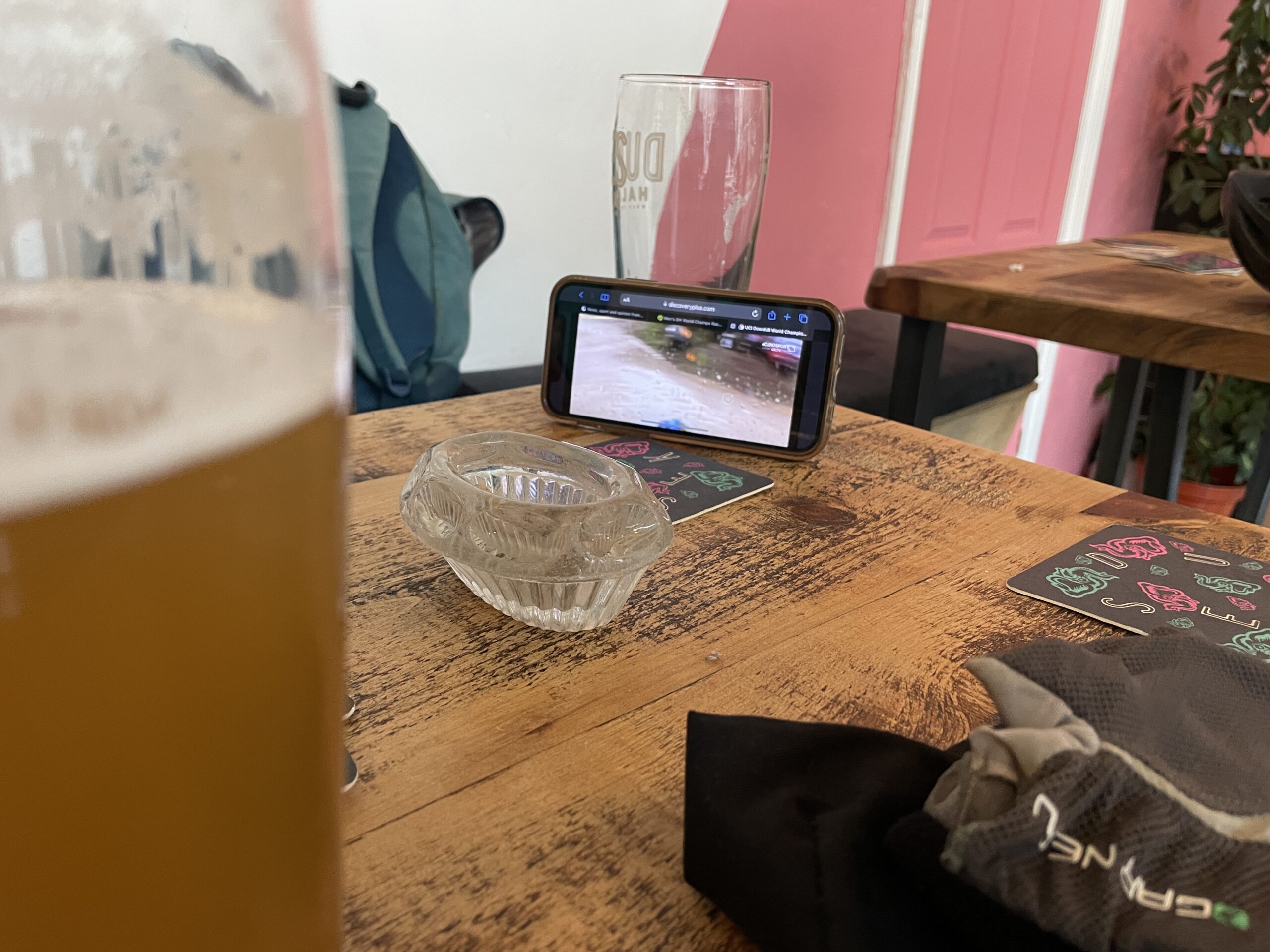 Oliver Davis goes into second, but a whole 7 seconds back from Greg. Good run from Davis though. Has something changed on the track, or are we into the riders who guessed the right tyres for the weather? Angel Suarez Alonso just grabbed the top spot. Things are hotting up, on the track, and here in the pub. Daz just arrived in full Lycra.