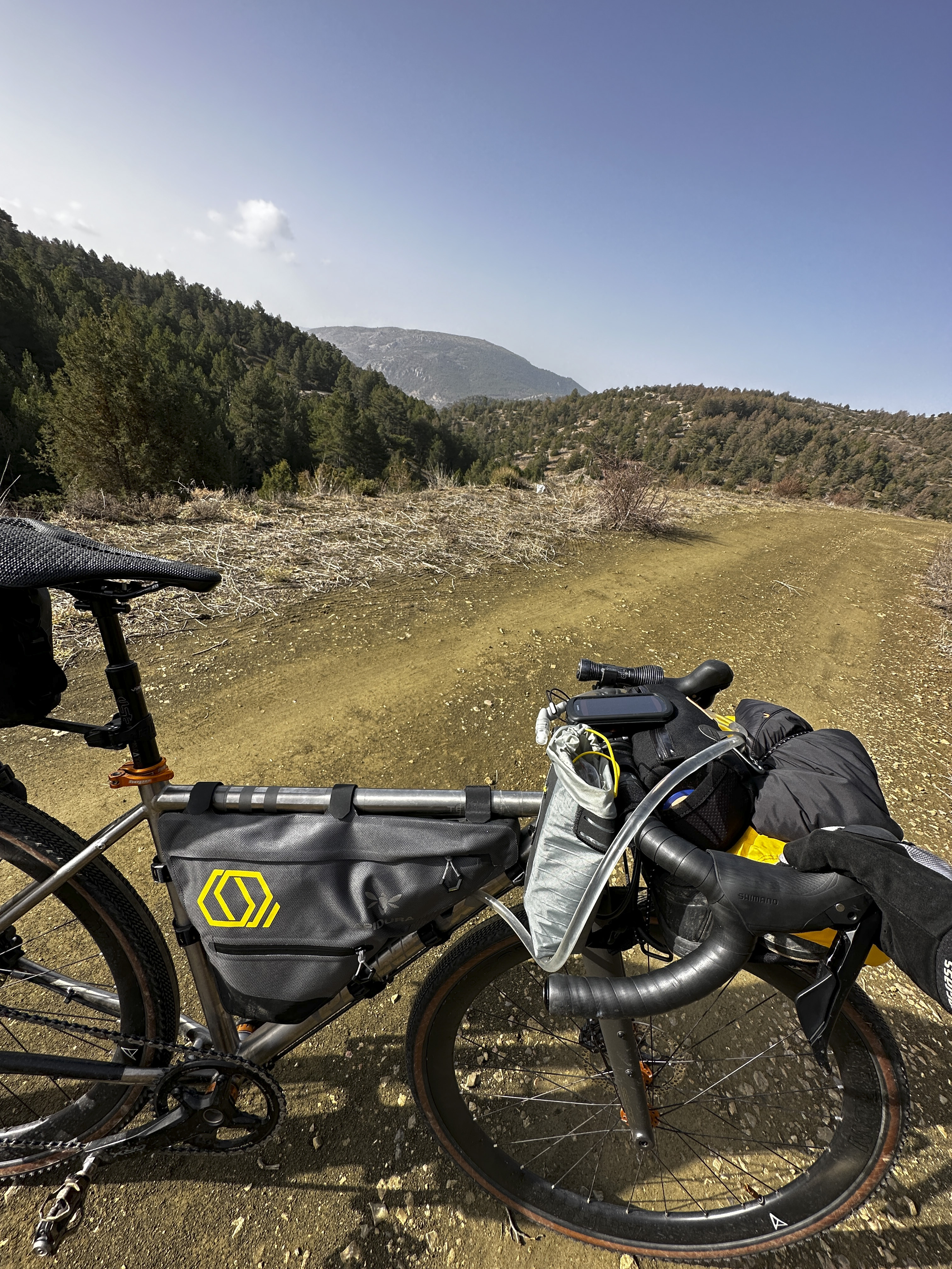 We approach a roadblock with no specific signage specifying what it’s for, and looking beyond it we see no sign of any road works, nor any collapsed roads or half built bridges (both of which are surprisingly common in rural areas), so we scoot around it and carry on our way. After around 10 minutes, we’re yelled at by a bloke in a huge dump truck on a road above the one we’re riding on. We realise that he’s on the new road, we’re on the old one, and ours is about to come to an end. This isn’t the first time we’ve seen a very smooth undamaged road being resurfaced or replaced. They must have a huge budget for the roads to be able to justify rebuilding this one, out in the sticks with nobody but goats and lost bikepackers using it.