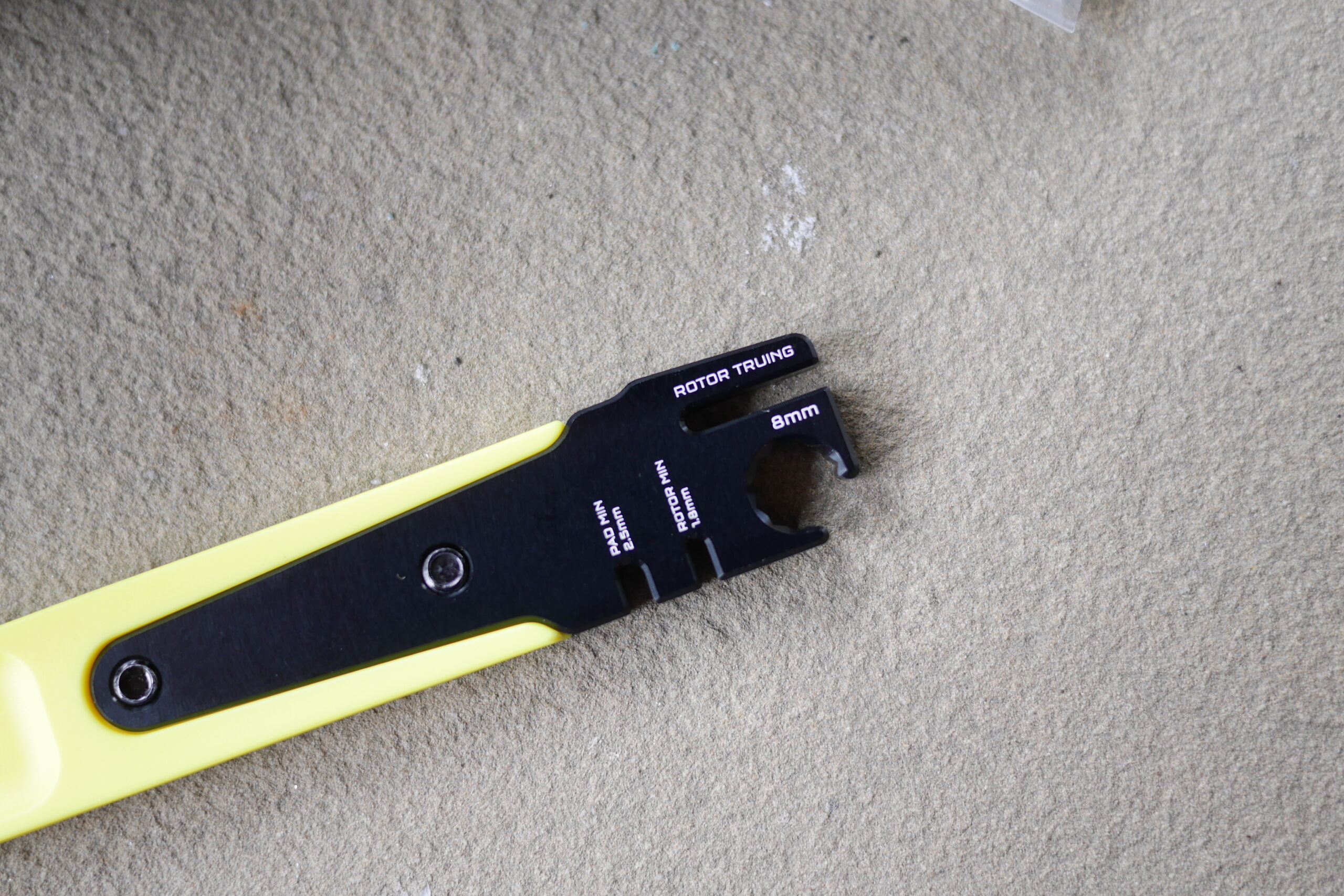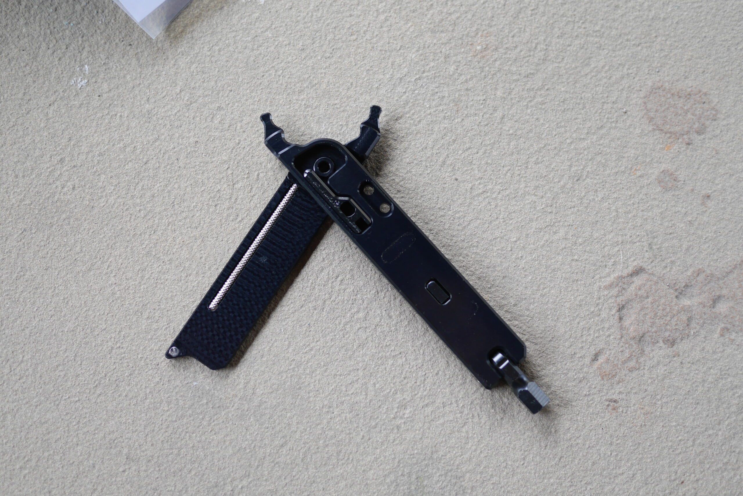 A real MacGyver multitool combo. 2-8mm Allen, T10 & T25 torx, screwdriver flat #3.5, screwdriver Philips #2, spoke/valve core wrench, valve cleaning file, pliers to open chain links, pliers to tighten valve nuts, storage for a chain link, 8mm wrench, rotor thickness gauge, rotor tuning slot, brake disc wear indicator (1.8mm), gert big yellow tyre lever.