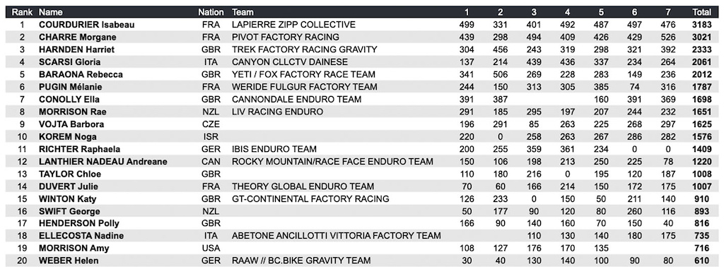 In the womenās competition, the overall series win was Isabeau Courdurierās to lose. The Lapierre Zipp Collective racer only needed to put in a conservative effort in order to lift the new trophy, with Morgane Charre (Pivot Factory Racer) the lone rider who was theoretically capable of depriving the two times Enduro World Series overall winner the title. And despite Charreās heroic efforts, the race win was not enough to stop Courdurier from securing the overall title.