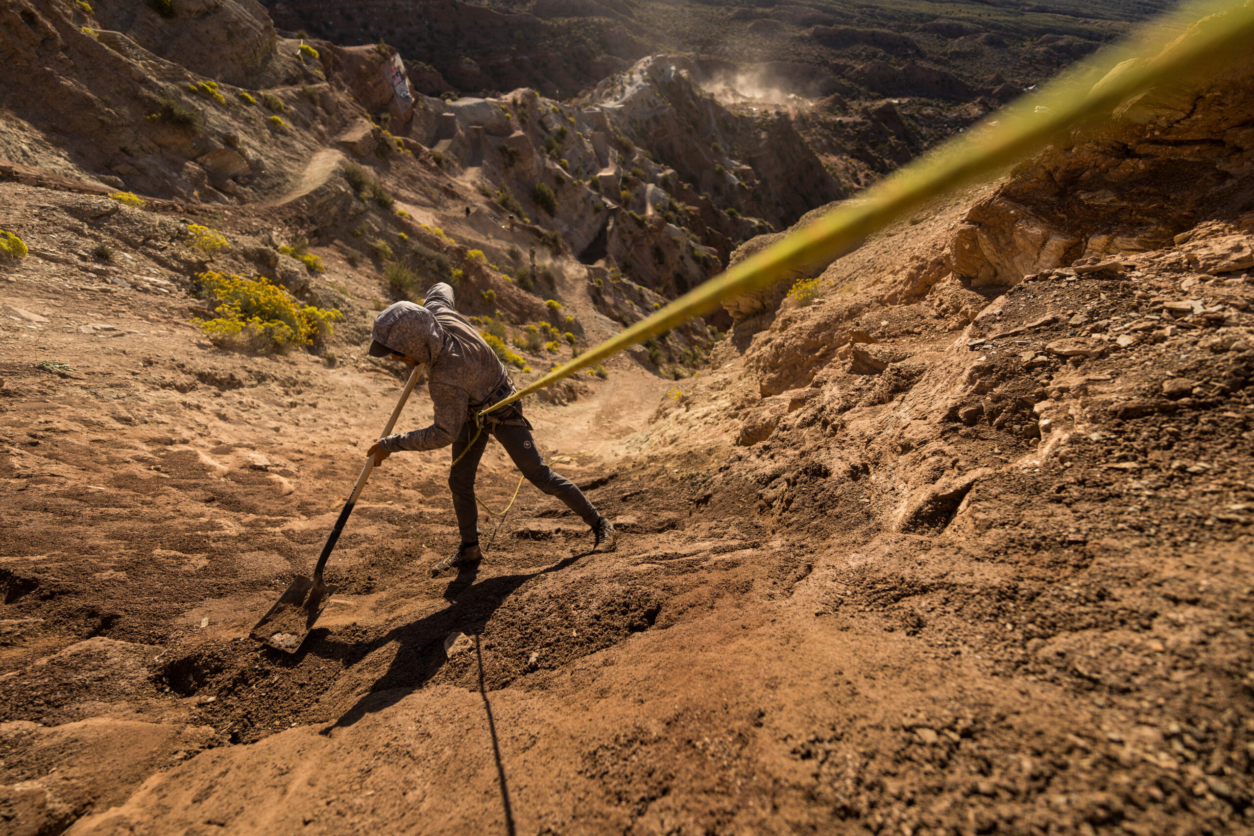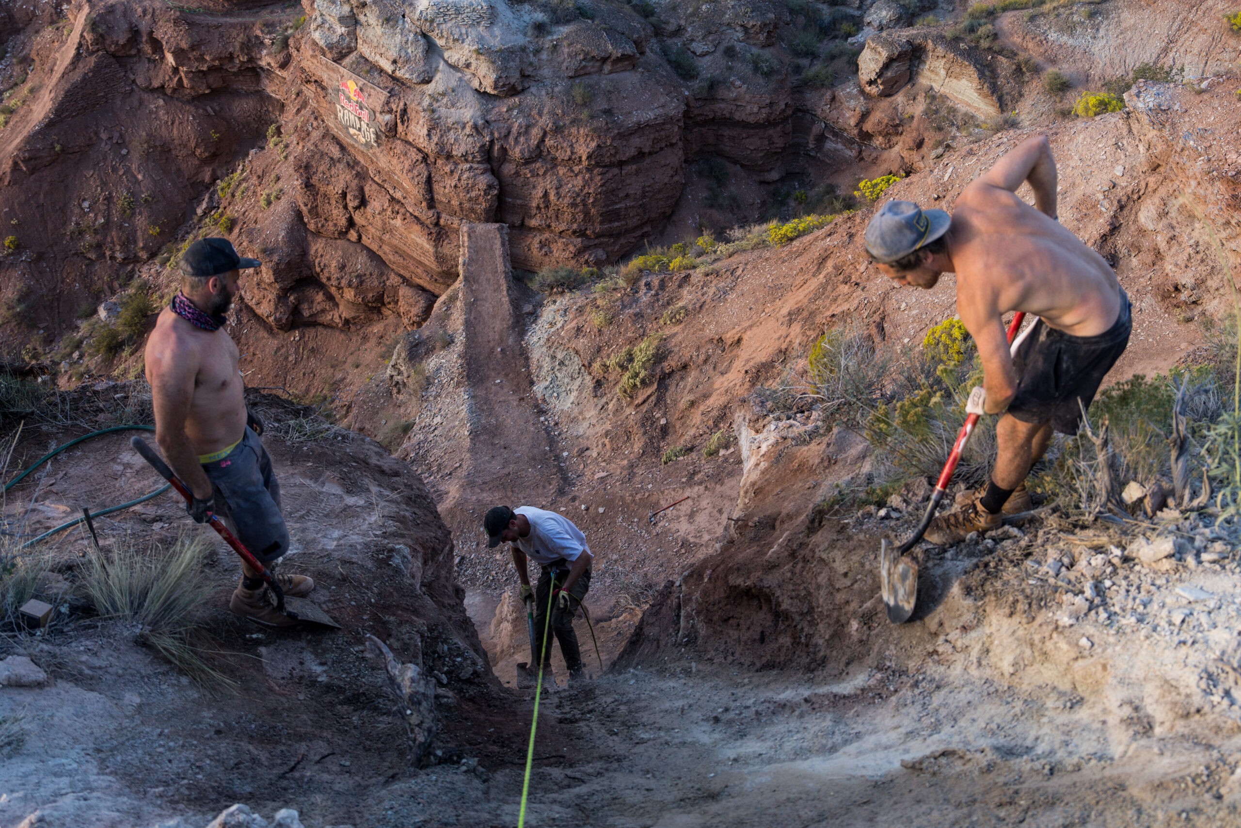 Fairclough and canyon gaps go hand in hand at Rampage; this year, he’s built another show-stopper, a 60-foot sender. The canyon enticed the Brit, as past and current riders didn’t heavily utilize it. One of the most challenging aspects of building the feature was ensuring he had enough speed. With canyon gaps, you won’t know the true speed until you’re in the air. Fairclough and his team have been meticulously chipping away at the run-in to avoid that situation altogether, yet the entrance is still a highly technical chute.