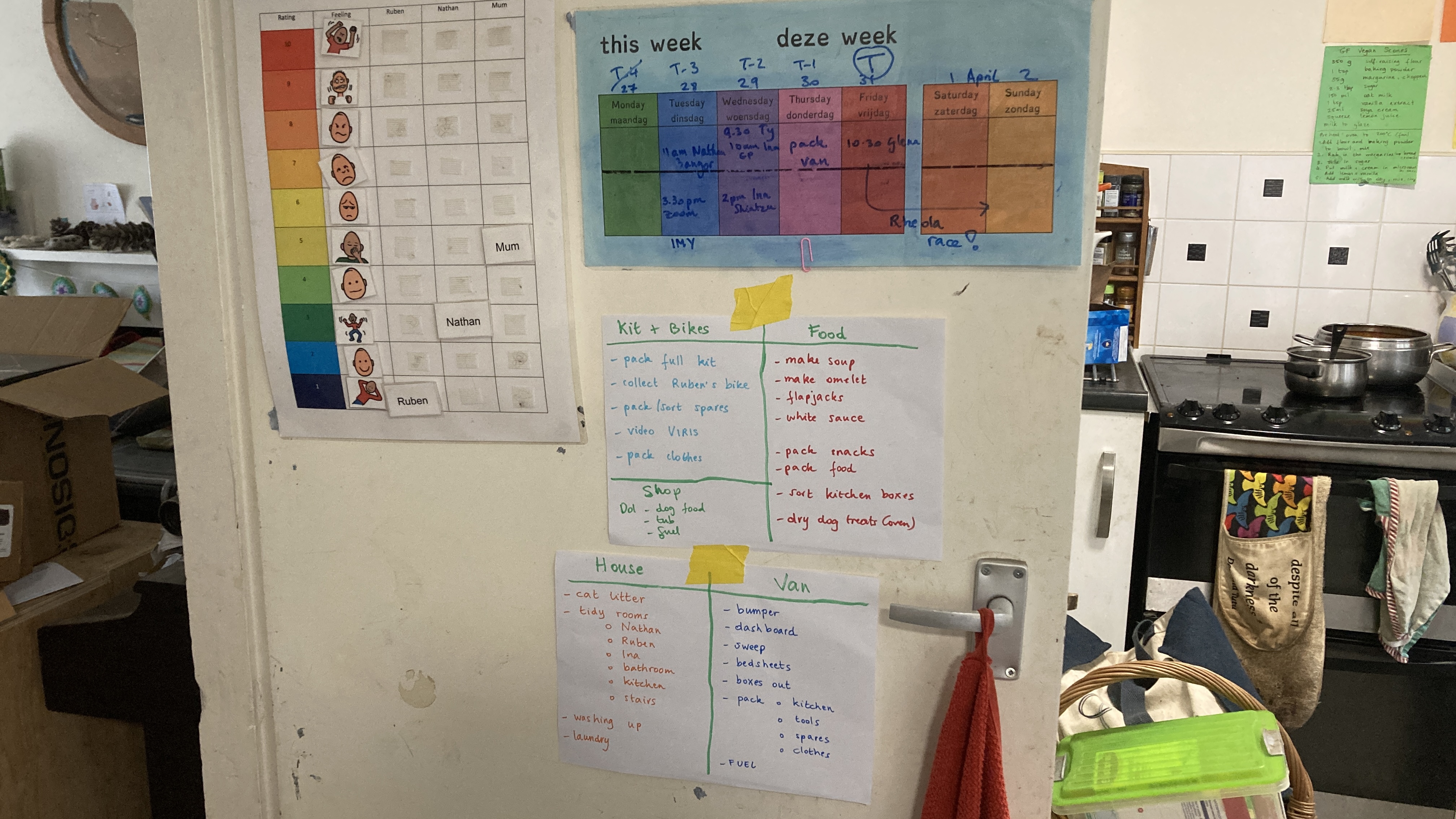 A laminated timetable for the week helps us visualise the days ahead, wipe off and start again when the week is over. A picture of a fully dressed downhill rider helps to remember all the things needed when packing for a day at the bike park. Nathan recently found a great hack to have all the kit he needed on race weekends: he prepares a clear plastic bag with all the kit needed for each day. Grab a bag in the morning and he won’t be rushing to find a variety of bits and bobs.