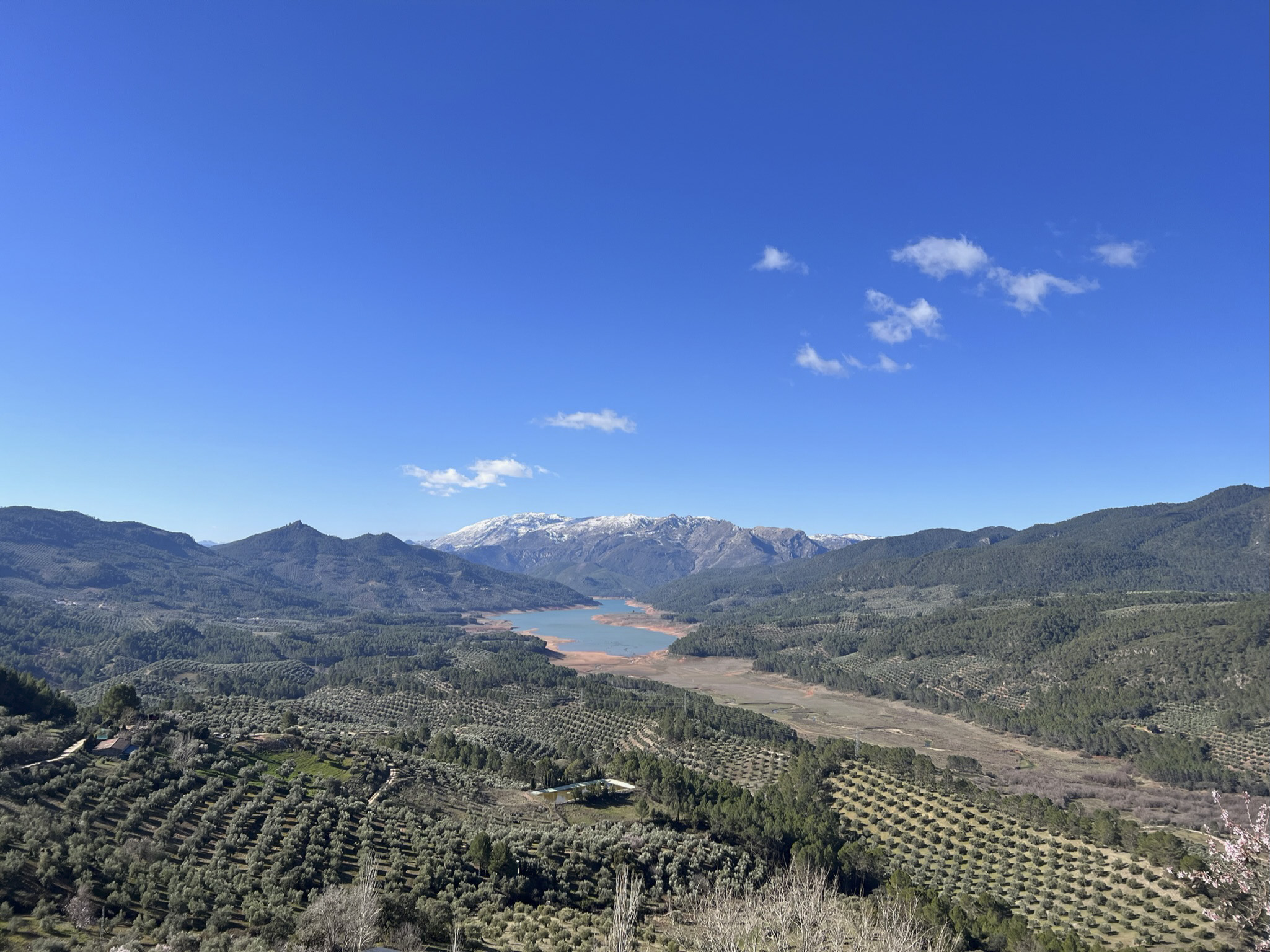The route is stunning from the moment we set off. To our left we have a view of a huge lake with an island in the middle – Isla Cabeza de la Viña, which translates to Vine Head Island. Beyond that the snowy peaks in Sierra Nevada, suitably distant from us. We stop at a shop for some onboard snacks where I find some biscuits made almost entirely of sugar, and finally some bananas. I haven’t managed to get bananas for days! The day feels like it’s going to be OK, the sun is shining, we’re warm enough and we have a rest day tomorrow.
