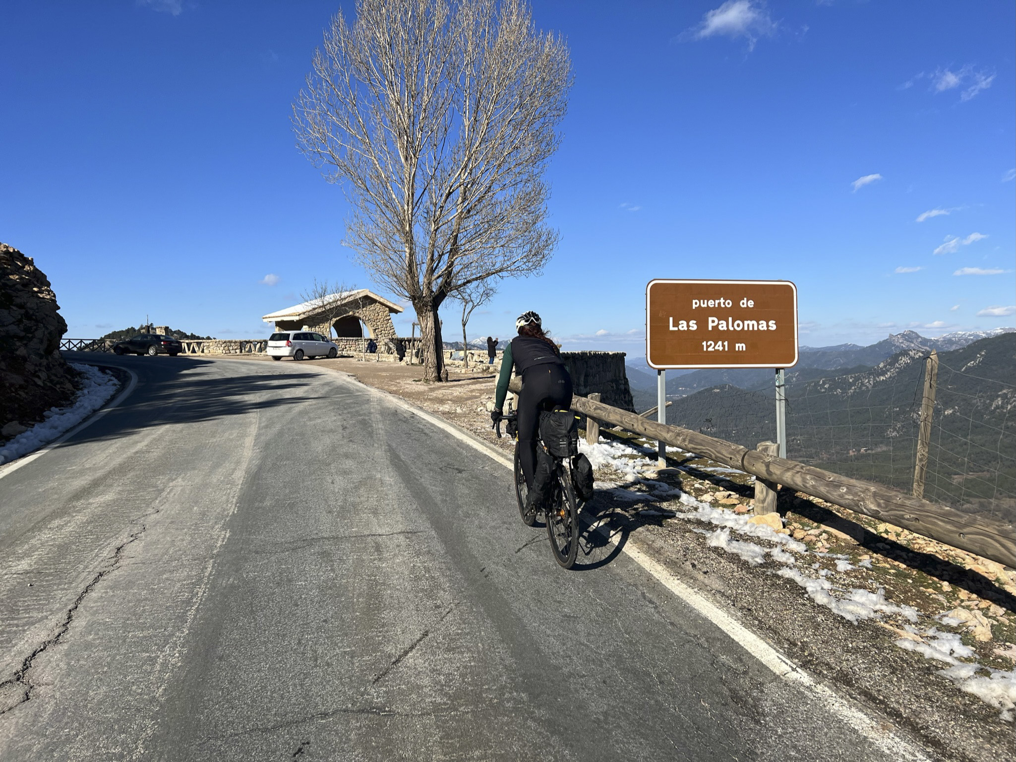 The aforementioned hill that we’re going up and over to get to Quesada is quite well signposted, as it’s more than just a hill. The Puerto de las Palomas is a road through two mountains inside the Sierra de Grazalema Natural Park with a summit of 1,241m. To my surprise, and no doubt Rhys’, I’m quite excited to pedal up this one. The energy in Arroyo Frio has given me a secure feeling, as if we’re in the right place and doing the right thing for the first time in days. To add to that, just as we set off on the climb there’s two bikepackers coming down with huge grins on their faces.