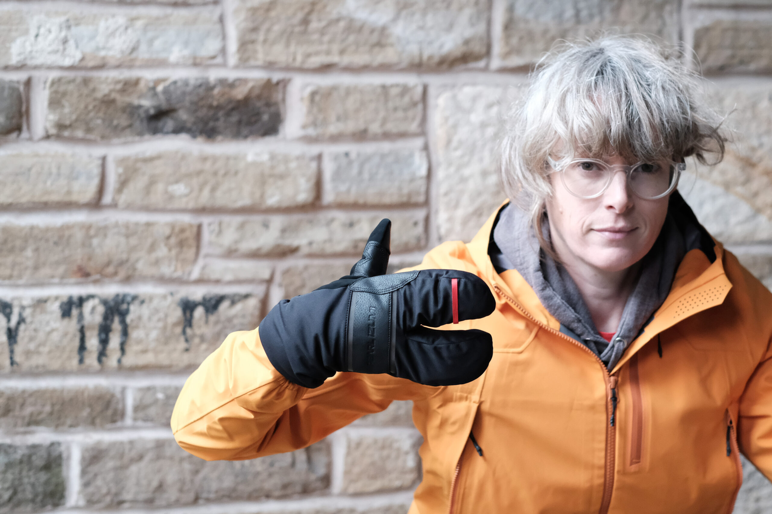 A new addition to Hannah’s claw-set: Primaloft insulated lobster glove with synthetic leather palm and gel padding. Touch screen compatible lobster claw. AmFIB Softshell outer fabric – we’ll be finding out how waterproof it is.