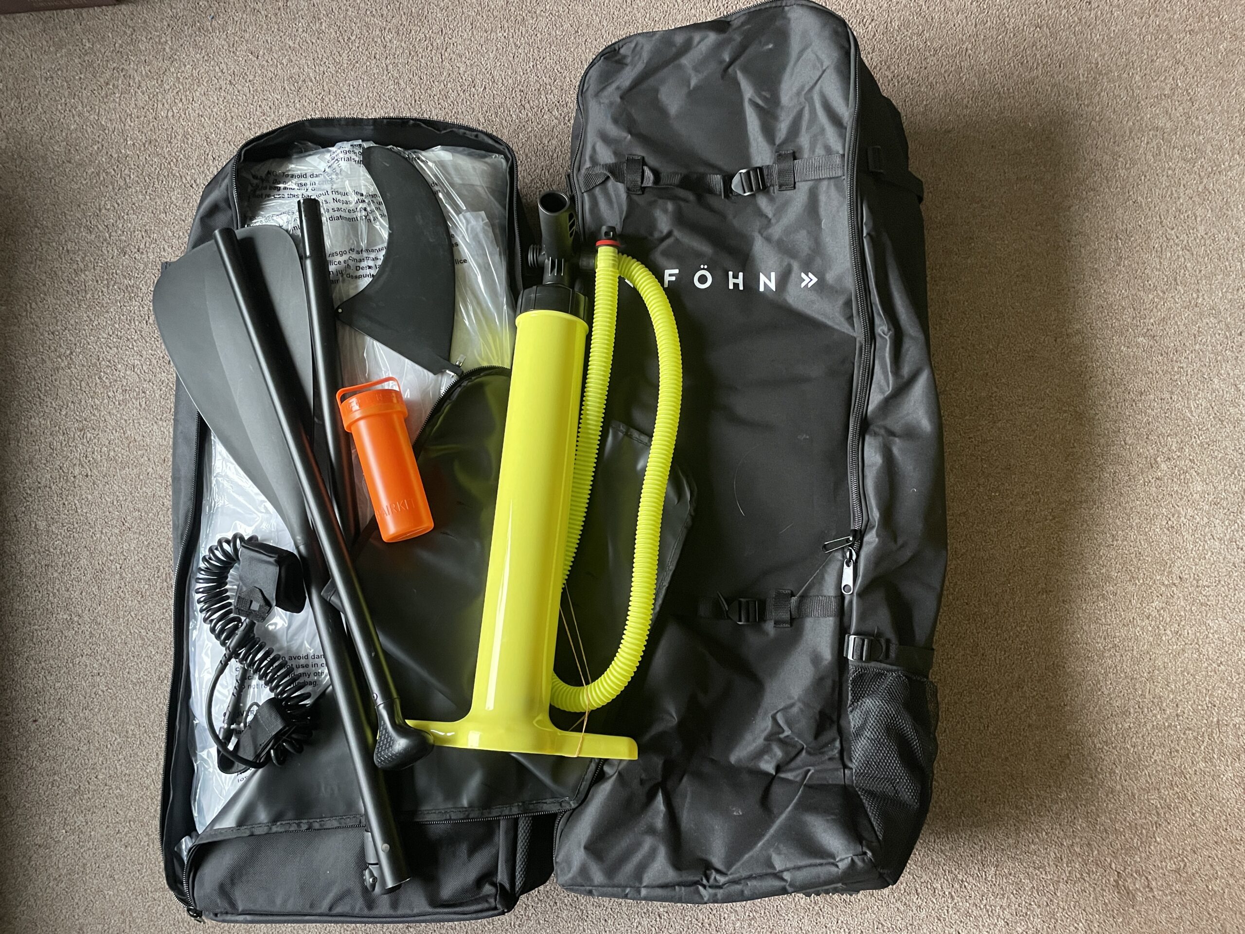 Hannah caved in to bargain pressure and bought two Fohn paddleboard sets. With the help of the Forum, she also found an OUTLET10 code that took another 10% off the price – see if that still works if you try and buy one. She’s gone for an ‘Adventure’ model in 11′ and 10’6″ lengths. She has no idea what she’s doing or whether she should have bought the ‘Fusion’ model. And as she unpacked these (mahoosive) bags she remembered she’s quite scared of deep water.