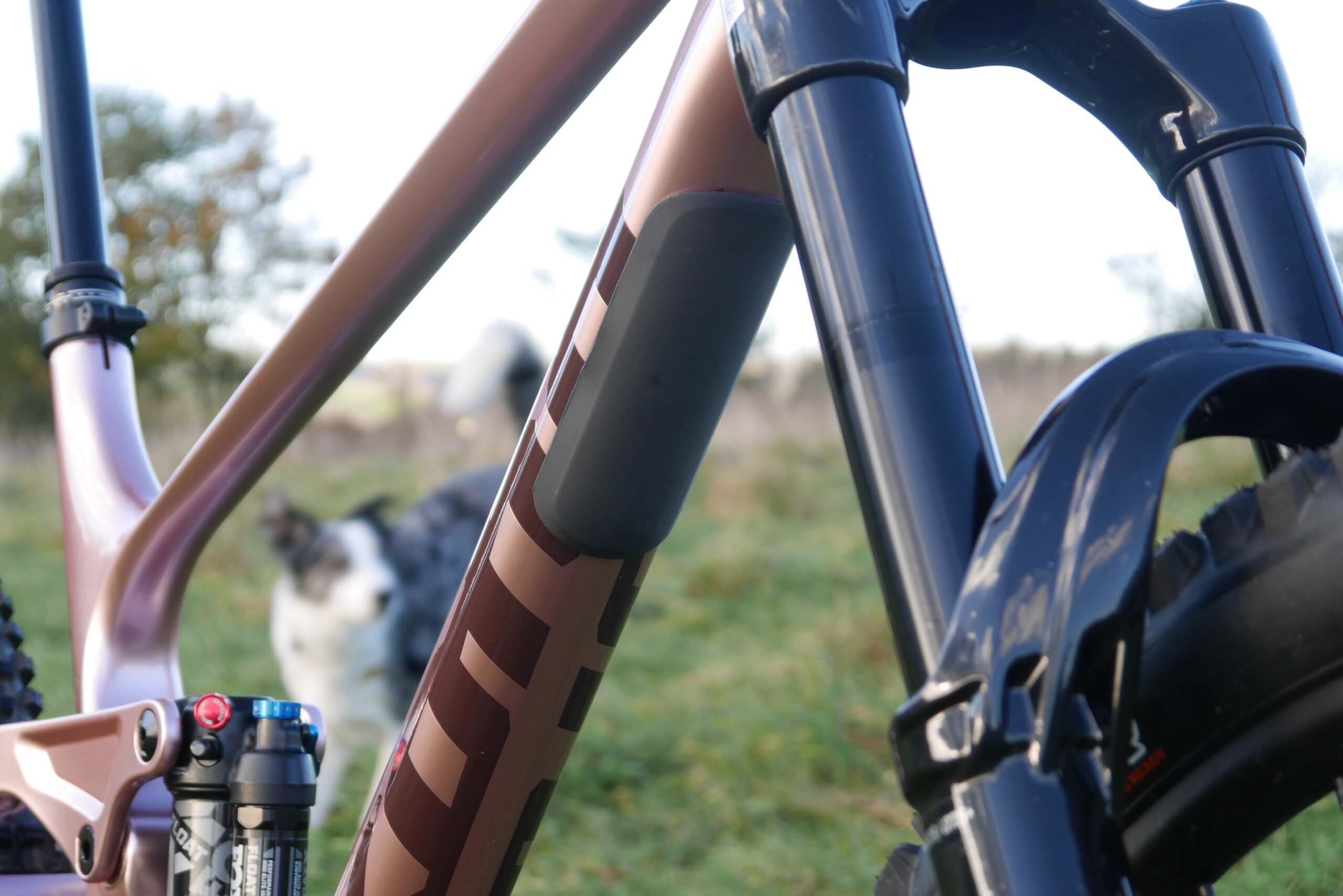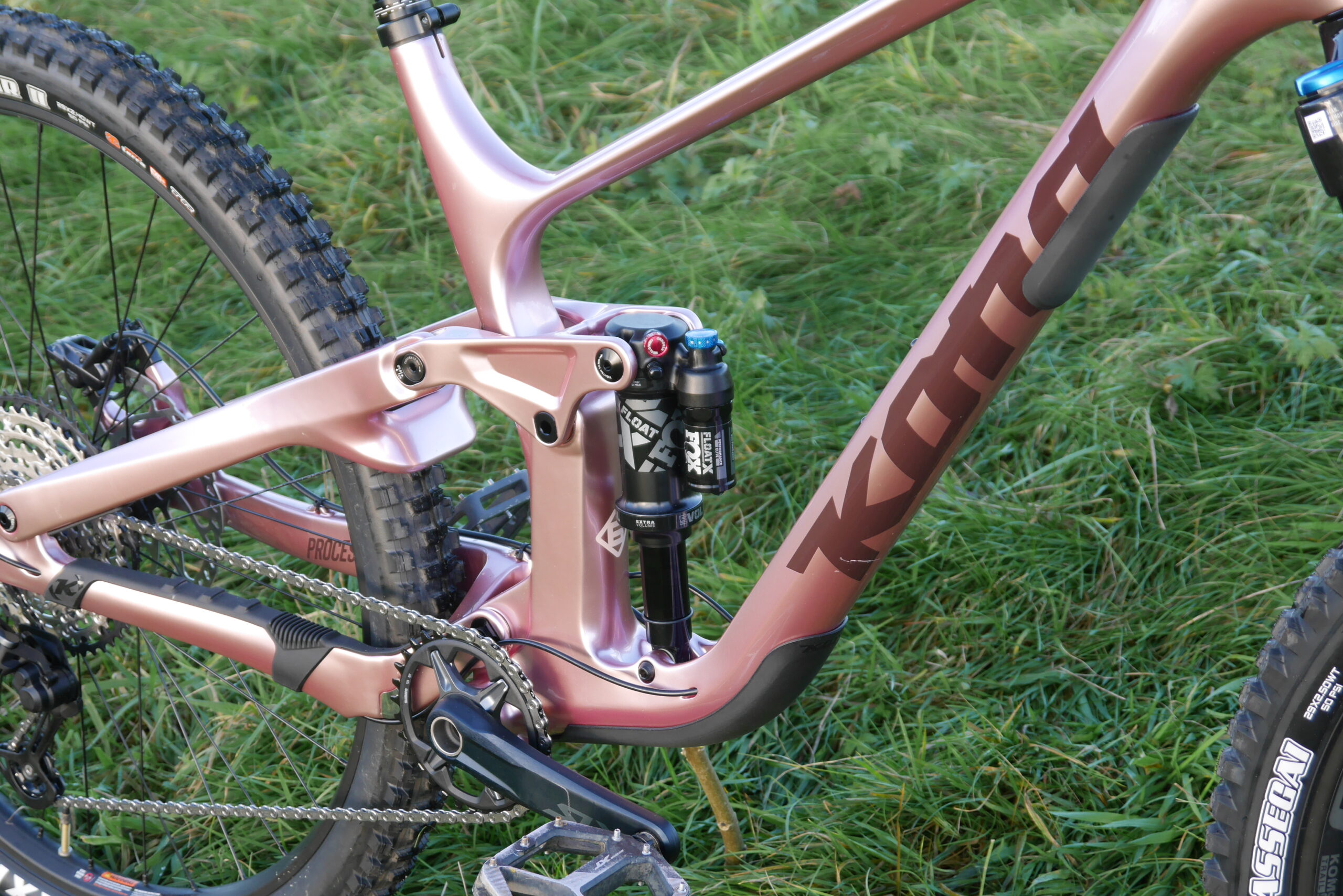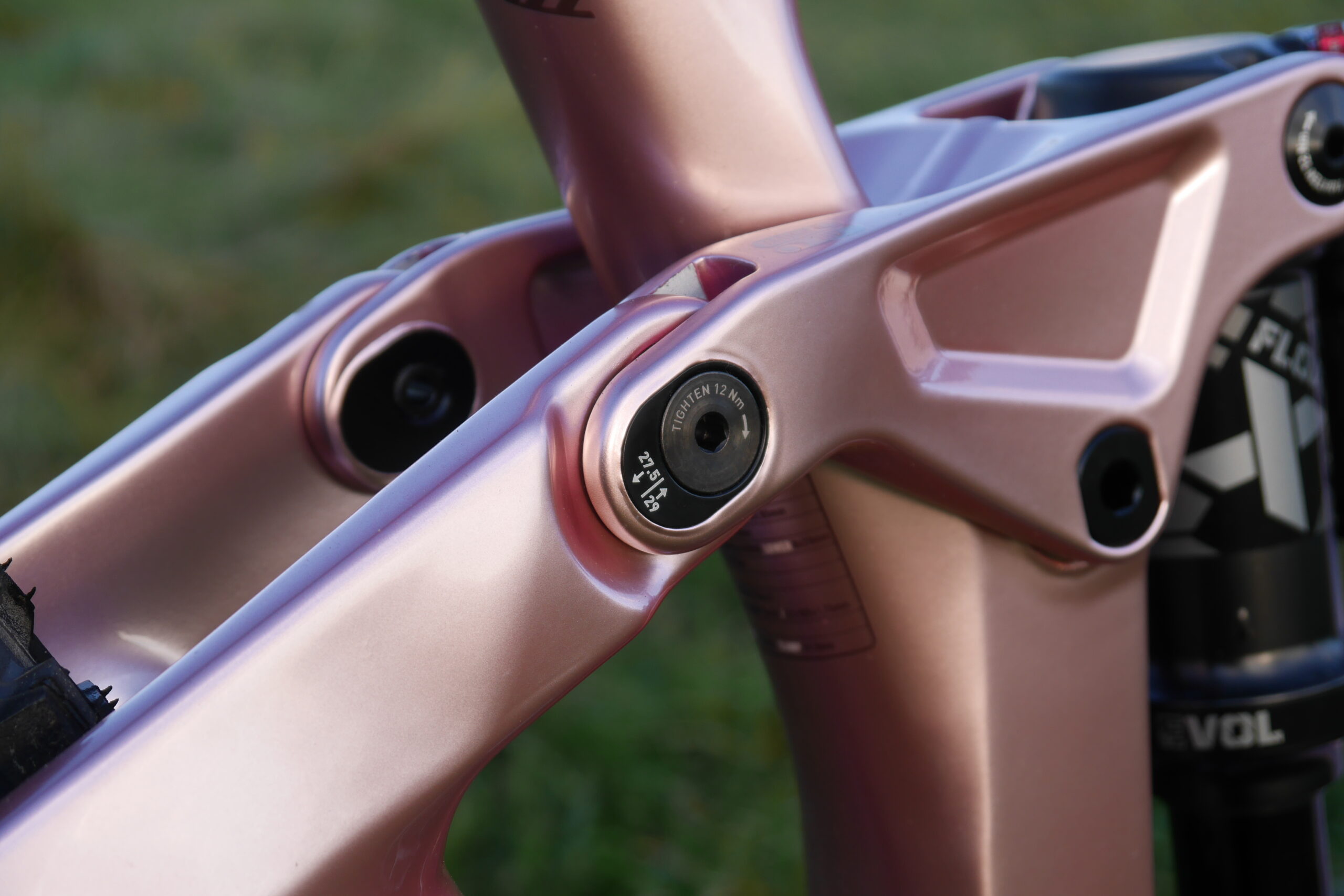 A big pink bike. It’s ‘gloss metallic dusty rose’ officially. With chocolate and bronze decals no less. And I [Benji] think it looks fabulous. Up to 162mm rear travel (we say ‘up to’ because the adjustable chain stay length must have an effect on actual wheel travel too, no?). Up front there’s a 170mm travel Fox 38 Performance Grip fork.