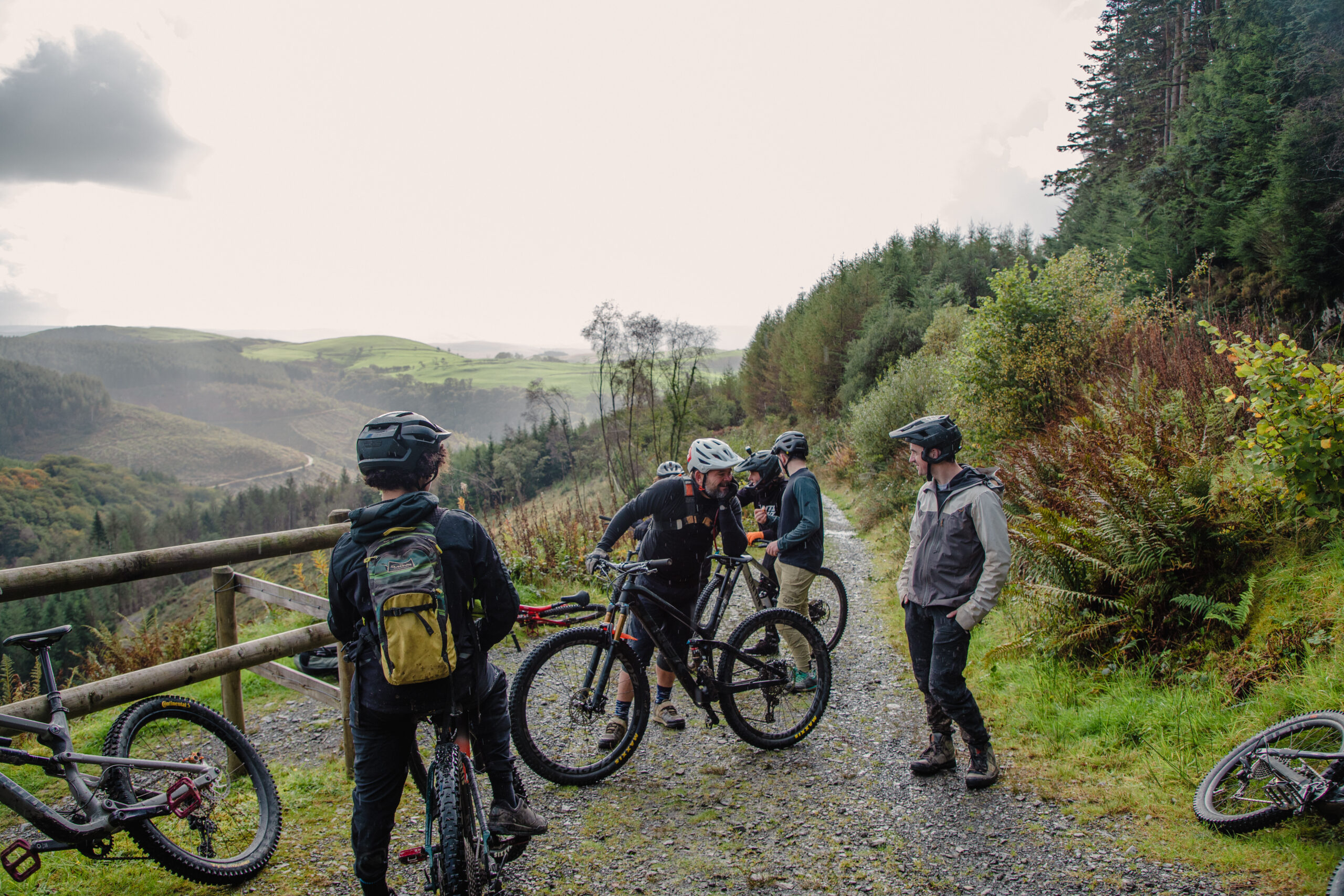 The rest of us stopped for a quick picnic lunch on the fire road, enjoying the wide-open views across the valley. This part of the forest was completely felled in 2018 but thanks to the tireless liaising from David Evans with Natural Resources Wales and the efforts of the Dyfi MTB volunteers, Dicko’s was rebuilt afterwards. It’s possible to ride the whole track and go back up from the bottom, but a few of us were starting to feel the climbs in our legs. Weighing up the balance between the extra adrenaline and the energy needed to head all the way up, we did only two-thirds. When we sat down to eat, a buzzard agreed it was time for lunch, catching the thermals up the valley to see what rodent snack was on the menu today. The first big shower of the day cut our lunch break short. The open views across the clear-fell came with a price to pay as the wind across the valley was cold. Time to get back on the bikes, for once we welcomed the climb to warm us back up.