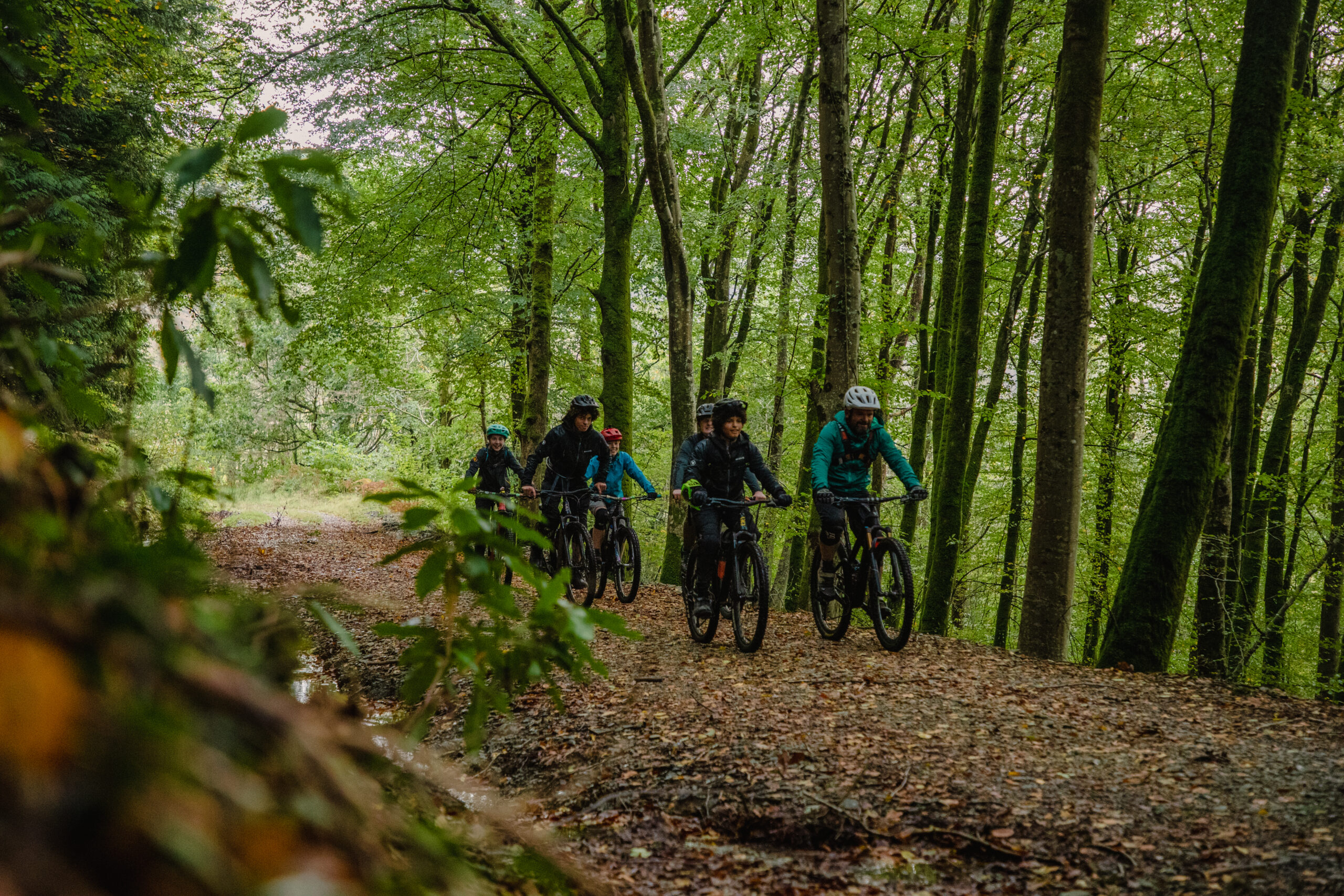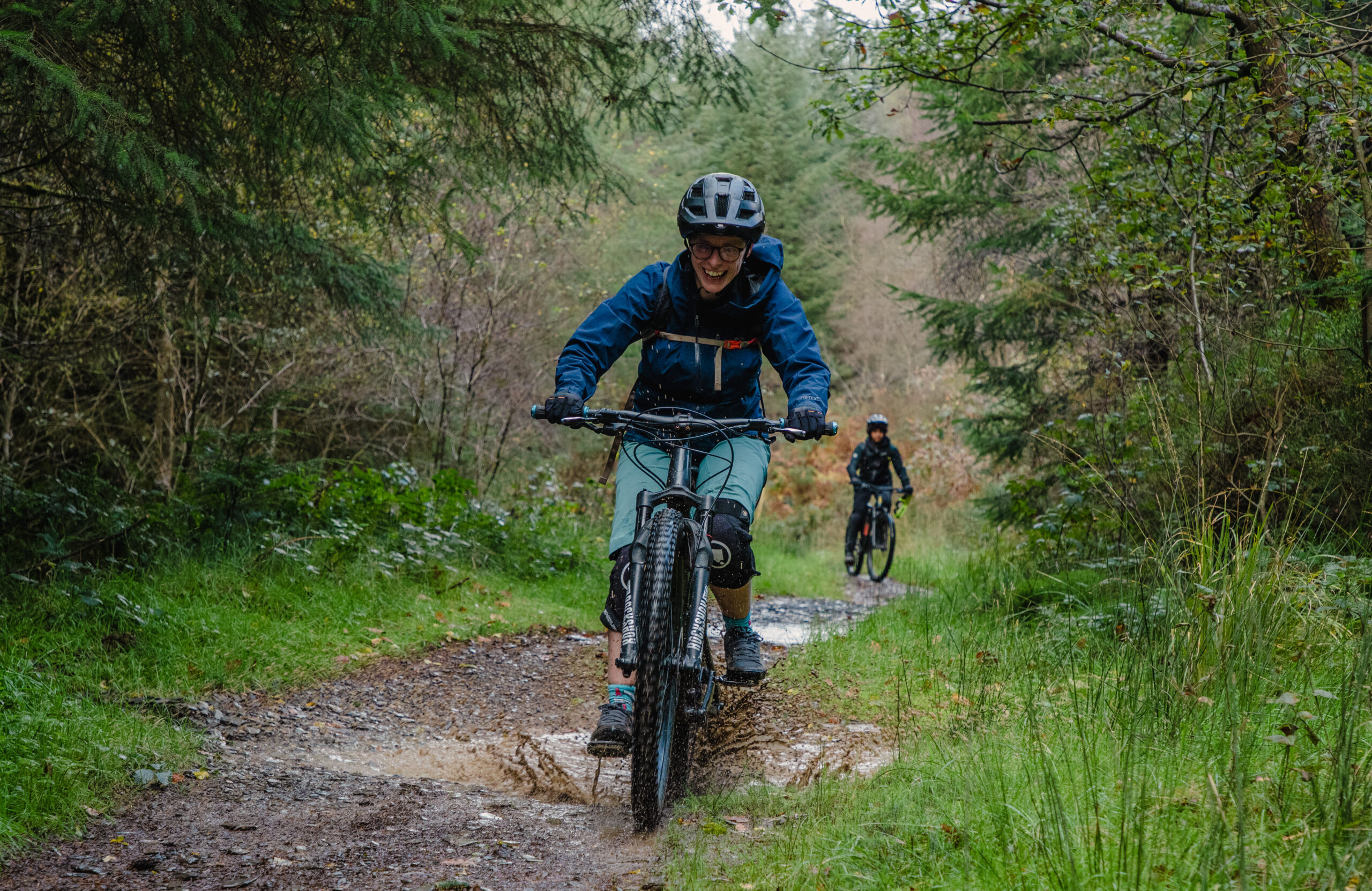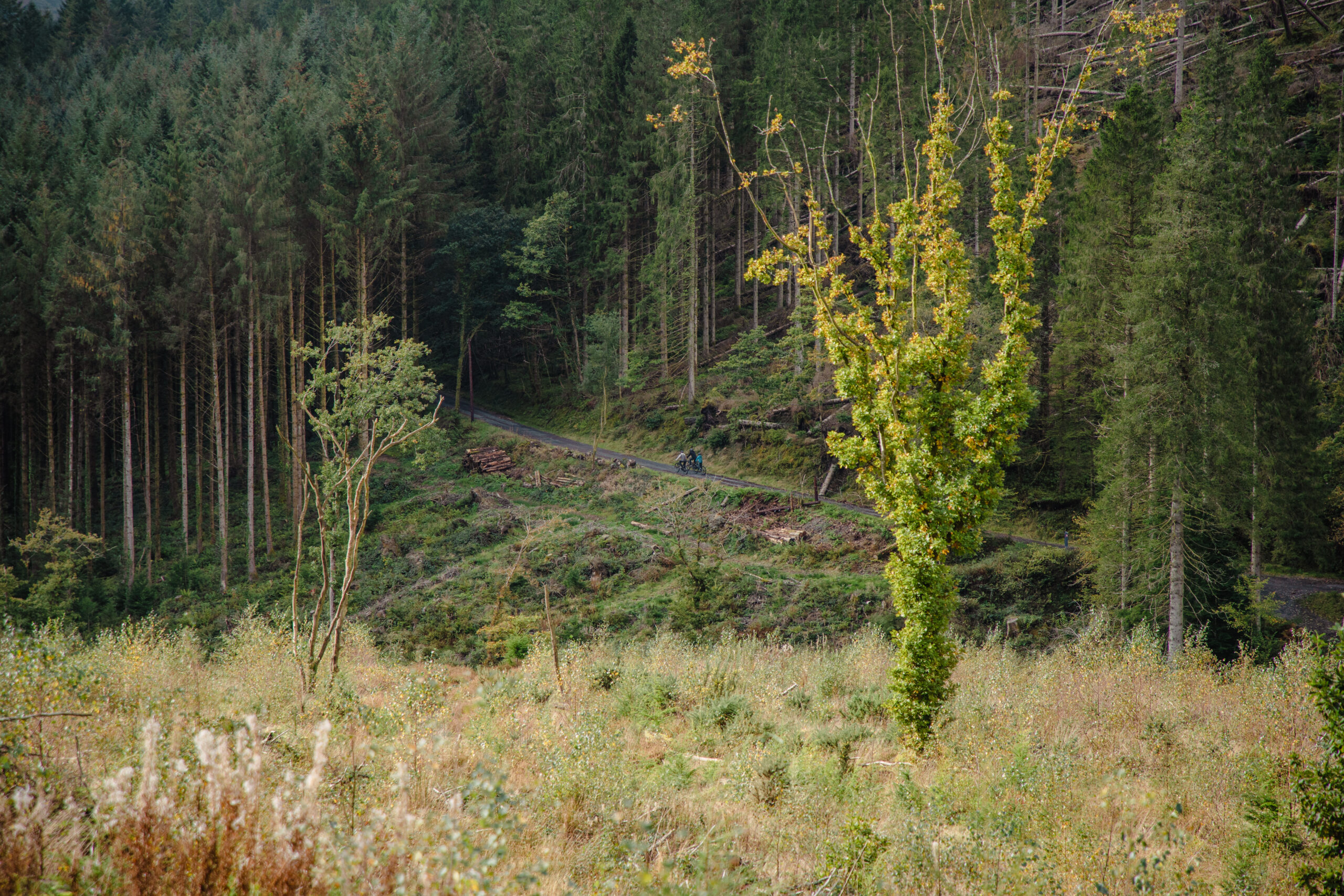 Va-va-voom skirts downhill around the valley on the edge between a section of clear-fell and the woodland above, offering views across the valley for most of the way before heading back into the woods. It’s not steep but you soon carry a fair bit of speed, enough for the young guns to get airtime on the small rollers. I spotted a variety of mushrooms on the side – it was a shame there was no time to stop to pick an evening meal of ceps and chanterelles. The track ended in a few big puddles waiting for a splash. Who doesn’t love splashing? Turns out a few of us, not just Nils who unsurprisingly opted to ride slow through the puddles to protect his camera equipment. By this time my bum was wet anyway… I hadn’t been one of the sensible ones who put waterproof trousers on.