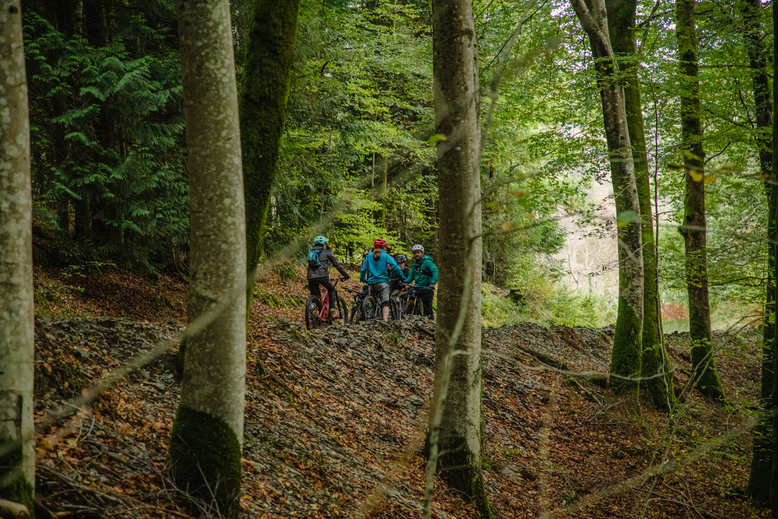 The forest road brought us through a beautiful section of deciduous woodland, a welcome change from all the conifers. Ruben and I admired the beech trees covered in thick moss from roots to crown, looking for faces in the shapes, while we pushed up the hill, a little bit behind the rest of the group. A bunch of friendly motocross riders coming down the road told us the top of the hill wasn’t far off. We had heard the noise of their engines before and knew to be careful. Some MX riders are quite cheeky and zoom up or down the mountain bike trails but most of the Climachx sections have barriers across the start to prevent accidents occurring.