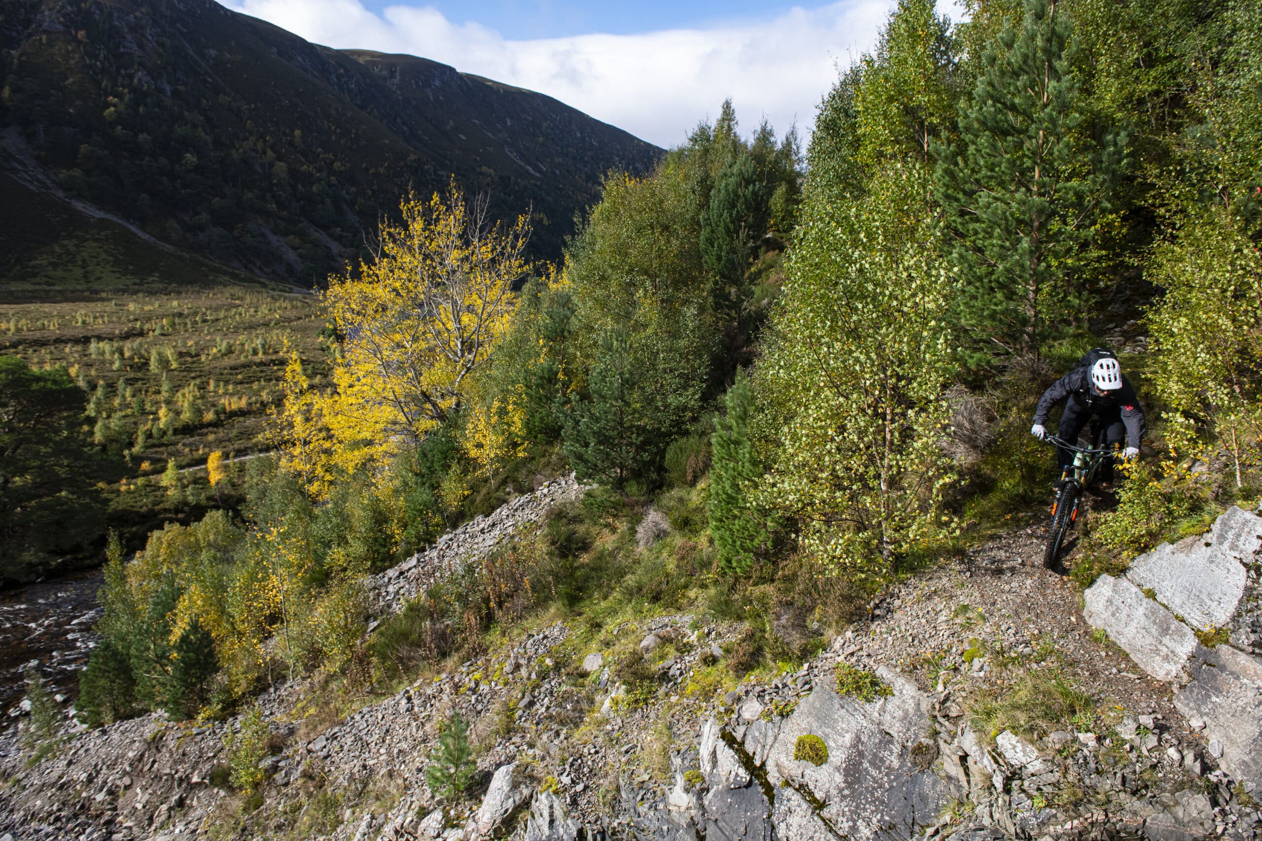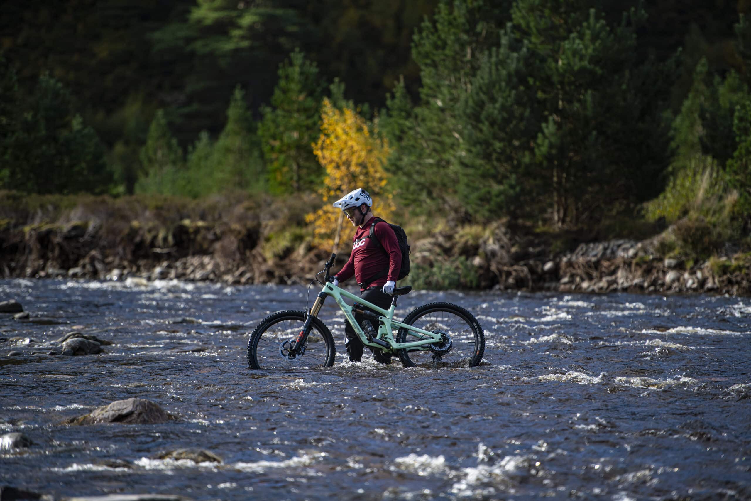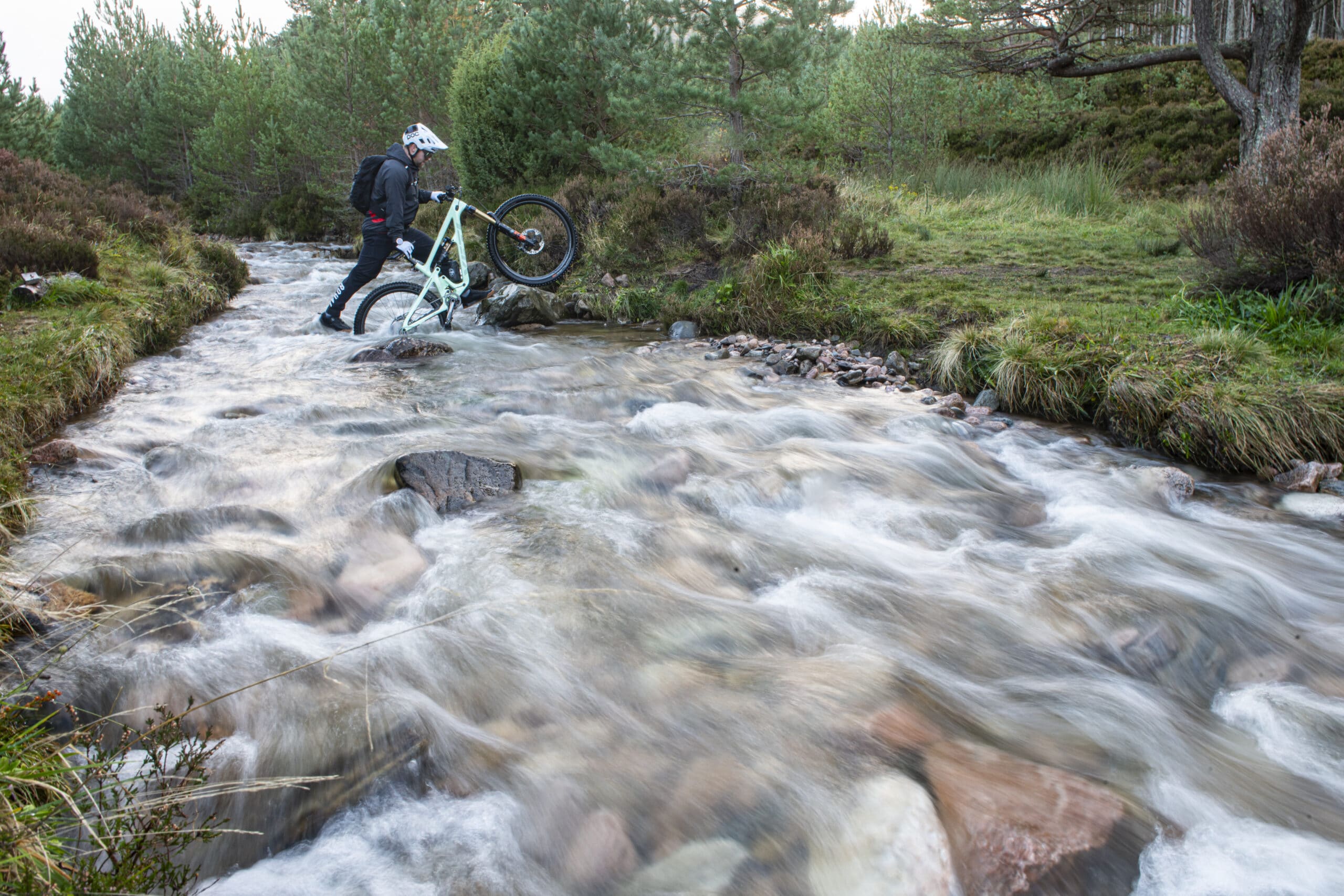 Iād be meeting mountain bike guide extraordinaire Chris āThe Bearā Gibbs where the tarmac fizzles out in Glen Feshie to make our way to the pools high on one of the River Speyās bigger tributaries. The added bonus of this is taking in the regenerating landscape thatās benefiting from the rewilding efforts going on here. Part of this regeneration includes removing any infrastructure put in to alter or manage the watercourse, but also extends to deer management, removal of non-native tree species, bog regeneration, seeding of high alpine flora⦠The works. Everything that goes into returning the land to what it would have looked like before the Industrial Revolution. This is part of the 200-year vision of the landowners, the Povlsens. In fact, my pal Ronan, a handy rider in his own right and Conservation Assistant at the outfit tasked with delivering this vision, was due to join us or meet us en route but was on the far side of this sprawling estate attending to reports of a group of stags that had made their way through the boundary fences. Removing deer from the estate has allowed saplings to thrive unmolested wherever the seeds may have fallen.