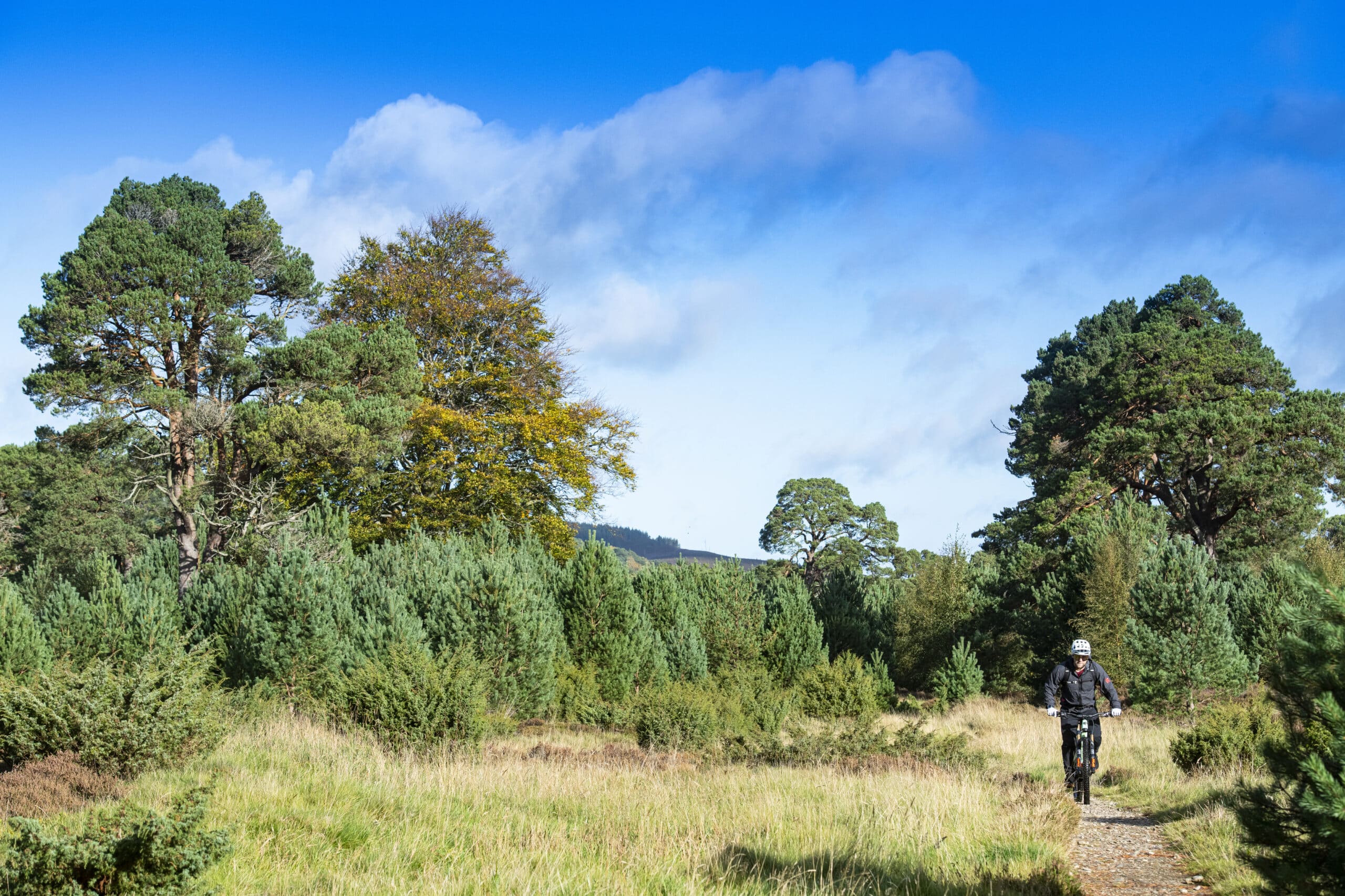 āFord the river?ā, we say almost simultaneously, as we retrace our steps, looking for a suitable spot to cross. The river here looks low but has plenty of power in it, and many of the larger rocks have been undercut during the previous weekās swell. Slow and steady wins the race. Thankfully, the flood waters have cleared a large area on the bank that we can ride along, making the most of our access rights. Here, Scots pine saplings make the most of the lack of deer and litter the river bank as their great-grandparents loom over them.