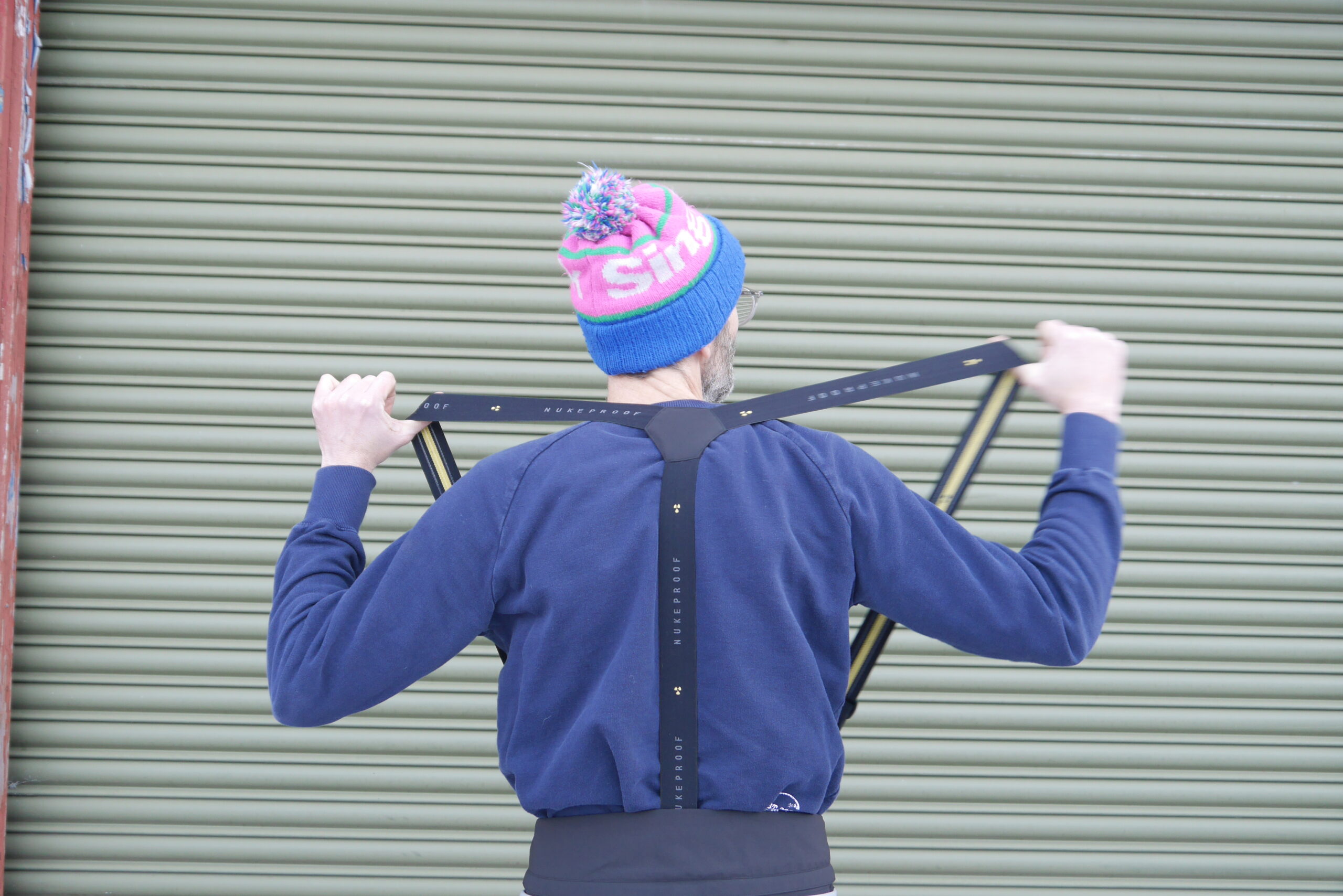 Not a onesie. Not a pair of dungarees. The Dirt Suit is essentially a pair of trousers-with-braces that zip on to a jacket. But the zip is only across the top of what is known as “the arse”. Thus, you can wear each garment separately. Or you can go the whole muddy hog and zip them together via the aforementioned “dirt skirt” to really keep the filth out.