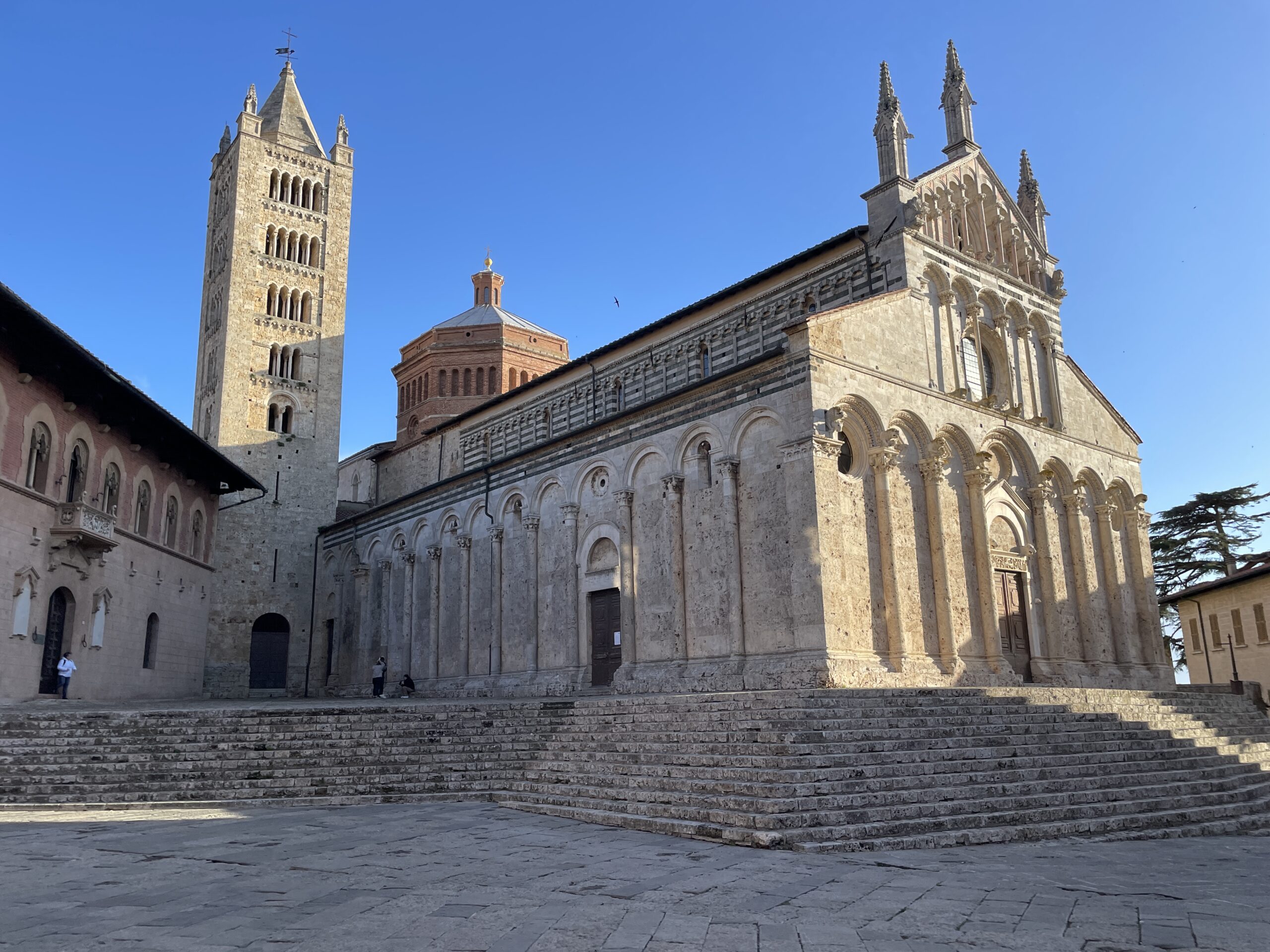 The autostrada begins to disintegrate as the houses get posher. A 90km speed limit sign is followed immediately by a sign warning that the edges are crumbly. The landscape gets hillier, in an unfamiliar way. There are lots of pointy hills, sprouting up from the land below. Or were they dolloped there like butter icing that never got smoothed out? Suddenly everything feels very Italian. There are vineyards, some old with aged stalks like knurled fists on thick arms raised to the sky. Others are young, delicate stalks with years of growth ahead of them. Strange mushroom-like fir trees are everywhere too, with no lower branches, just a brush head of piney spikes up the top. Lollipops of blossom on similarly bare stalks are planted in evenly spaced rows, and the landscape is punctuated by slim and pointy, dark green Italian cypress, like leylandii with manners. Atop many of these hills are ancient-looking villages – citadels perhaps? – each with some sort of fortified or tower-like central building and old towns clinging on to their skirts. I wonder whether the previous inhabitants of this area were perhaps a bit fighty.