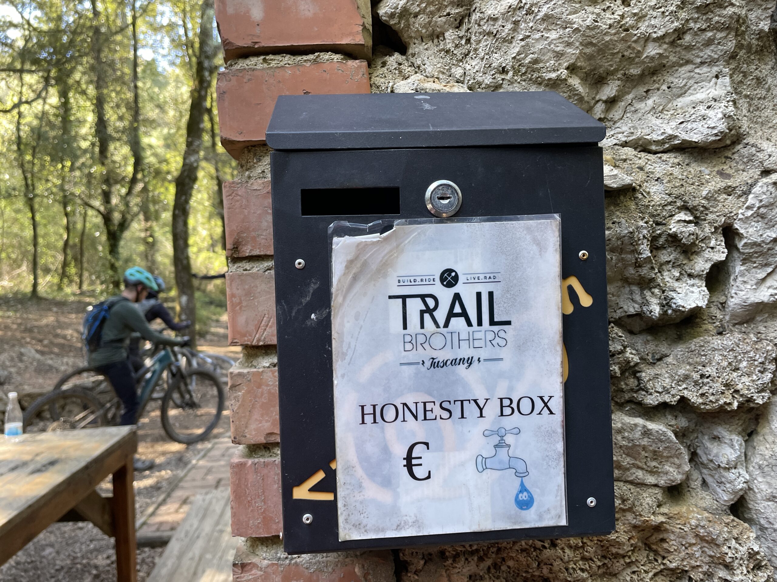 The trails here are open all year unless there is snow. There are some individual trail closures during hunting season from 1st November to the end of January, which are agreed between the hunters and the Bike Service crew. All the trails are free to access, but of course, Bike Service Massa Marittima would be happy to take your money. You can hire one of their fleet of Canyon bikes (electric or otherwise, mountain or otherwise), make use of their rather gorgeous bike shop that nestles below the ancient town square, or go all-in with a guided ride or uplift day on Monte Arsenti. Even if you’re totally independent and happy to fend for yourself, signs around the hillside and the Trail Brothers’ cabin in the woods invite you to make a donation to help with trail maintenance. I find myself hoping that one day such donations may result in a toilet – out here, there are only bushes.