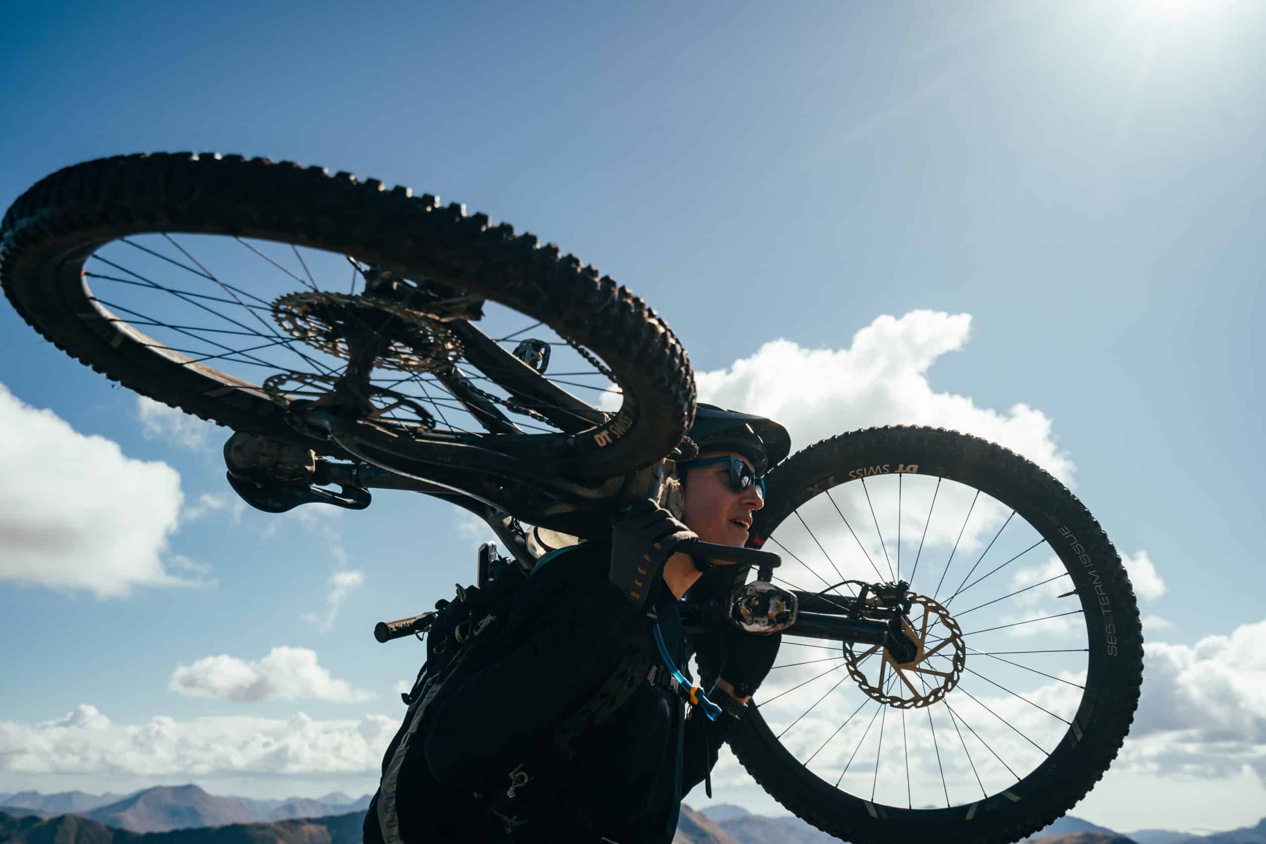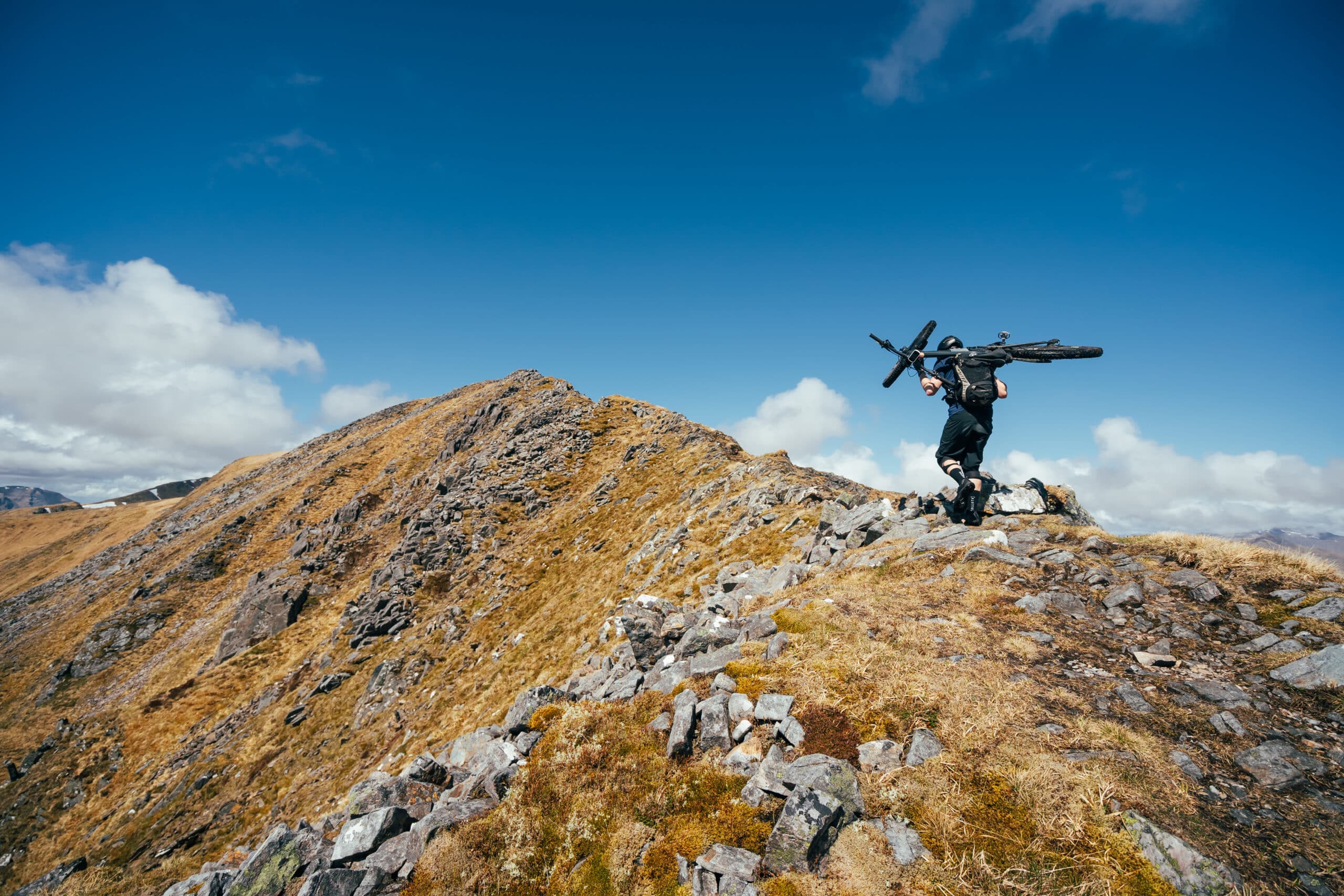 Descent one ticked off and in the bag, the trail levels to a brief scramble across a narrow, heavily exposed section of the ridge that does very little to quash our mood. In fact, Luke and I revel in the precarious nature of the traverse – it makes a change from the usual dreary trudge of a regular hikeabike. Bikes fixed firmly on our shoulders, we quickly gain our second summit and Munro of the day – Druim Shionnach. We’ve been ‘riding’ for about three hours, and after the slow initial climb onto the ridge, we’re now moving fast and feeling optimistic.