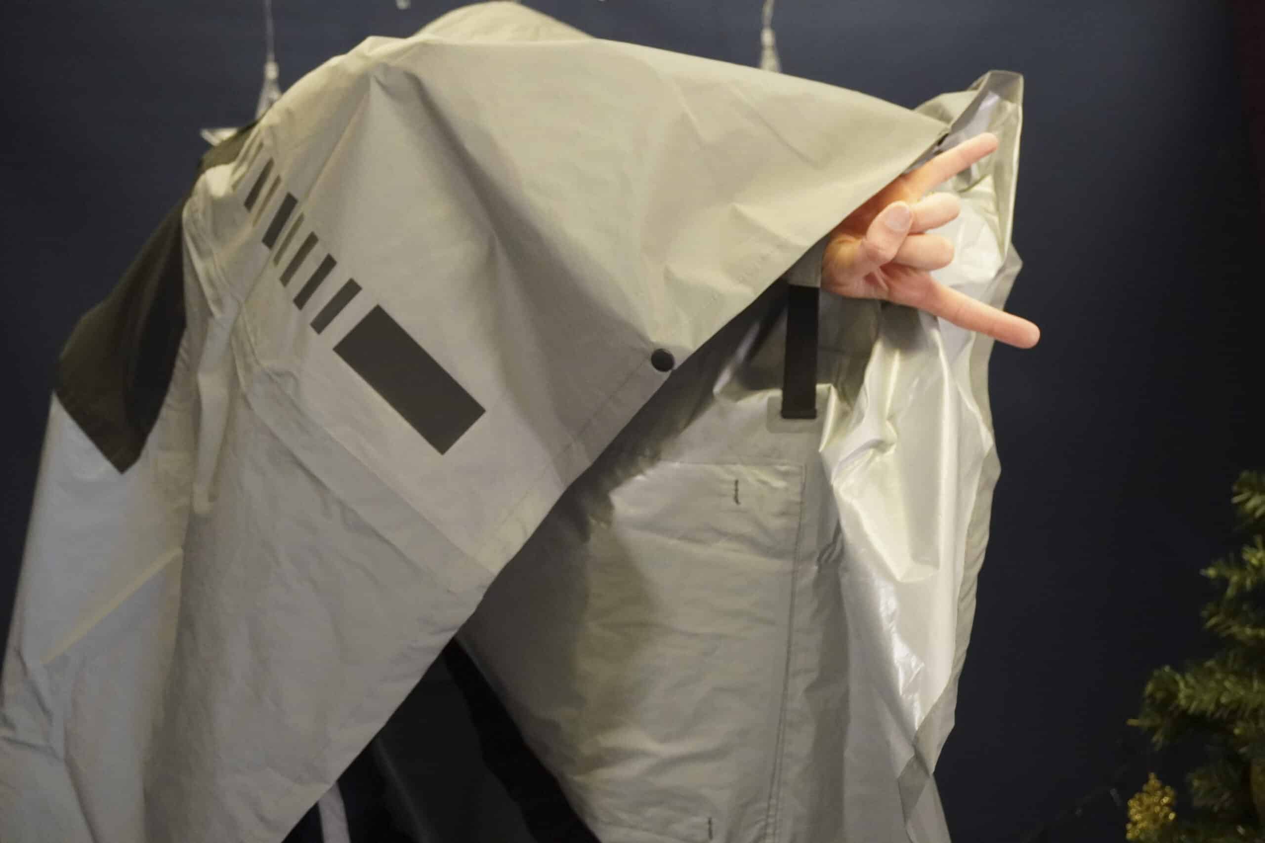 Poppers along each side form the sleeves, and for an on-bike fit you adjust them accordingly. There are wrist straps to hold the poncho down at the front, a waist belt to avoid flappage, and blocks of darker fabric that should make you appear more human to traffic, as your head will be reflective and there’s a line down your back to indicate your position.