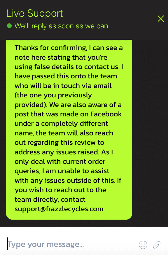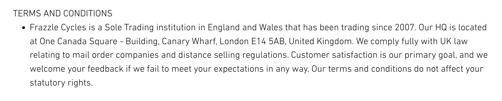 We received a tip from a reader that Frazzle Cycles is a scam site, possibly created by the same people as the Bicycle Company UK – and having looked into it, we’re inclined to agree it’s a fake. Both Brompton and Trek – who have bikes listed on the site – have confirmed that they are not part of their official network of dealers. In addition, there’s no registration at Companies House, no VAT registration number on the site, and the website domain was only registered a couple of months ago. There’s also a Facebook page – created in December last year. All a bit fishy.