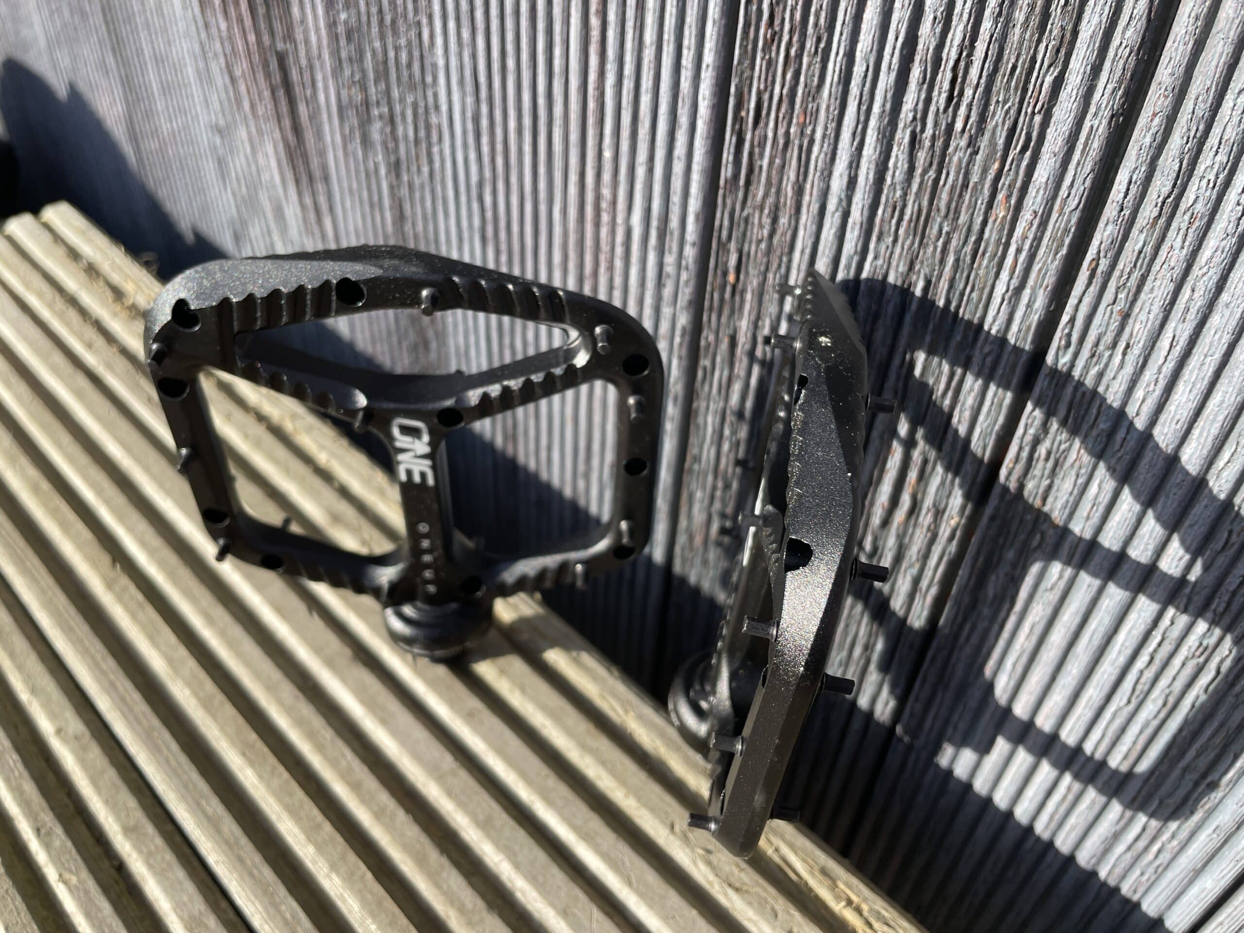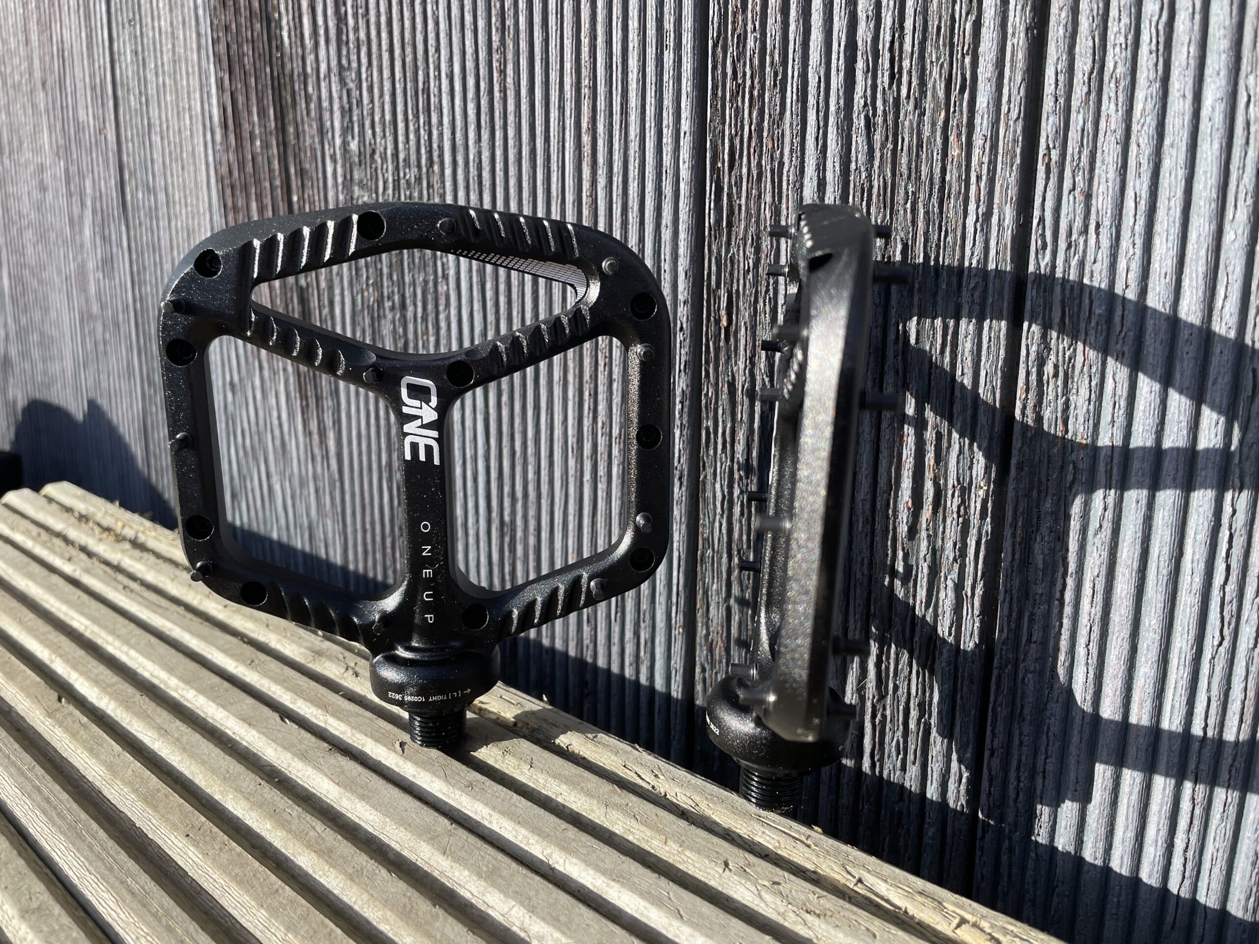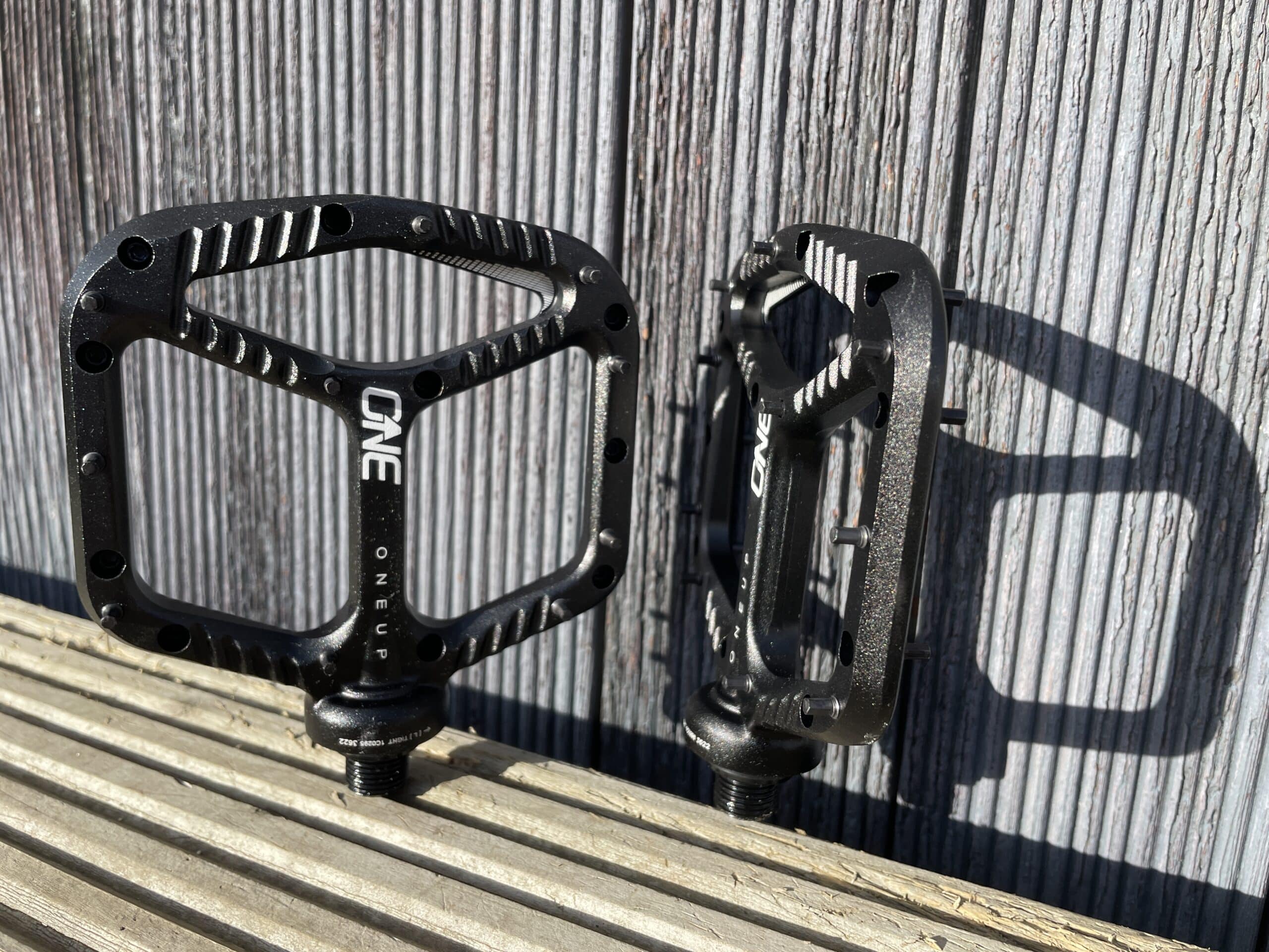 Thin pedals tapering between 8mm and 12mm in thicknesss, 115x105mm body, with 10 hexagonal pins on each side, with a few spares in the box. Chromoly steel axle, aluminium body, available in six colours. Largely unchanged (apart from the price) since they got the ST Recommended award in our 2018 One Up Aluminum Flat Pedal review, but now compatible with SRAM carbon cranks & cranksets with recessed pedal inserts.
