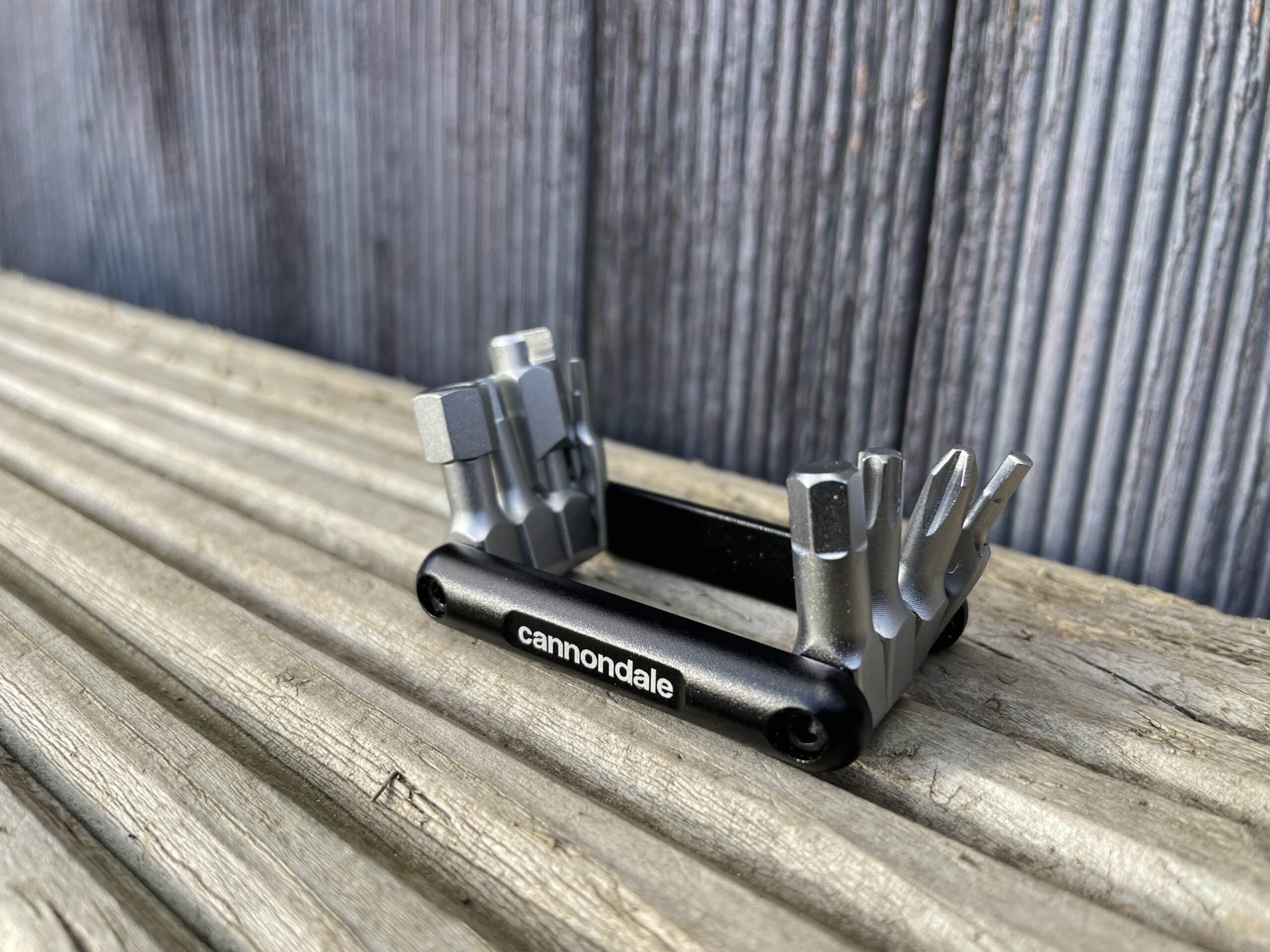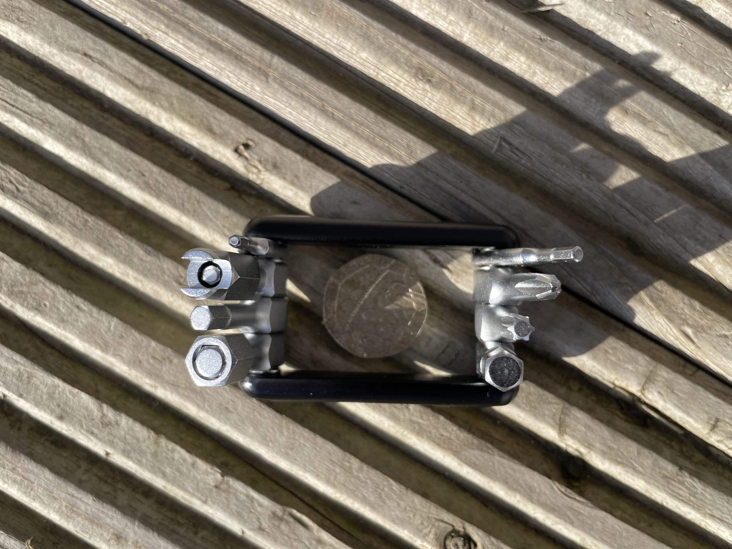 A teeny tiny multitool with a 20p for scale. Has Hex Keys 2 | 2.5 | 3 | 4 | 5 | 6 | 8mm | Torx T25 | Phillips #2 and a Valve Core Tool. Very handy indeed. So tiny, Hannah will probably have to paint it with bright nail varnish so as not to lose it.