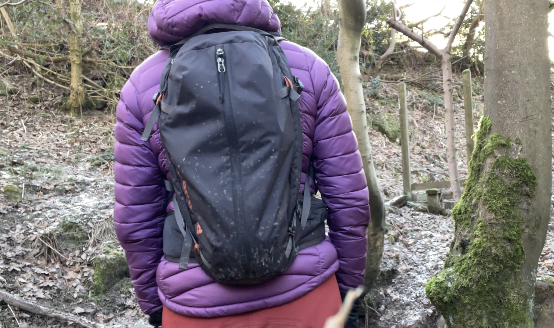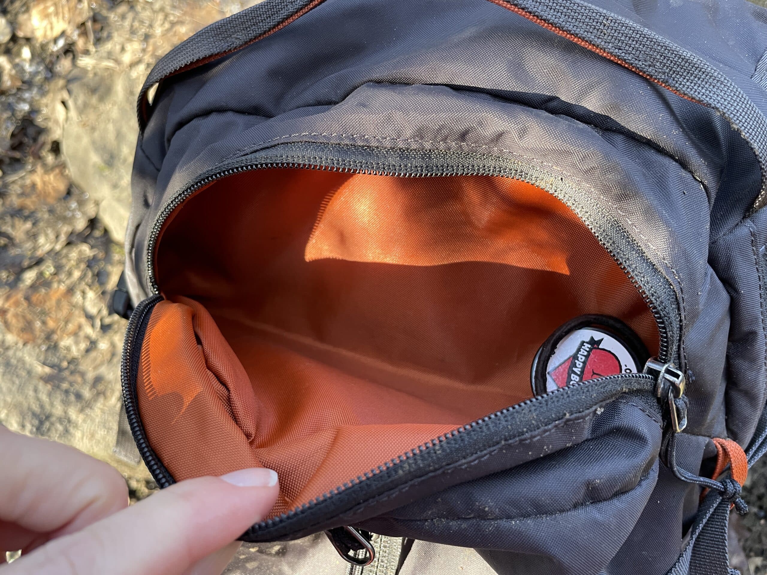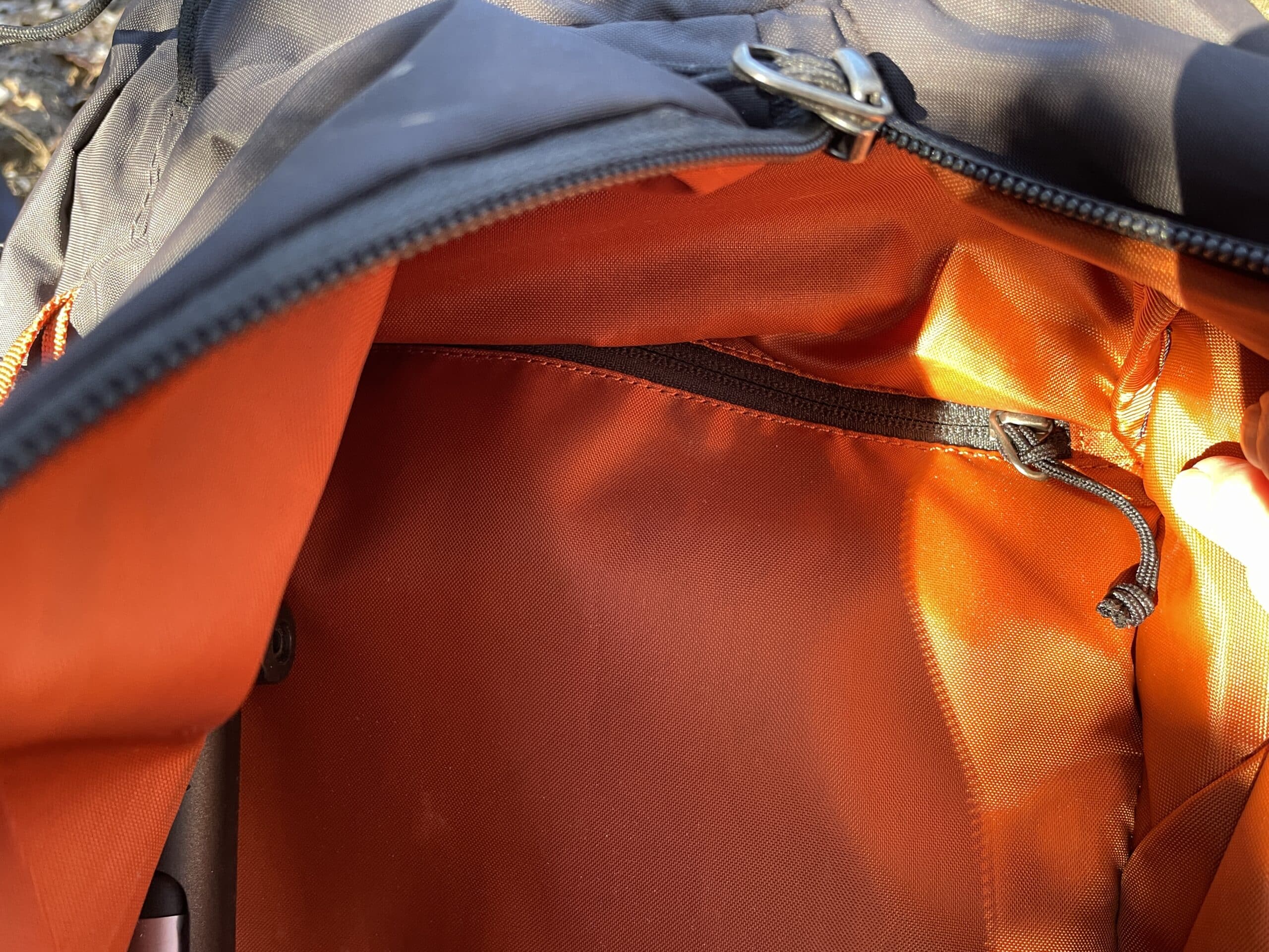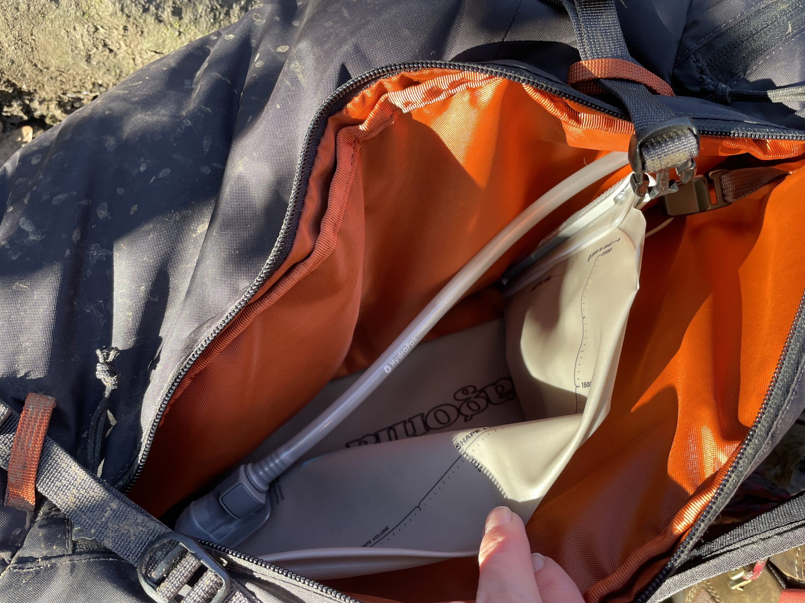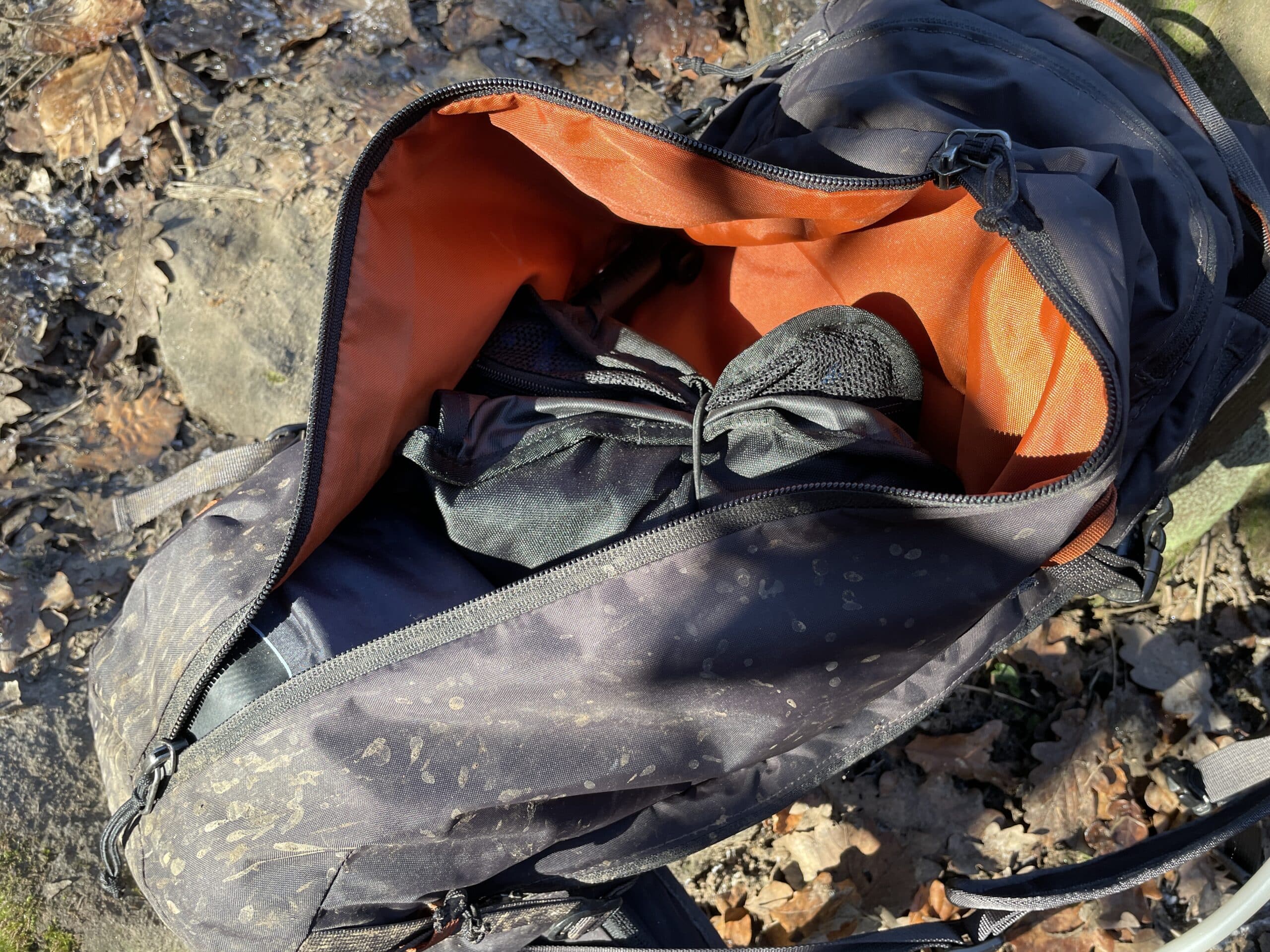 Here, the big central zip comes into play. On the one hand, it’s easier to access what’s lurking in the bottom of the pack because you’re not having to mine your way down from the top. And you can see things against the contrasting terracotta inner fabric. On the other hand, if it’s bogging it down with rain, you’ve now opened up your whole pack to the elements.