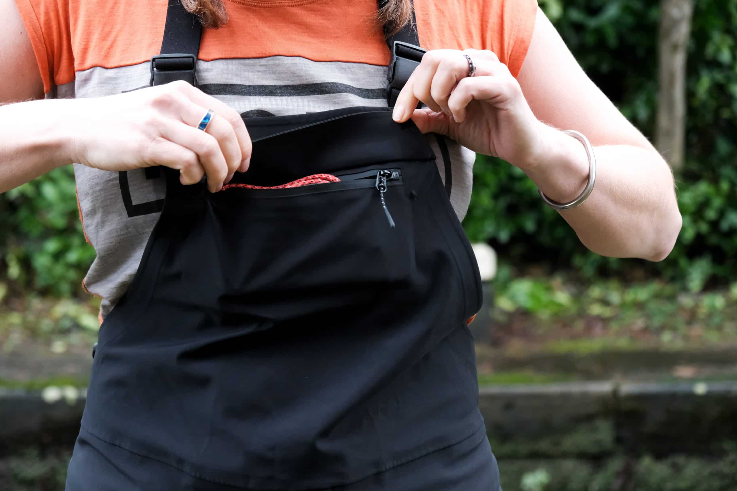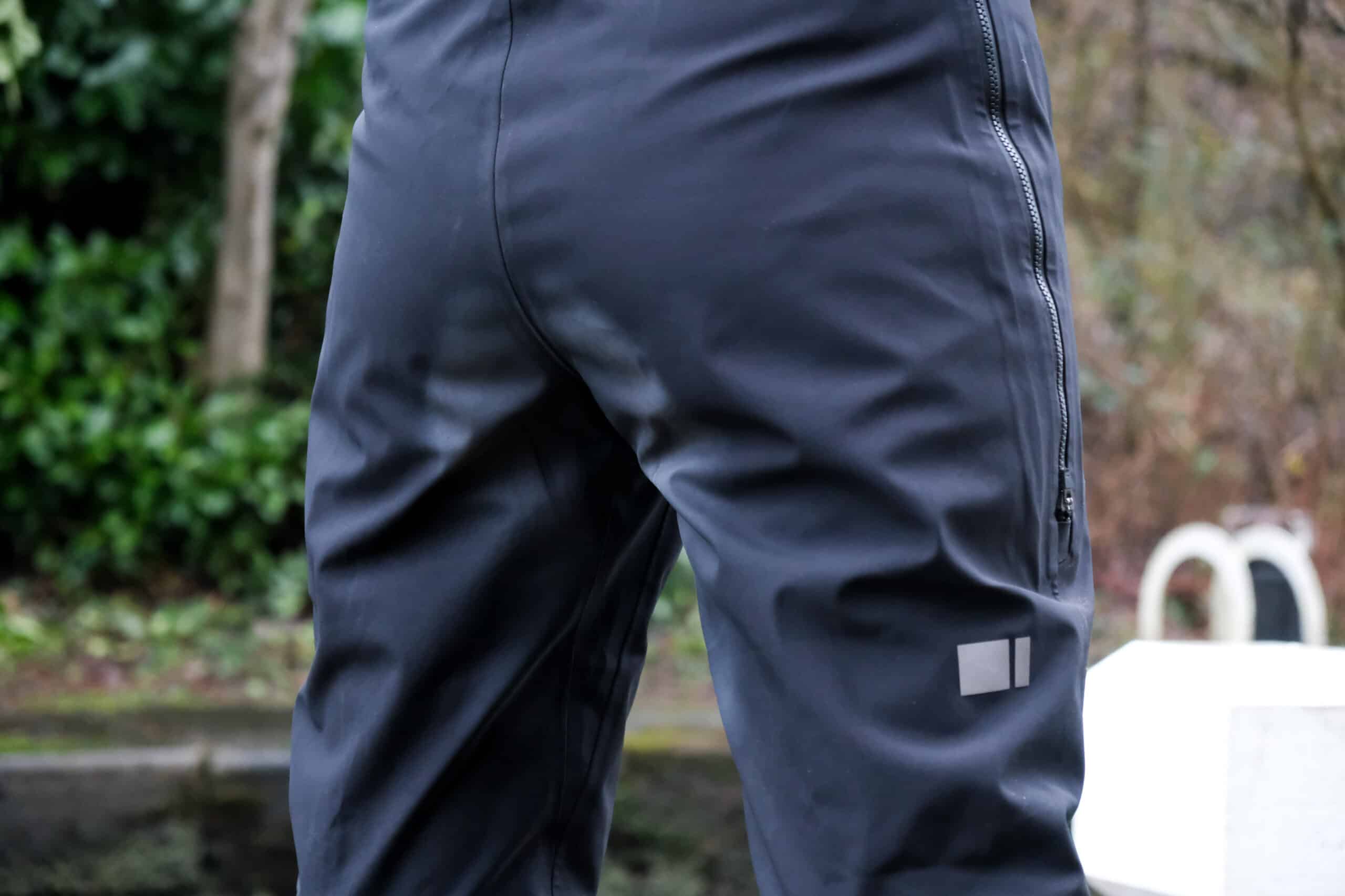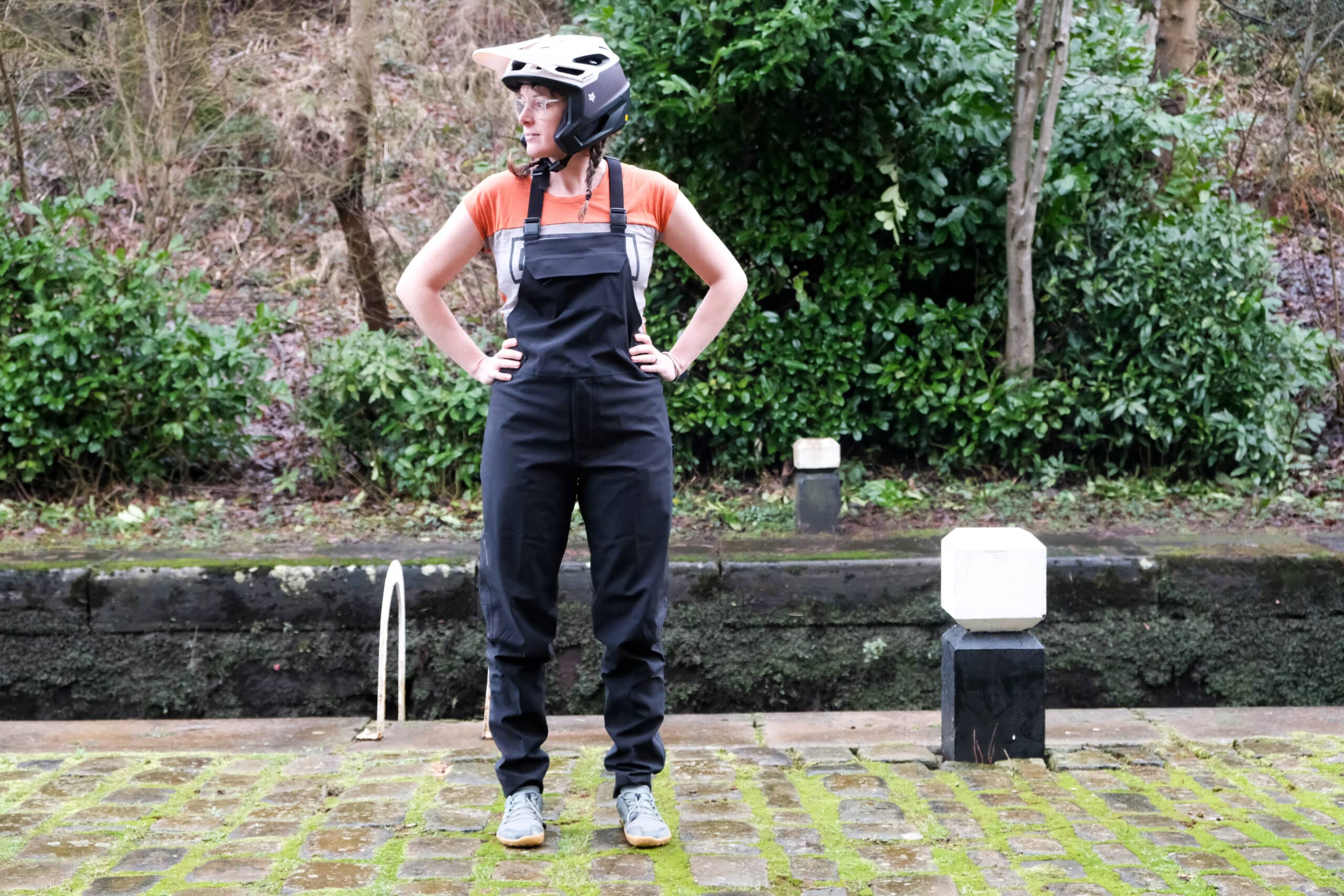 Sod the official name, these are dungarees. These come in three lengths and I’ve been wearing the Regular length, which is actually fairly long. The three-layer waterproof fabric has a slight stretch to it, but you should plan to have these moderately loose fitting, not tight – they’re not that stretchy. The fit is good. There’s plenty of room for knee pads. You can use the two-way zip on the right to let a bit of heat out. During the test period, they’ve become more water-absorbent in the seat; I can feel a cold patch as I ride, but it hasn’t yet caused any leaks. Regularly cleaning your saddle and the dungarees will help stop the grit grinding through that membrane. I’d like to see a tougher seat fabric for durability, and the chest pocket being slightly larger for modern phones. But otherwise, a really good piece of kit.