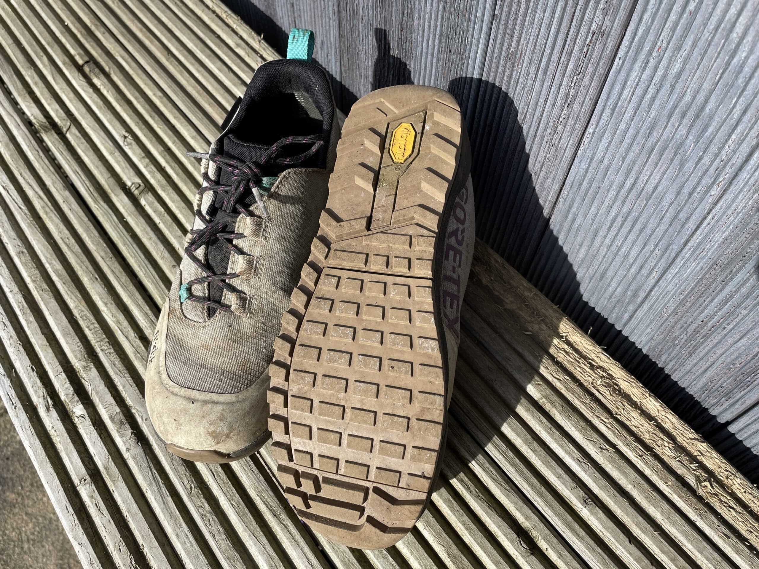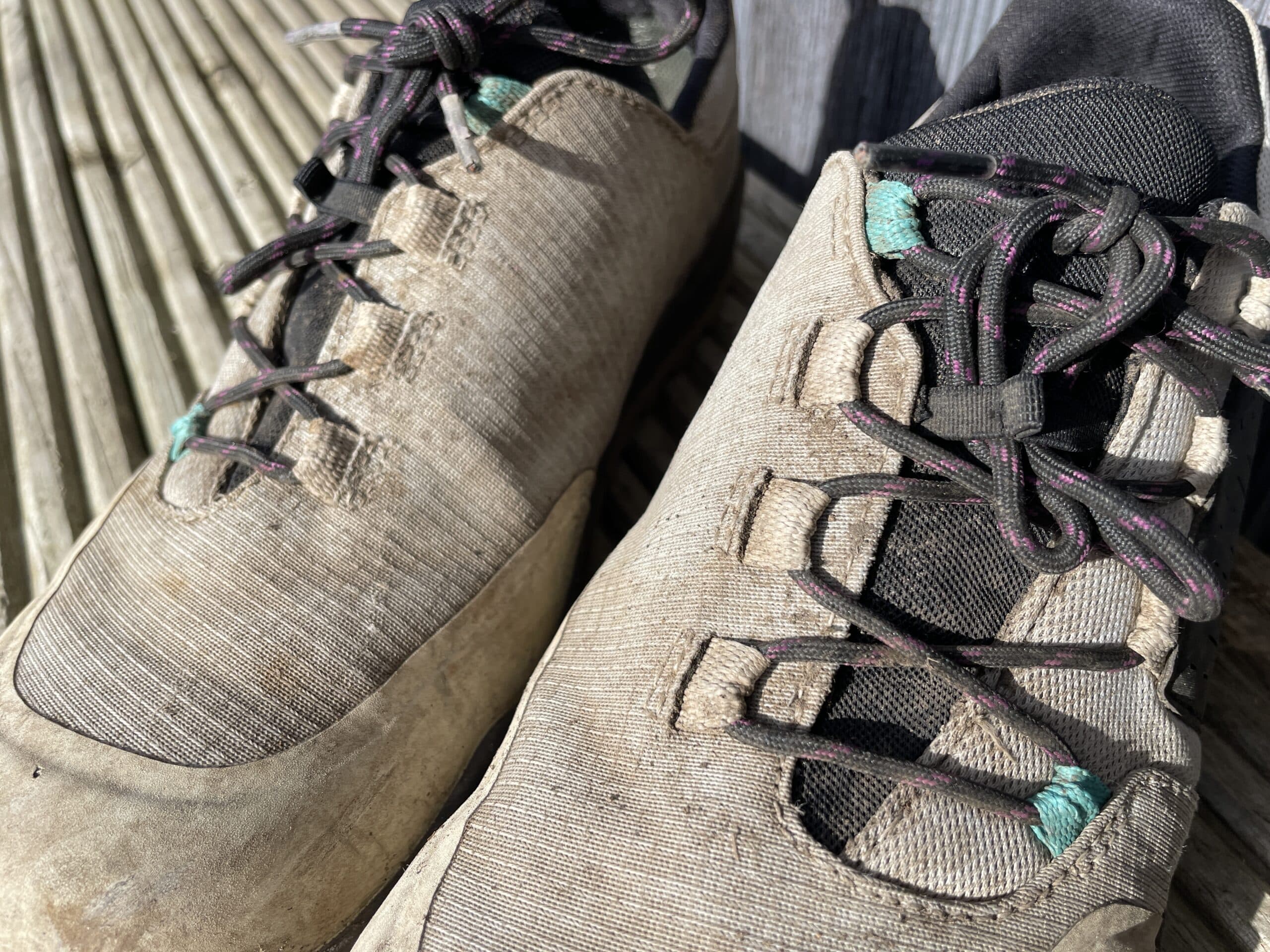 Off the bike, that tread also works. Having dislocated my shoulder while pushing my bike last year, I’ve been very conscious of feeling unsteady on my feet when on the trail. These are actually grippy, on a variety of slippery surfaces. Not only that, but despite their stiffness on the pedals, they’re flexible enough to walk in – I suspect this may be down to the deep grooves cut into the sole at flexion points.