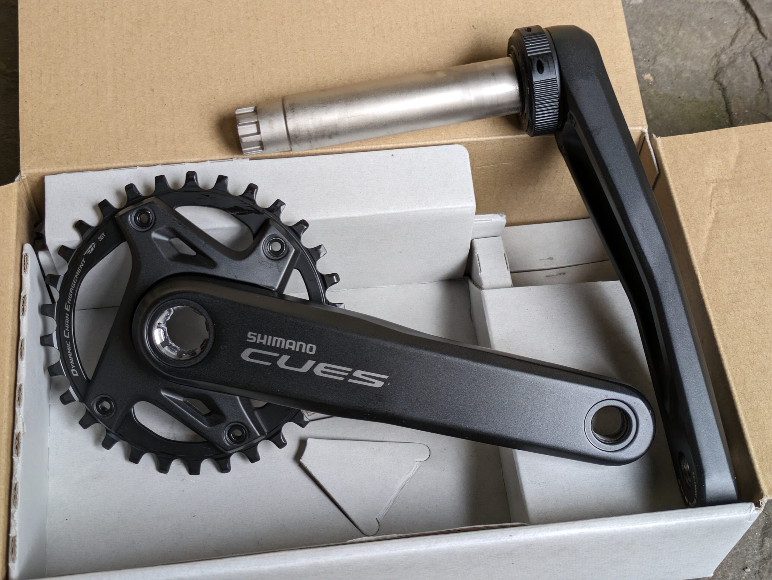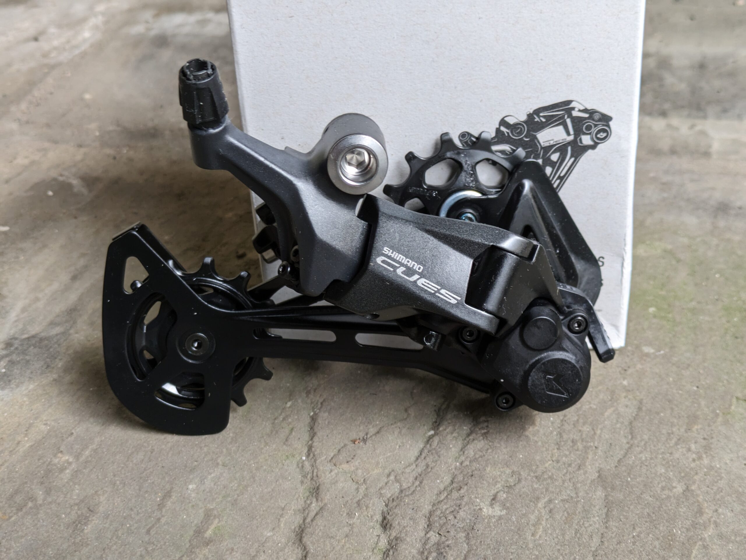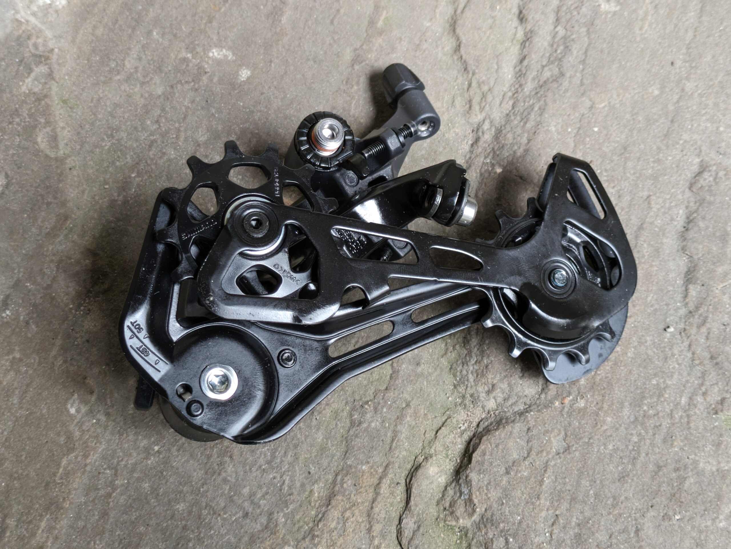 CUES is Shimano’s consolidation-tactic mid-tier drivetrain stuff. Simplified compatibility and increased durability (Linkglide technology claims to be up to 300% more durable than Hyperglide). This rear mech is Shadow Plus; lowish profile and equipped with a clutch. Large 13 tooth pulleys. Aluminium bracket body with steel outer and inner plates. Works with 10 or 11-speed. Compatible with up-to-50T cassette sprockets.