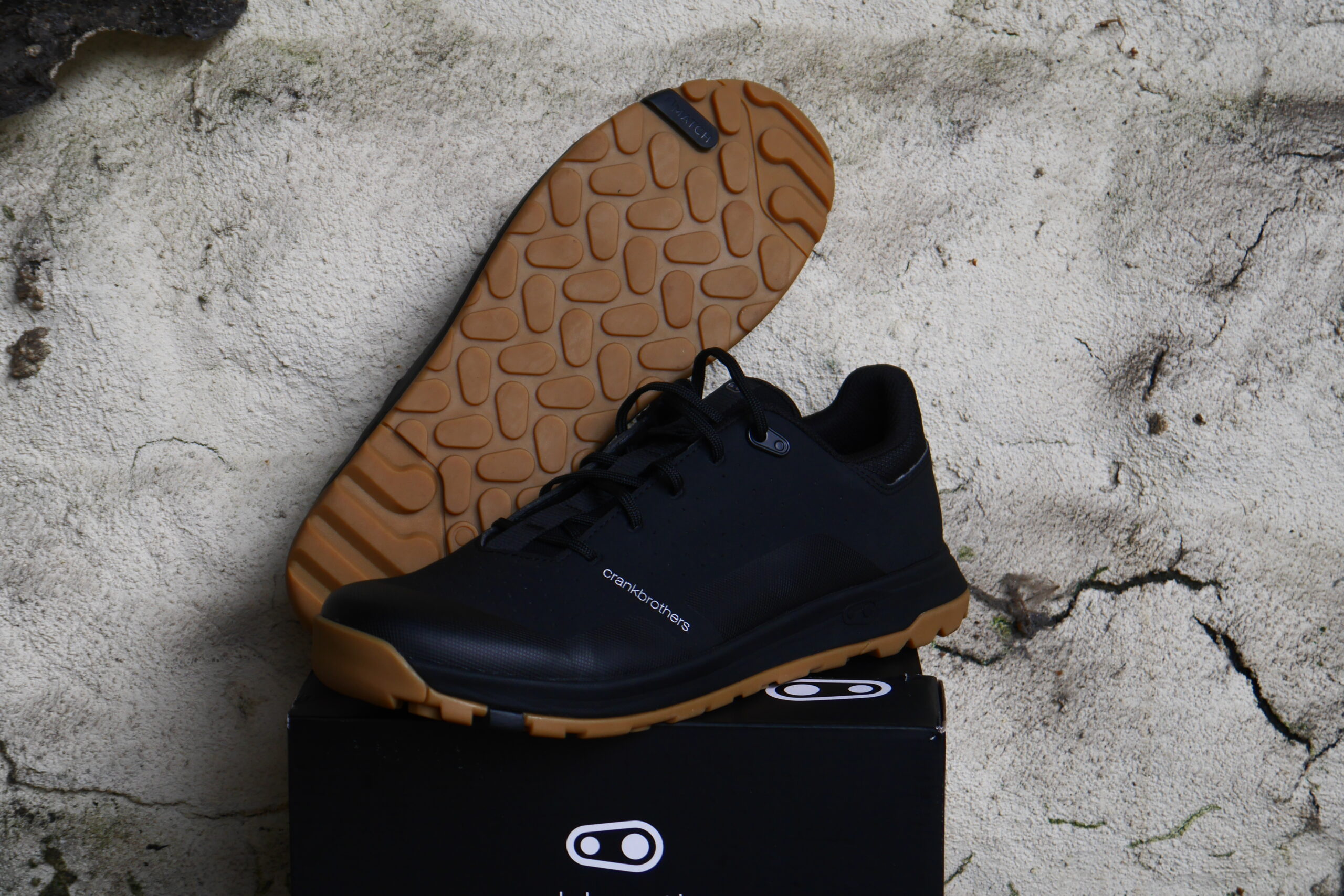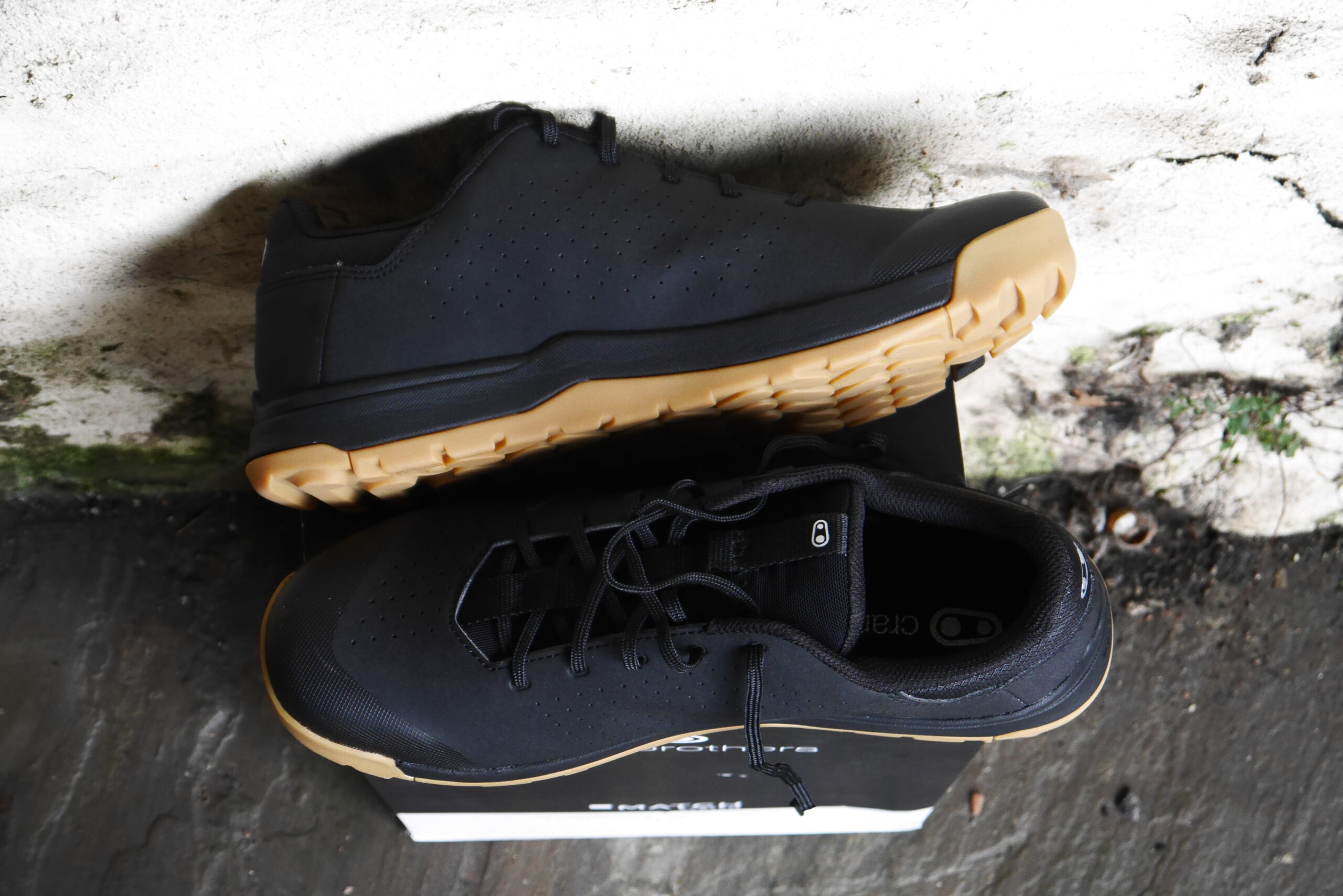 These pushbike pumps are designed to “help reduce foot fatigue for big days on the bike with deep lugs on the toe and heel ready for hike a bike adventures.” The rubber sole is made from “High-friction MC2 flat rubber compound optimised for grip, durability and rebound.” A flexible toe area. Rubber wraps the front for added toe protection. Extended heel back. Slow-rebound EVA midsole. Integrated lace pocket. Padded tongue. Relaxed fit. Initial walking-around-the-office tryouts suggest that these are impressively comfortable. They don’t feel like your typical tight cycling shoes. We’ll let you know how they perform on the peggles shortly.