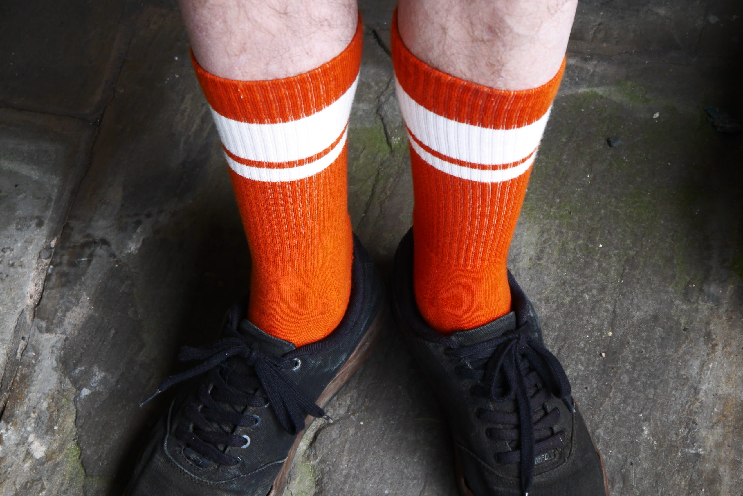 Constructed with a mix of cotton and Isoler thermal mtaerials and terry cushioning in the footbed. A deep welt at the top A flat toe seam helps at the bottom. Targeted compression in the ankle and arch zones. Made in Portugal. And most importantly, available in Rust Orange (and boring Black and Midnight Green).