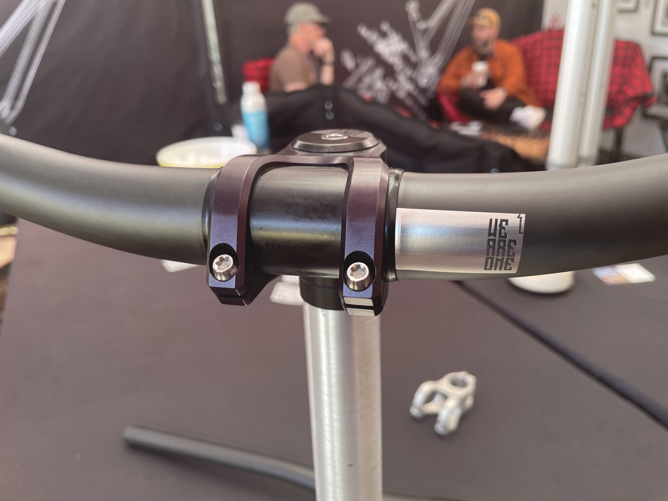 As well as the DH bike, We Are One had a new stem and handlebars to show. Previously, they’ve only sold their bar and stem as a set, because their bars didn’t fit with all stems. The addition of the collar – plus a few graphics changes – means that their bar now runs with any 35mm stem. It’s also 40g lighter thanks to some changes to the laminate used.