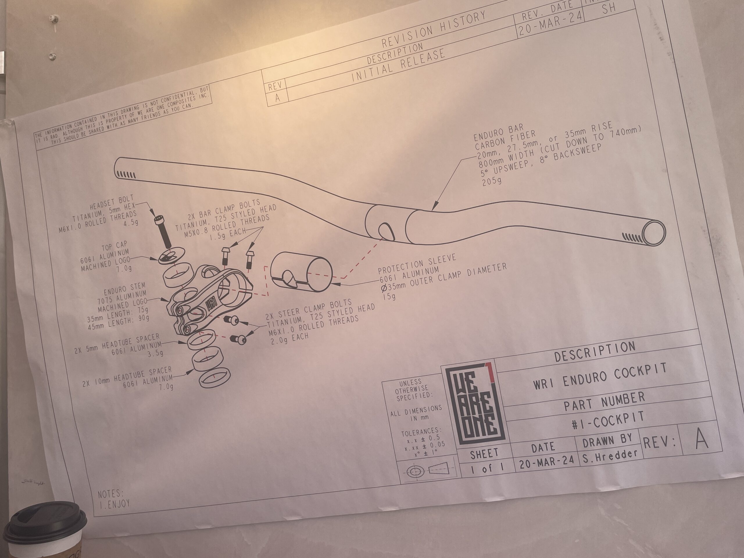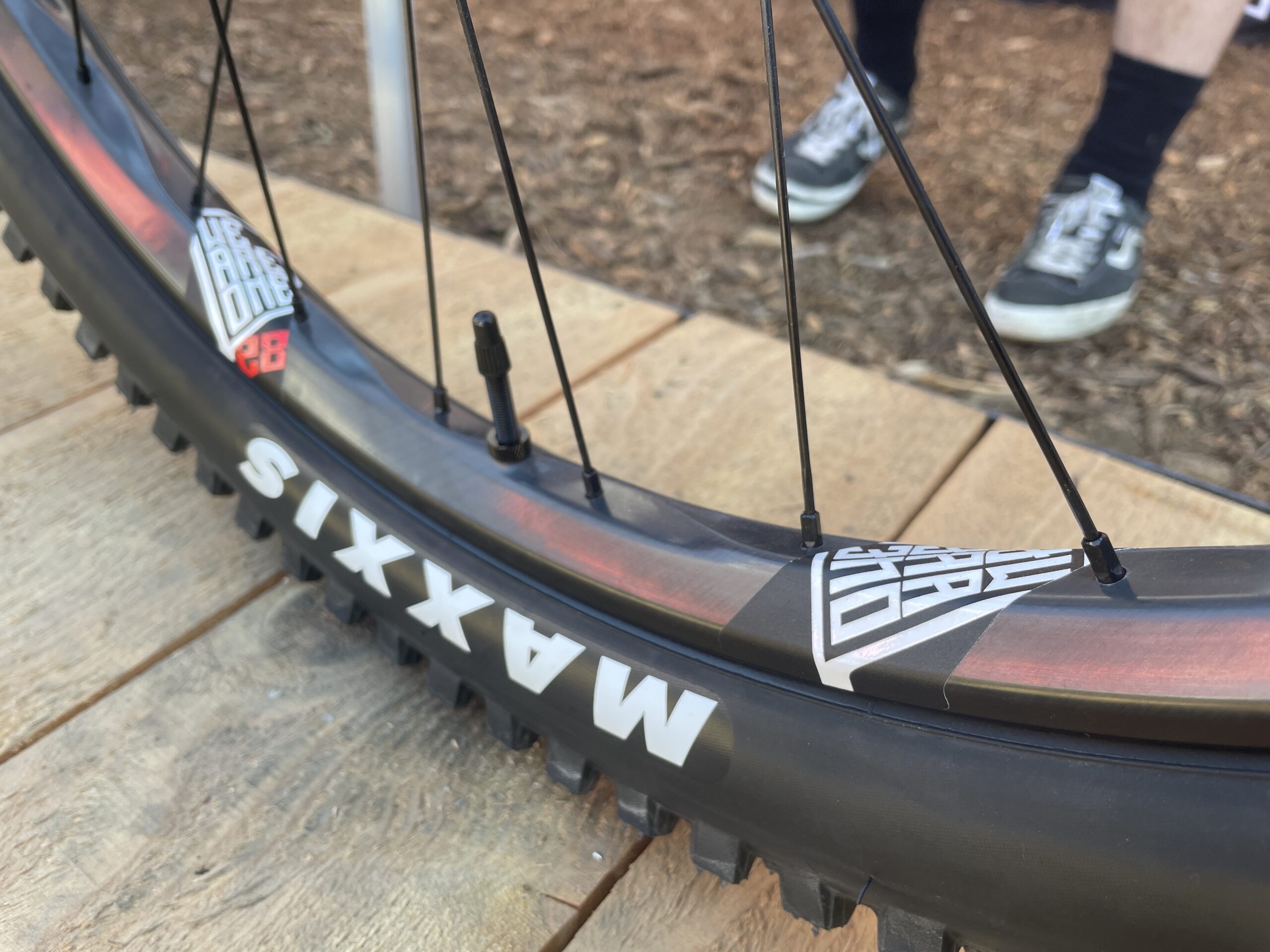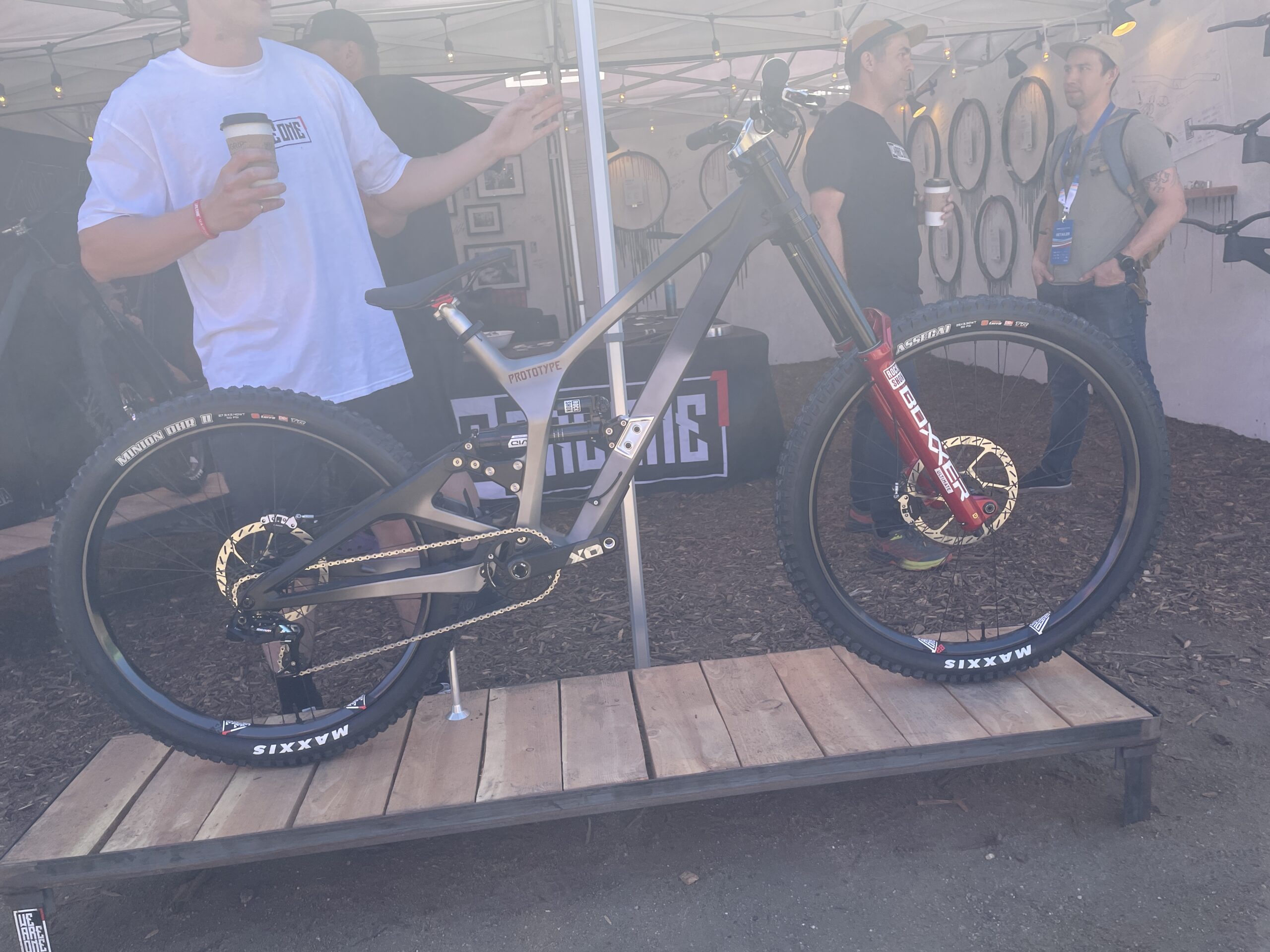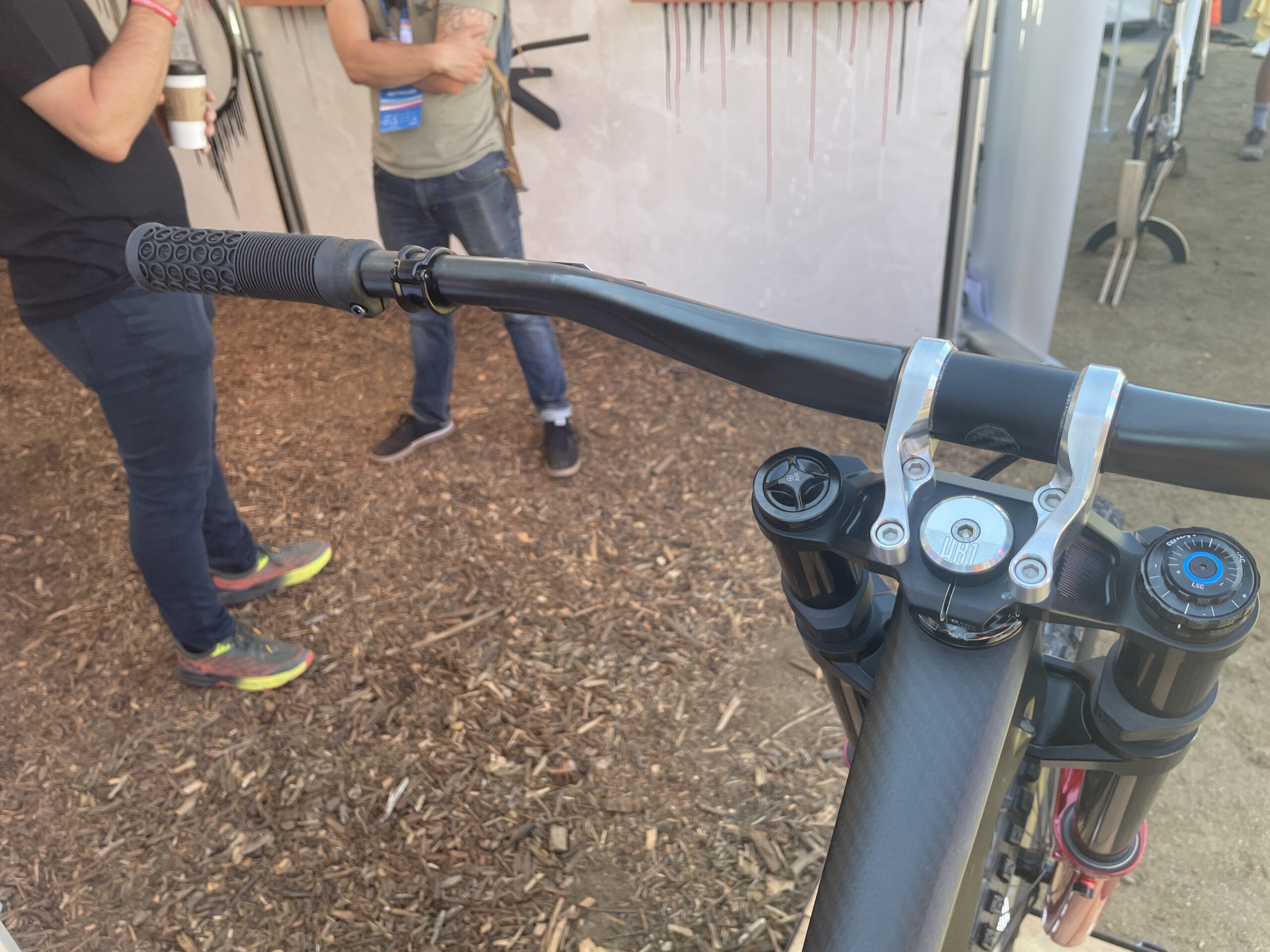 We’ve got some prototype parts on here. We’ve got a prototype direct mount stem and the prototype downhill bar. So there’s some specific shapes, some shape-specific stuff that we’ve been working on specifically for compressive stress and trying to lower the compressive stress on the handlebar to change the failure modes. And then we’ve also got some downhill laminate wheels right now that we’re testing out. And I believe that’s sort of it for the moment.