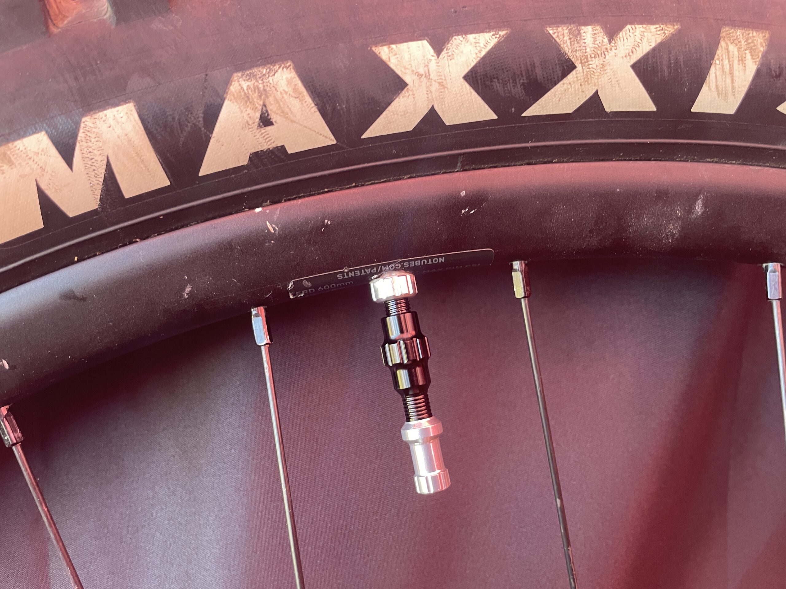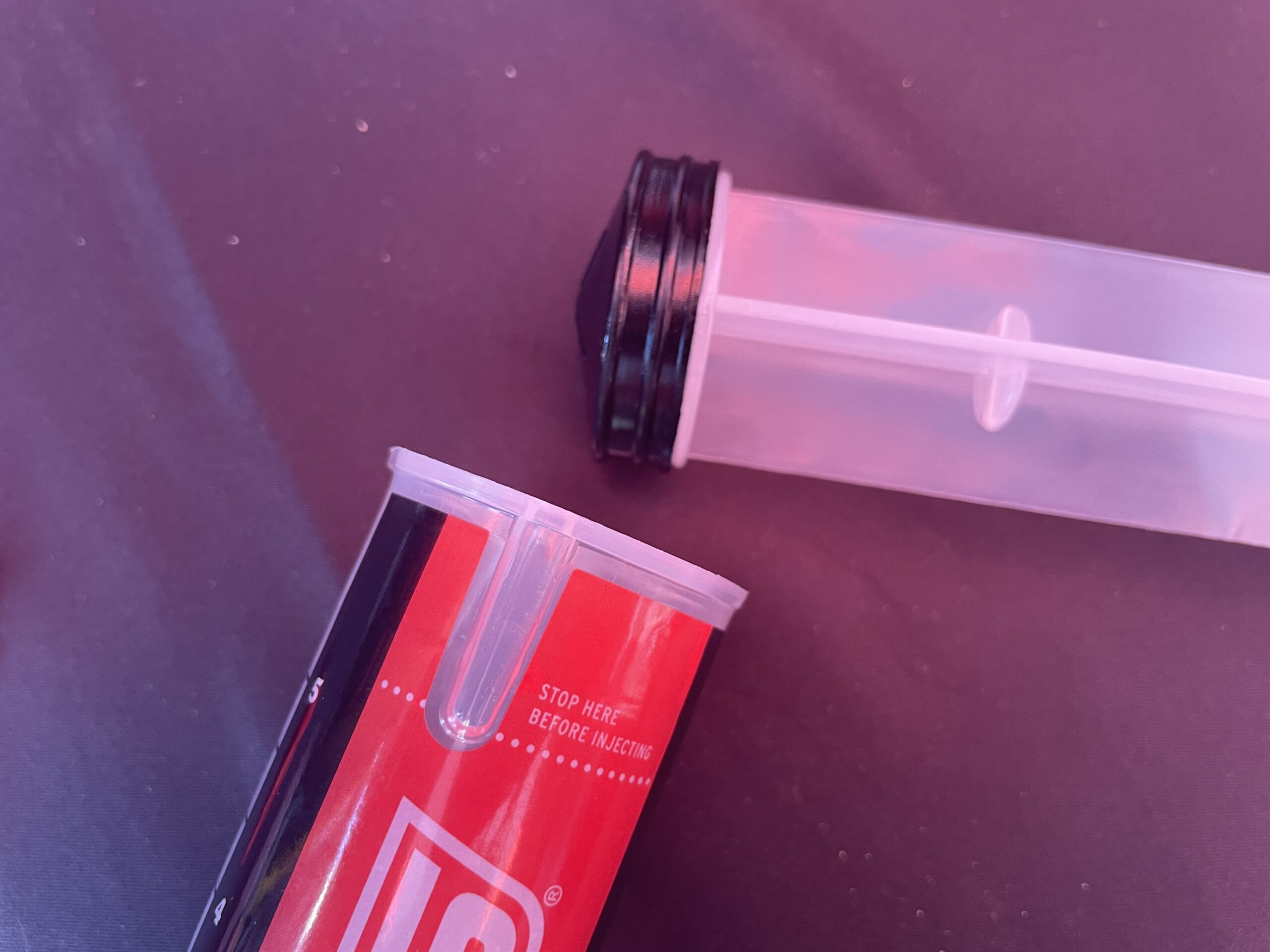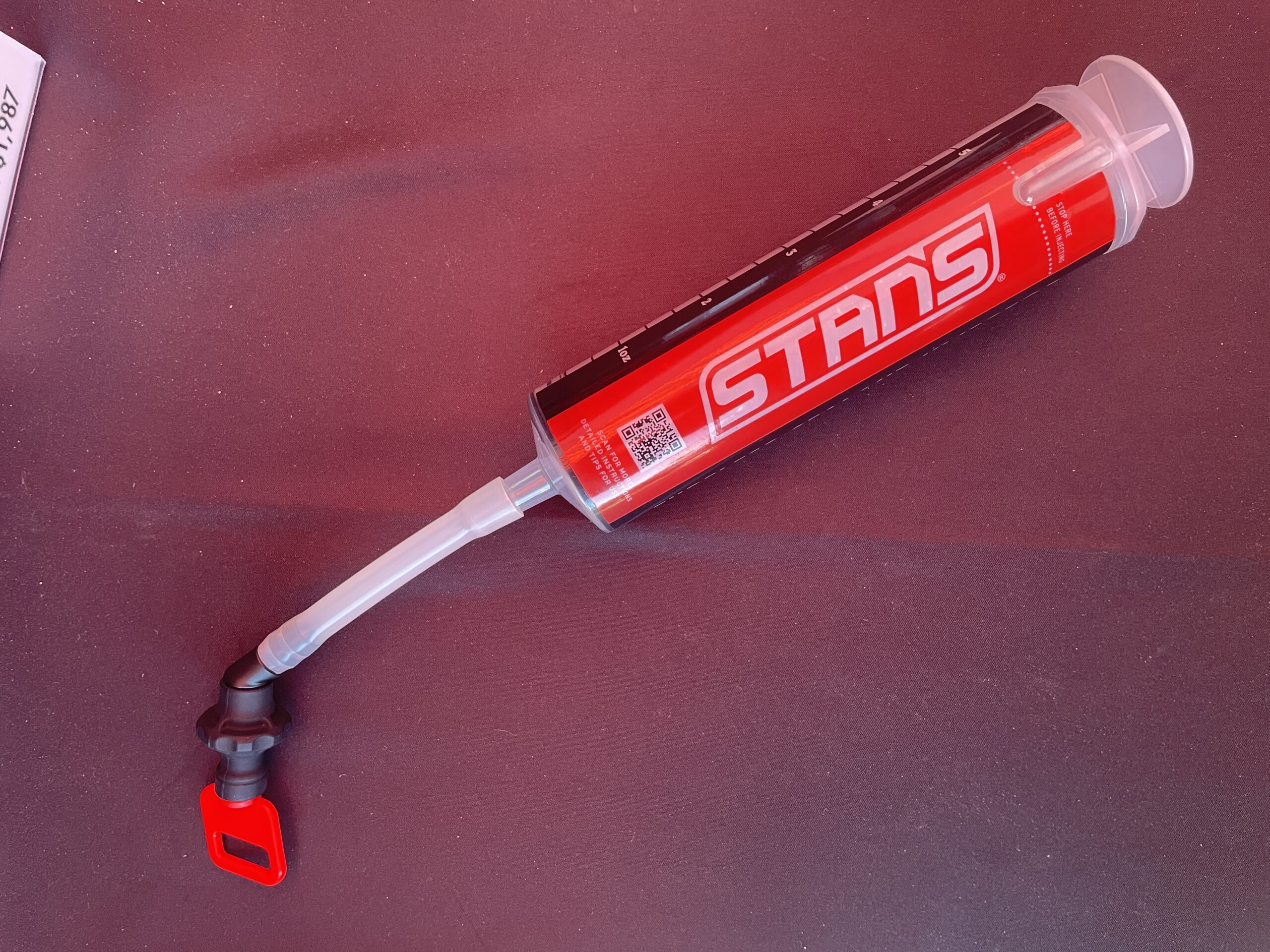 You’re going to want one of these: a tubeless fluid 150ml injector with a few tricks up its sleeve. A red plug for the end to stop the drips, a rubber 1-way no-drop valve valve that just pushes on to your tubeless valve, and a cunning notch in the top of the syringe so you can get the plunger on without squirting stuff everywhere.