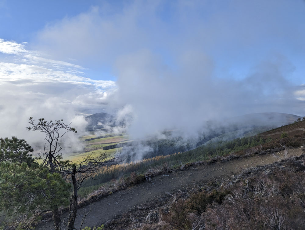 My favourite trails at Pittenderich were High Pressure and Fool’s Gold, but I was more surprised by how much I enjoyed our warm-down laps of the original Tarland Trails at Drummy Woods. These are for children and beginners, really, and are narrow and winding with a short, shared climb to the top. I could picture myself riding Red Squirrel and Spikey Hedgehog, the red and blue loops, for hours, falling deeper and deeper into reverie and trance. This time night fell on our fifth lap, a freezing fog set in, and my feet grew cold, so we returned to Rob’s car and I swapped into my smart shoes.