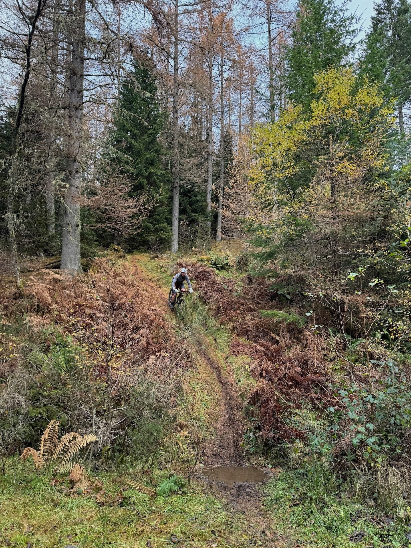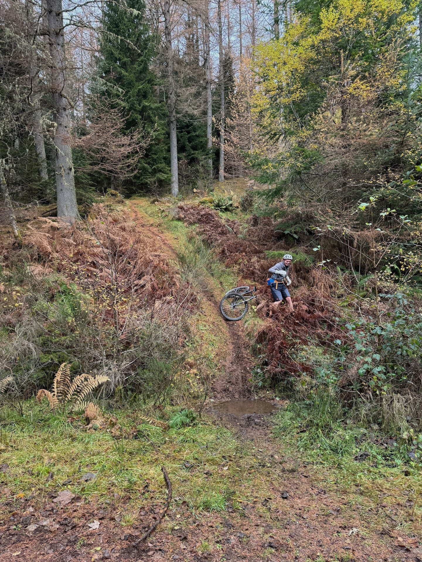 Beside Douglas firs in the Hermitage, Peter checked the map. Frost had set hard by the side of the path. The crashing of the River Braan through the Black Linn Falls was not far off. We got going. Most of the climbing took fire roads, save for the clay slurry which constituted the access path up Birnam Hill. By this point our legs were tan and the back of our shorts dysenteric, though at least we avoided hitting The Wall on Pink Floyd. The locally dug trails were wet, rooty, steep, exposed, slate-strewn, and fabulous. I could smell my brakes running hot on the discs. The riding was at the limit of my ability. I fell off five times.