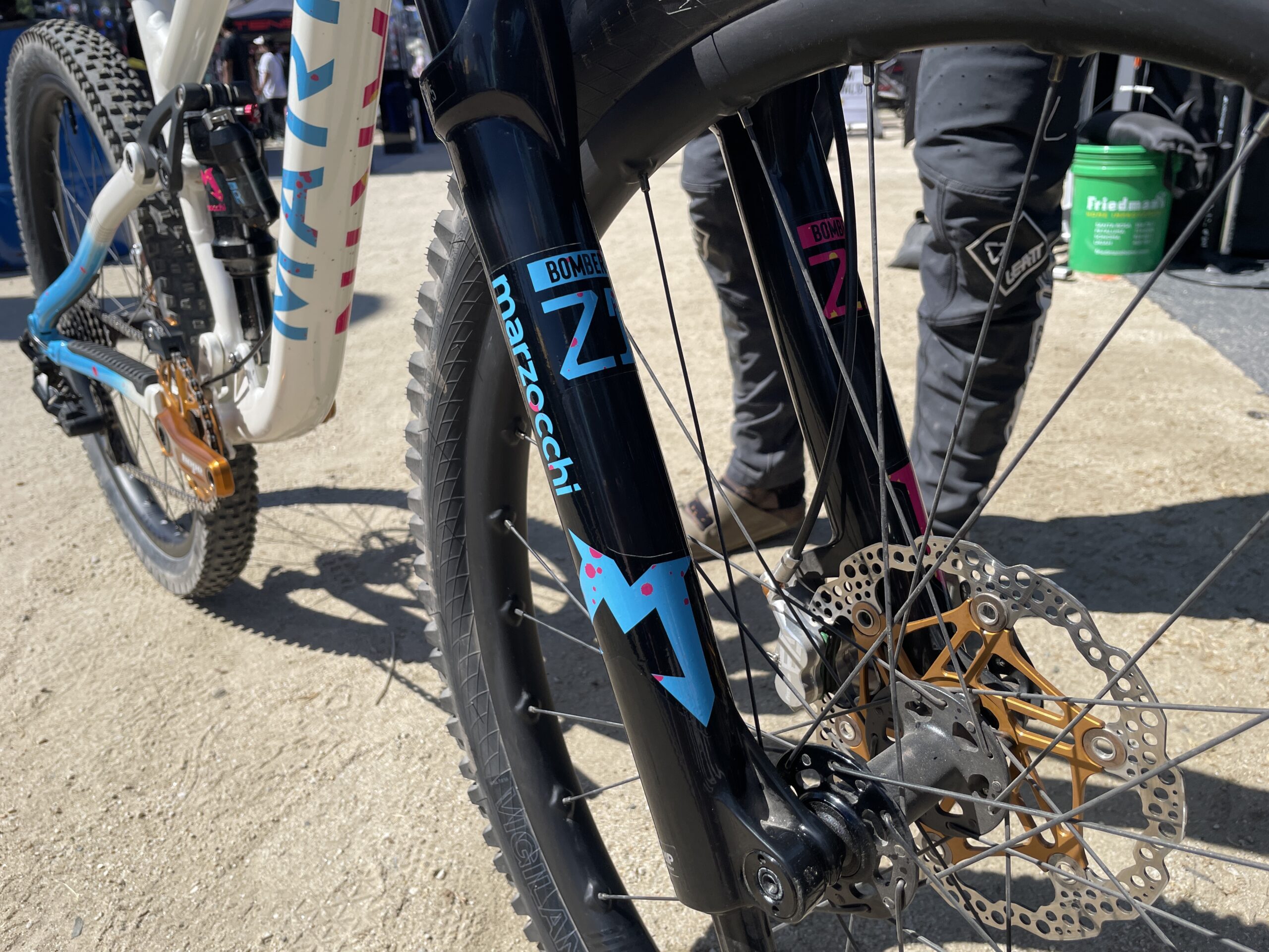 Marzocchi, got the Z1 on the front and the Marzocchi Bomber Air Shock. Compression’s fully on the fork. So I think on the fork I’ve got four tokens. And compression’s wide open. And what would my fork have been… where’s my phone? I do have my setup so I can tell you some numbers…. I think my pressure was 105 PSI. [with four tokens in there as well]. And my shock was, usually I’d run it with like 230. But… It was closer to 200. I think it might have actually been like 180 or 190. It was considerably lower than usual, but then I had a little bit of compression on the shock. And the shock has 1.1 tokens.