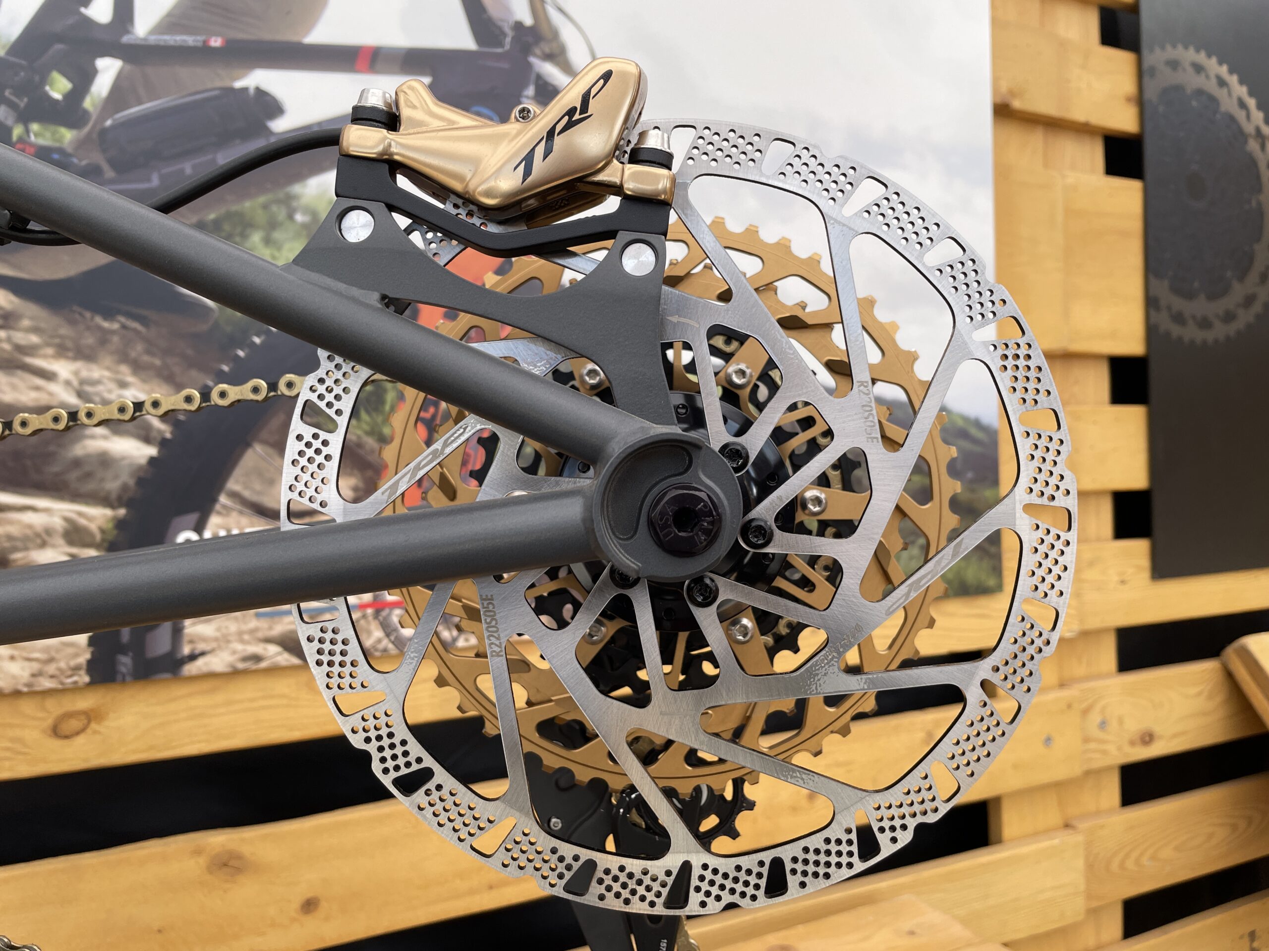 These have the same thickness as other TRP rotors, but have been laser etched to optimise heating and cooling, particularly during DH Racing. Designed with input from their race team, there should be enough metal where you need it, but also plenty of cooling ventilation. They promise 10% faster deceleration, as well as better bite and bedding in performance.