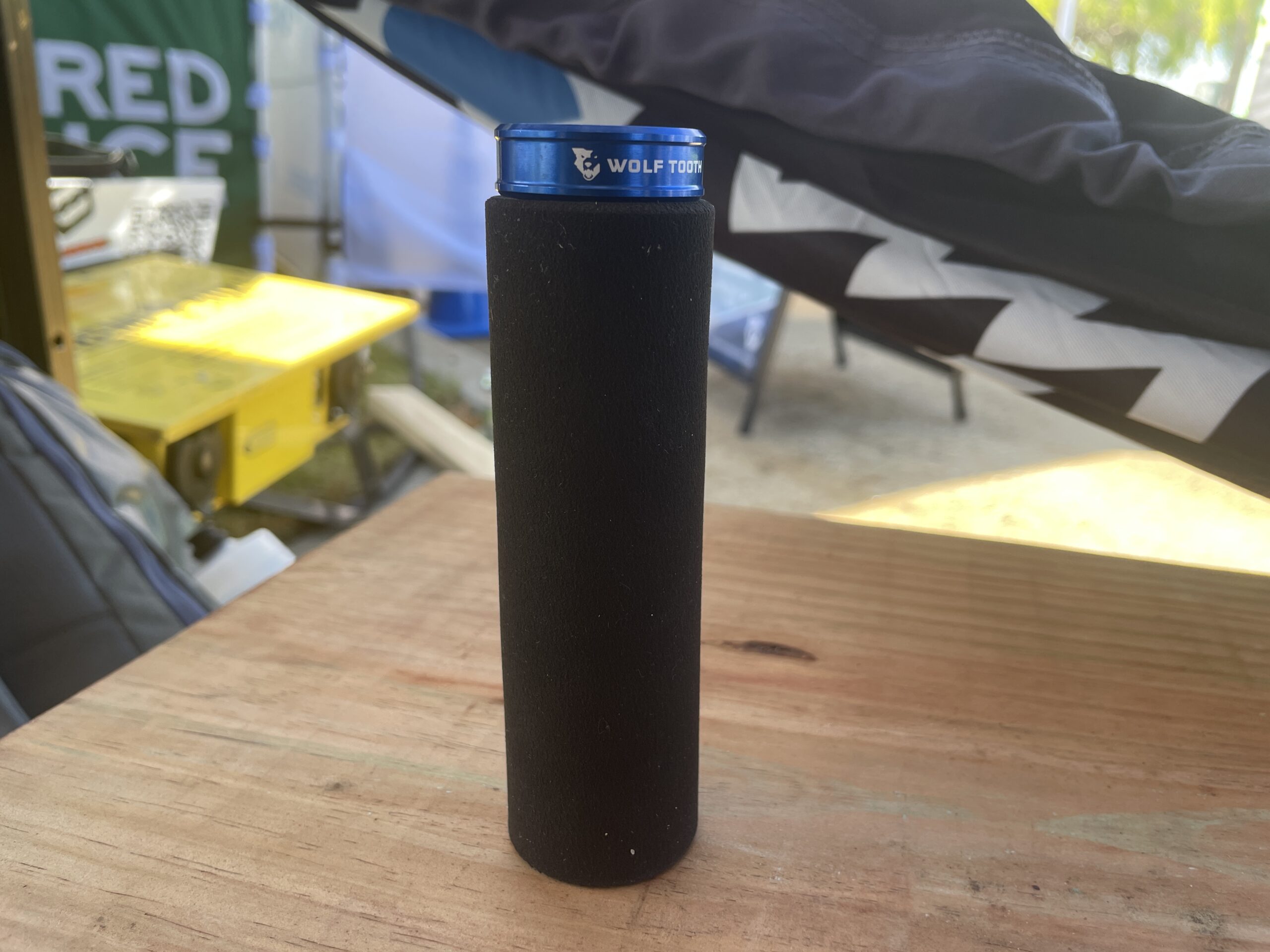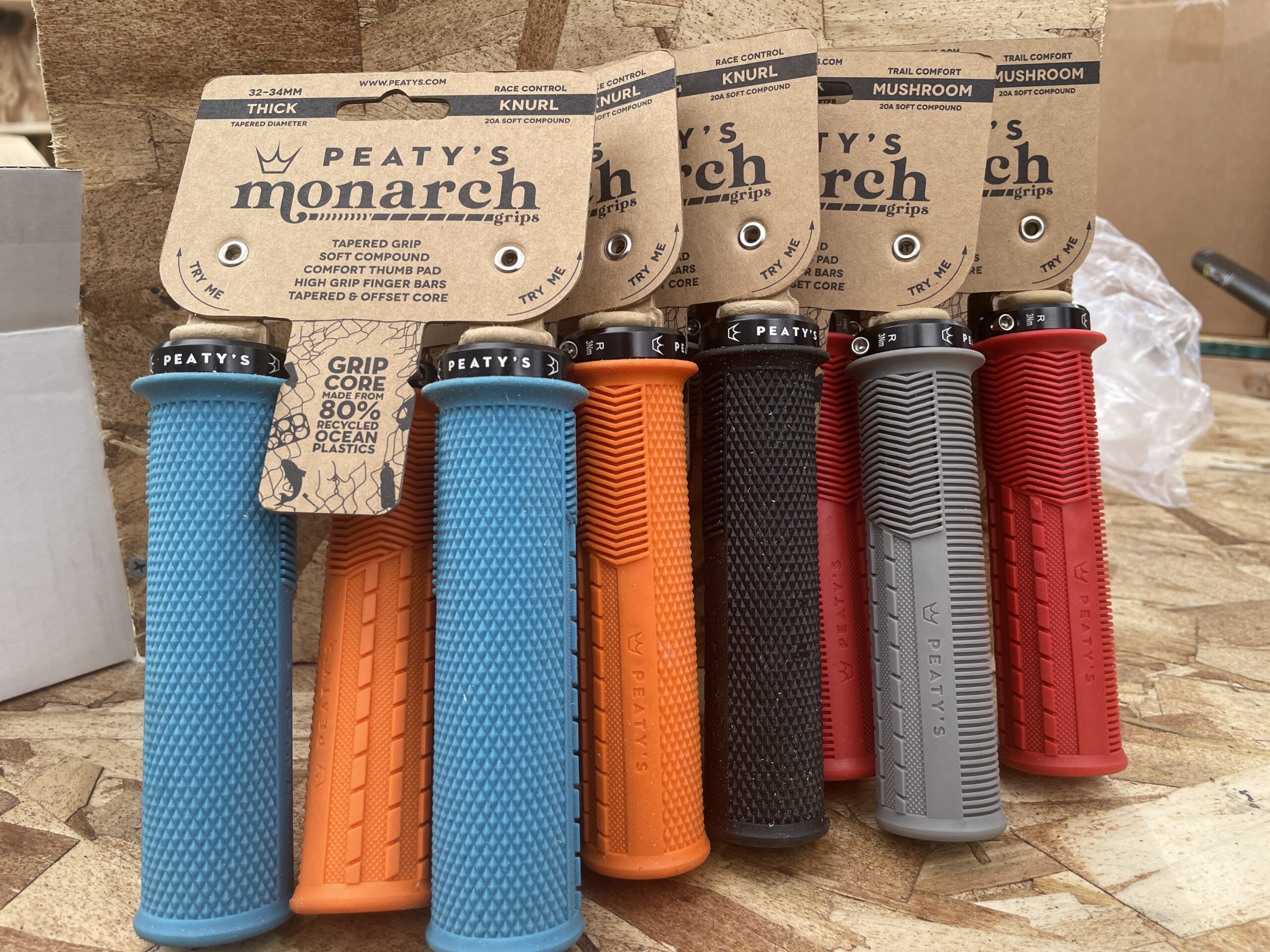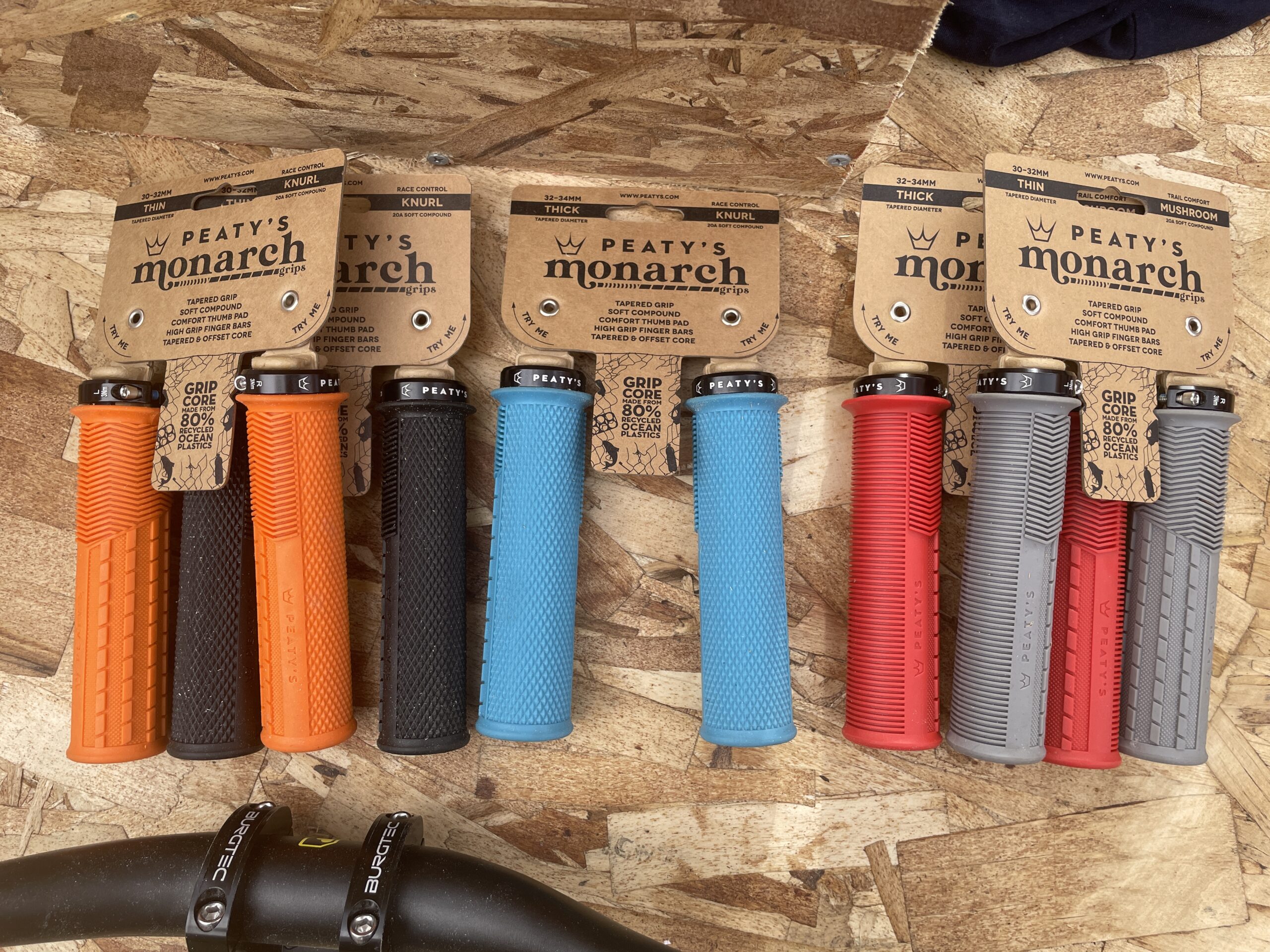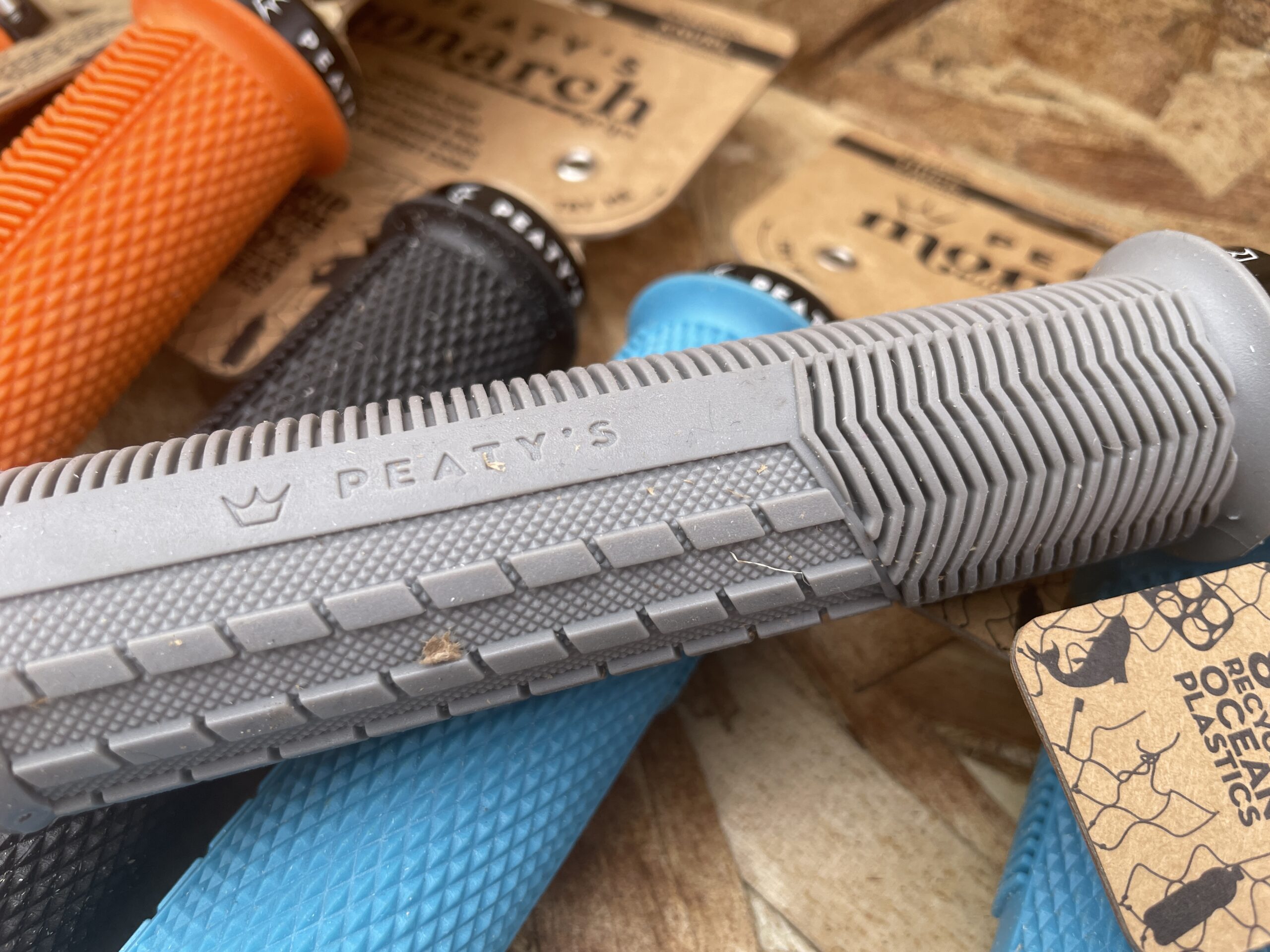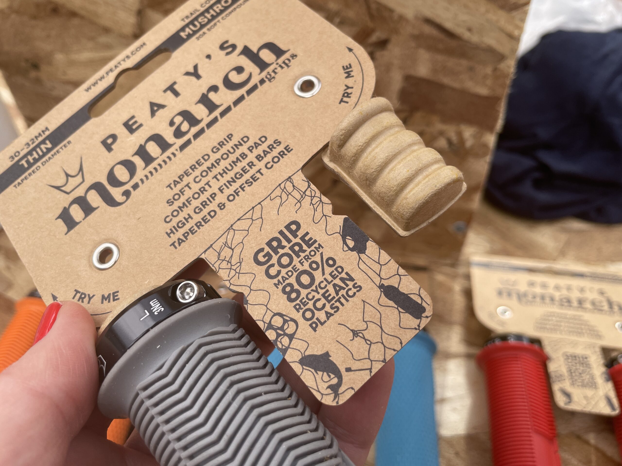 Steve Peat has long since had signature grips, and now he’s put his name to some from his own brand. You can choose from mushroom or knurl, thick or thin. They’re left and right specific, which doubles the cost of the mould to make them, but allows them to have an offset tapered core for better cushioning and specific external contouring for better grip. The grips are also a custom length, using an 8mm clamp instead of an 11mm one. On the underside are finger bars cut into the grip, giving grip without squirm. So, they’re not just rebranded catalogue grips. Better yet, there’s no plastic packaging, with a specially developed card/plug. The plastic cores are also made with 80% recycled ocean plastics.