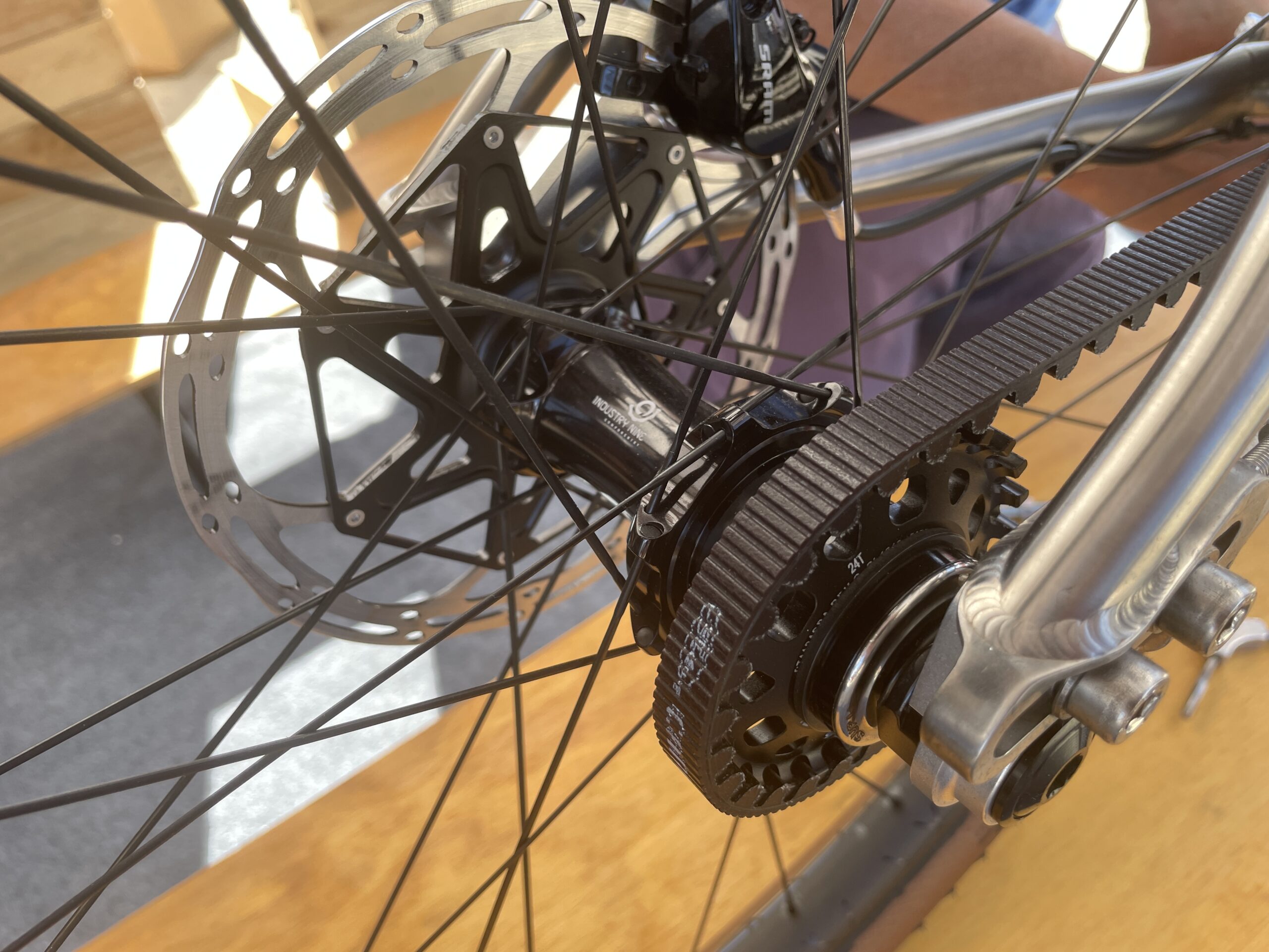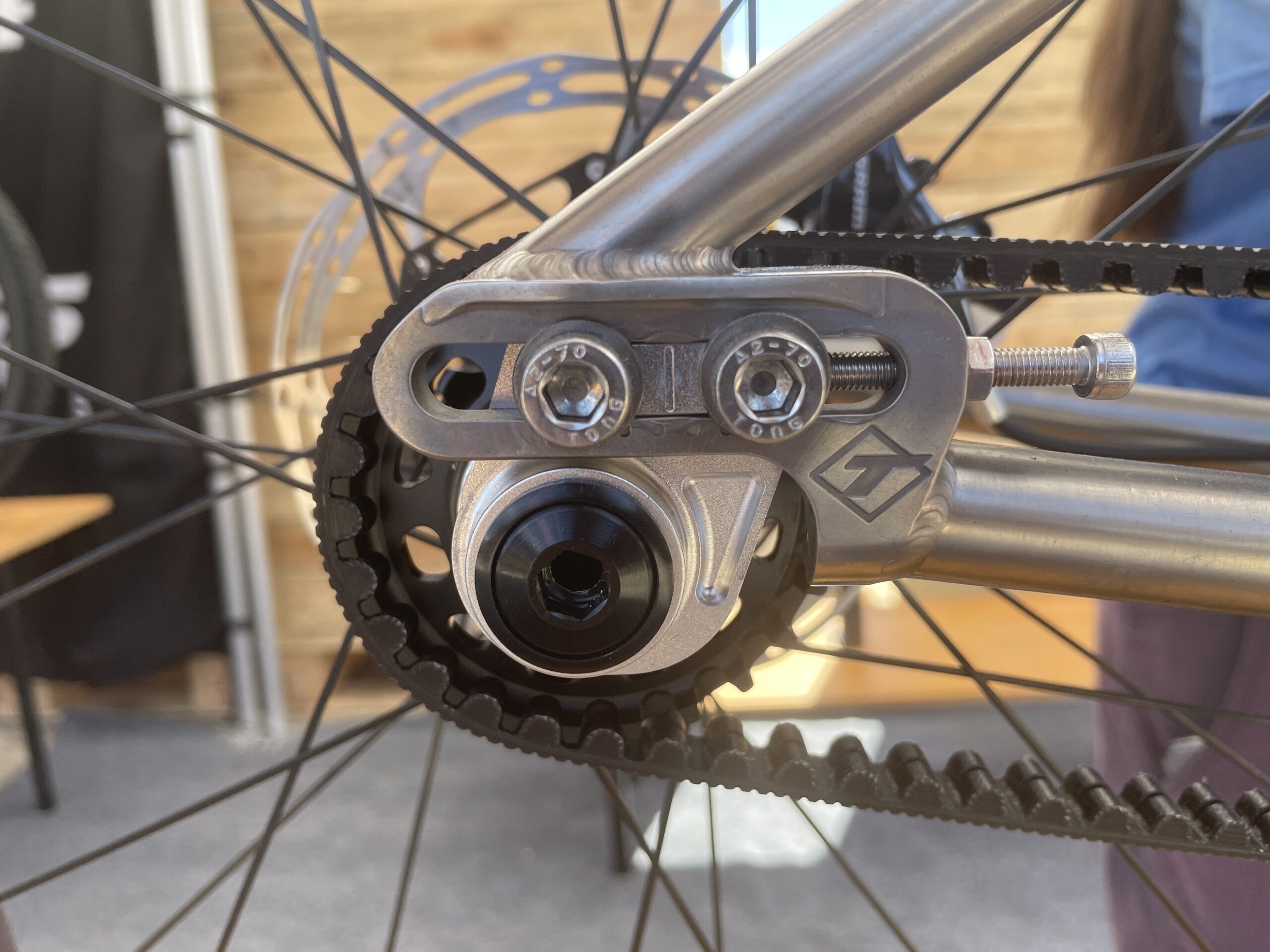 This titanium bike has been designed with the Singlespeeders of Arizona in mind. Apparently it’s the epicentre of singlespeeding. But a split chainstay means you can also use a belt drive, which is what’s shown here. It’s got a 3D printed yoke, and the adjustment in the drop out allows you to accommodate a three tooth range in rear cogs without changing the belt. We’ll try and have another chat with David Turner once he’s all set up.
