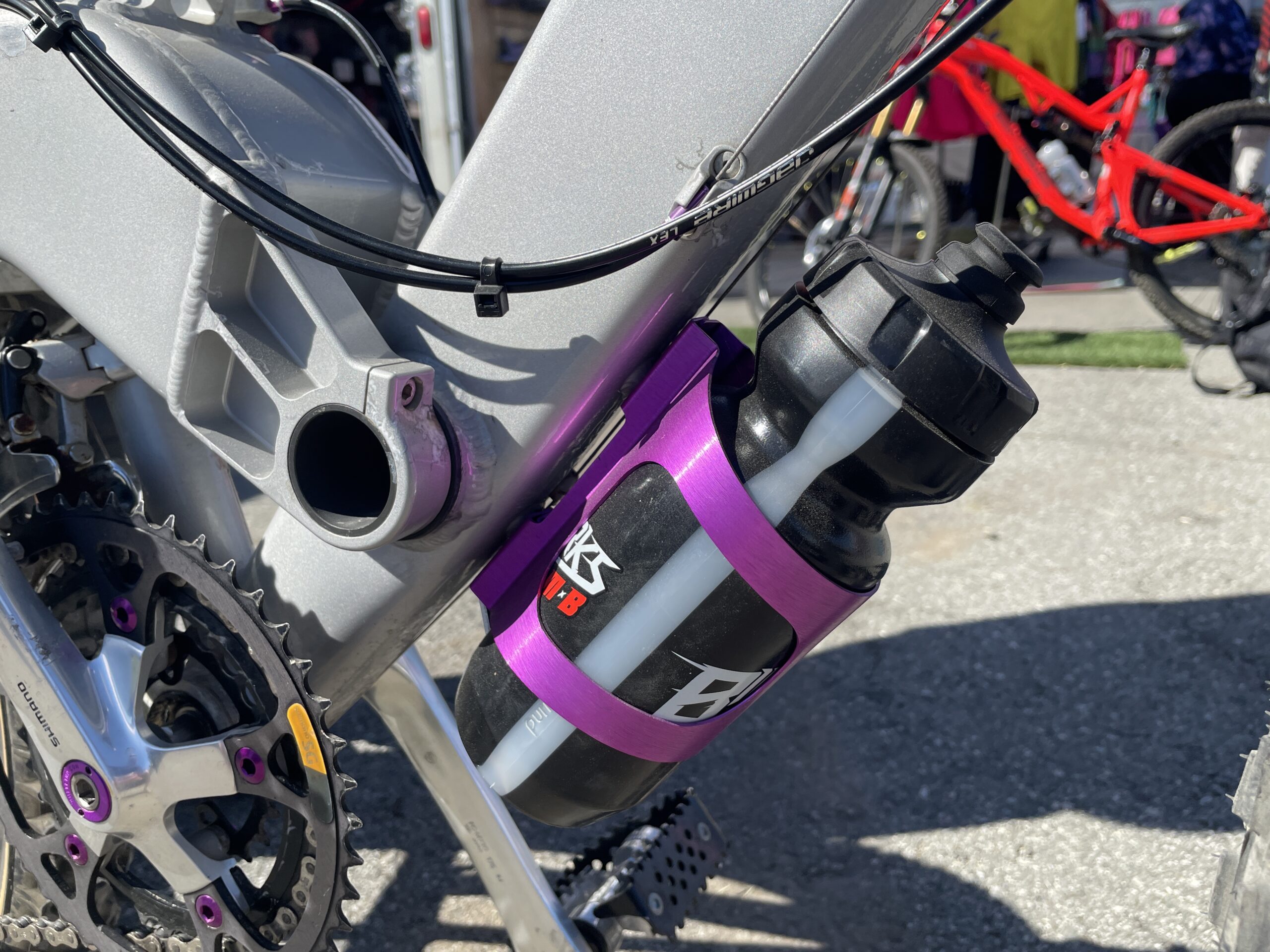Well, it did actually come with the power post on it when I got it. It was completely frozen. I had to pull that apart as much as I could to rebuild it, get it back working again. Purple and blue were the colours of the bike and I kind of stuck with purple as you can see throughout the whole build. My Bullet Brothers tensioner back there that was red, I painted it black. But just trying to keep everything, you know, really original. It’s the original Ringle cage and seat collar.