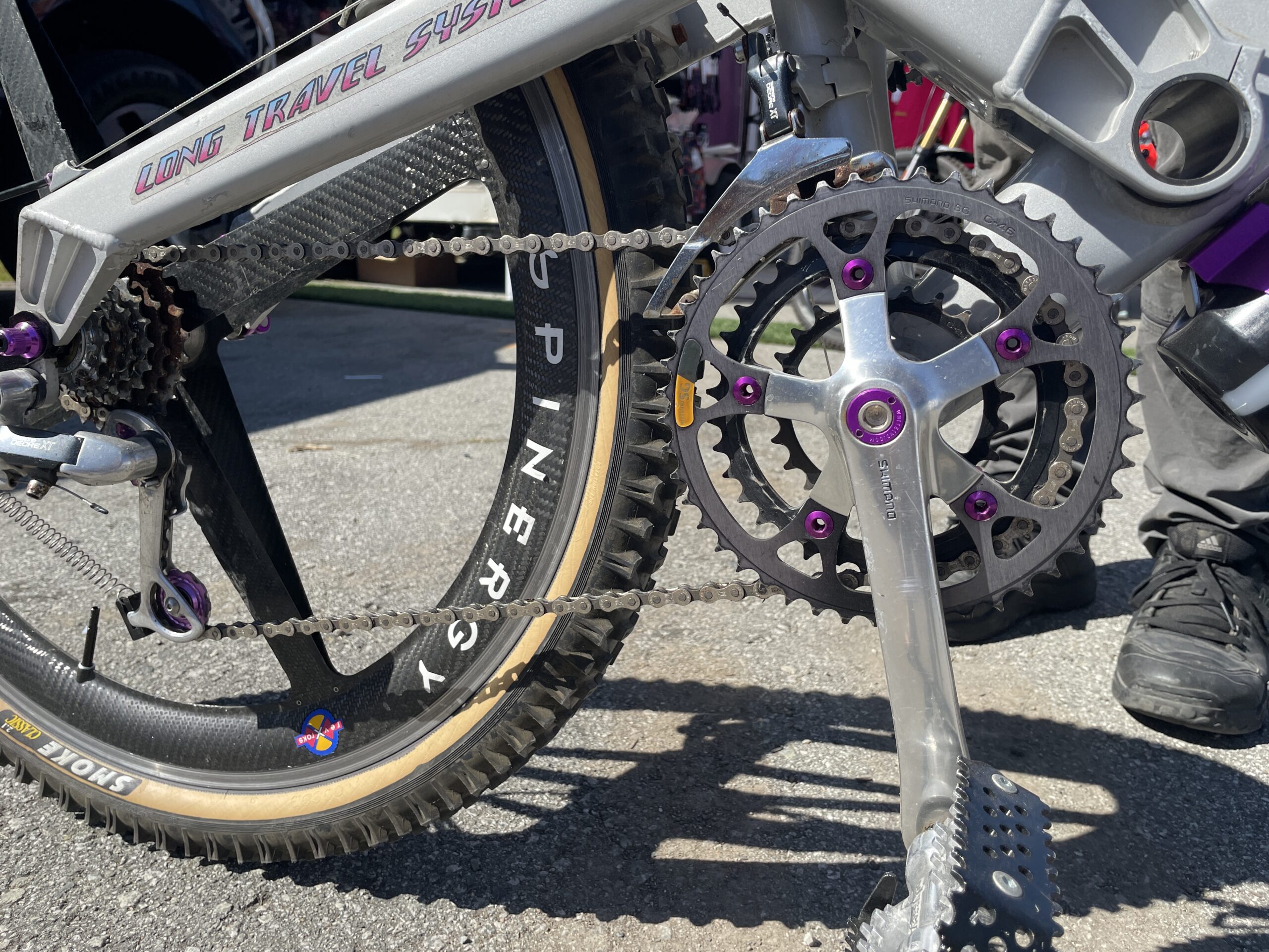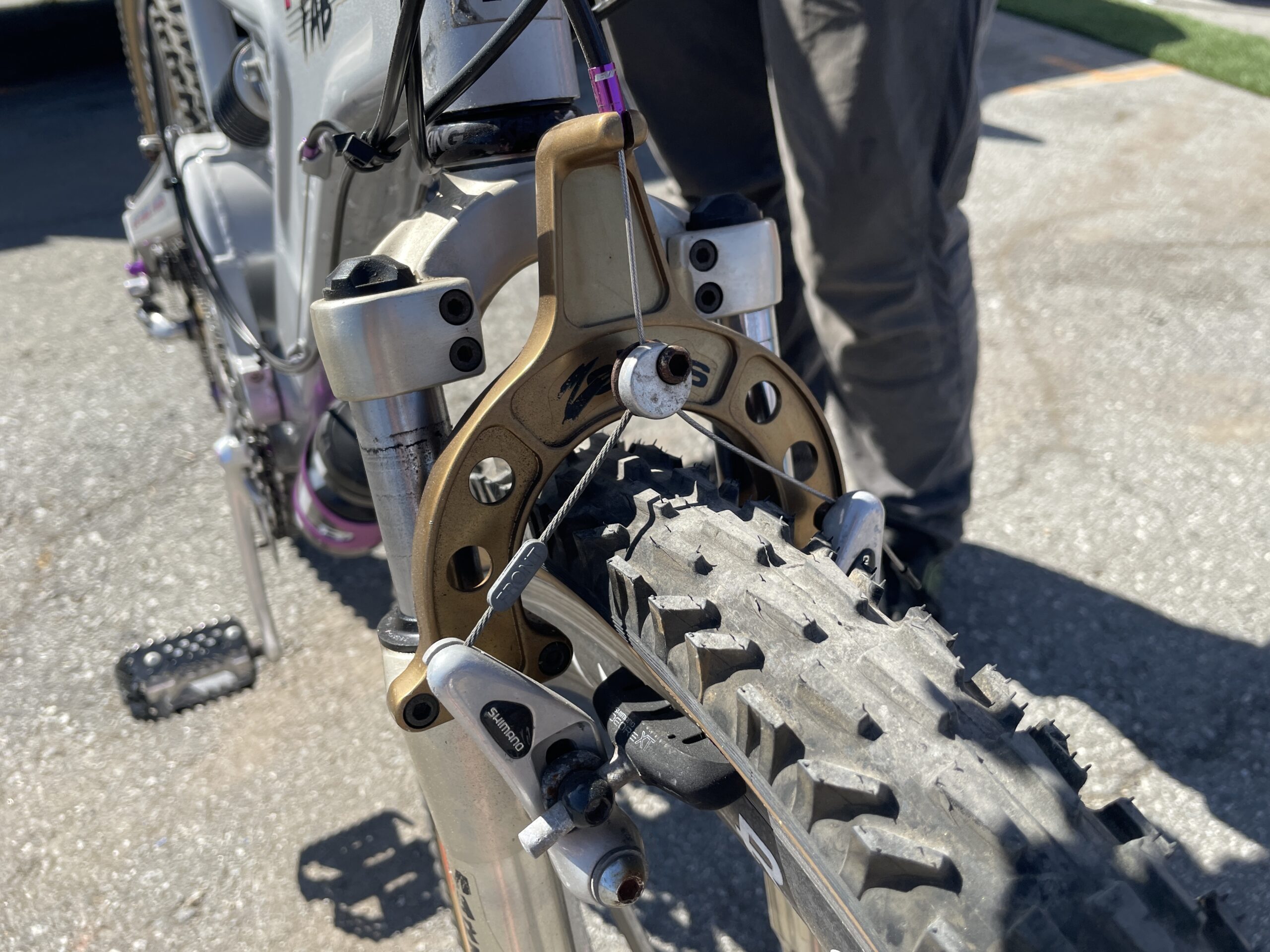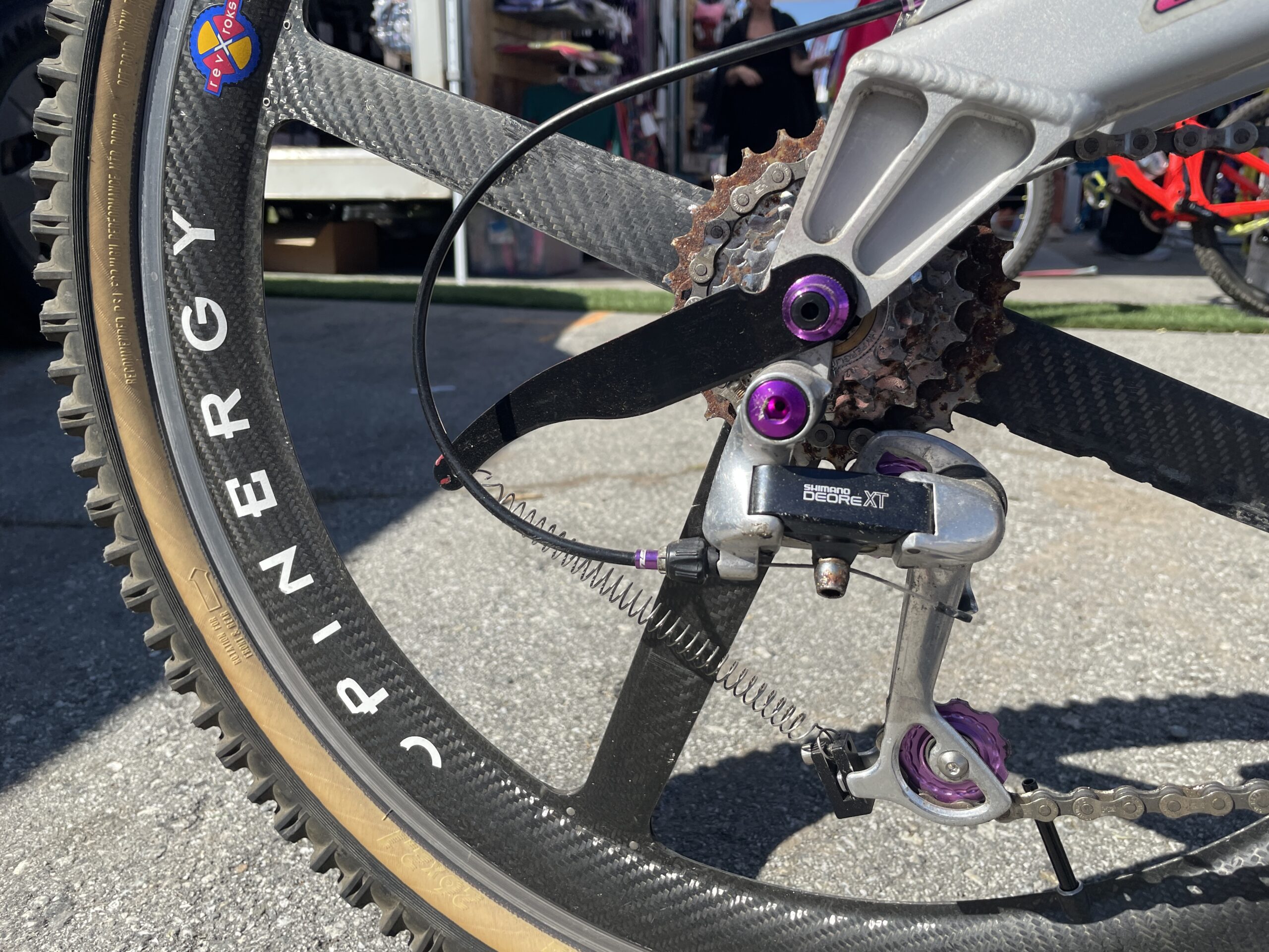 Yeah, it has the Vanilla rear shock on it. It has the titanium wishbone for the cantilevers, all still intact and perfectly functioning and everything like that, which I’m super stoked on. The Spinergy wheels, would be really sort of just a fun touch, just a little something to kind of add, you know, a little pizzazz to the bike. Period correct anodised pulley wheels on the rear derailleur there.