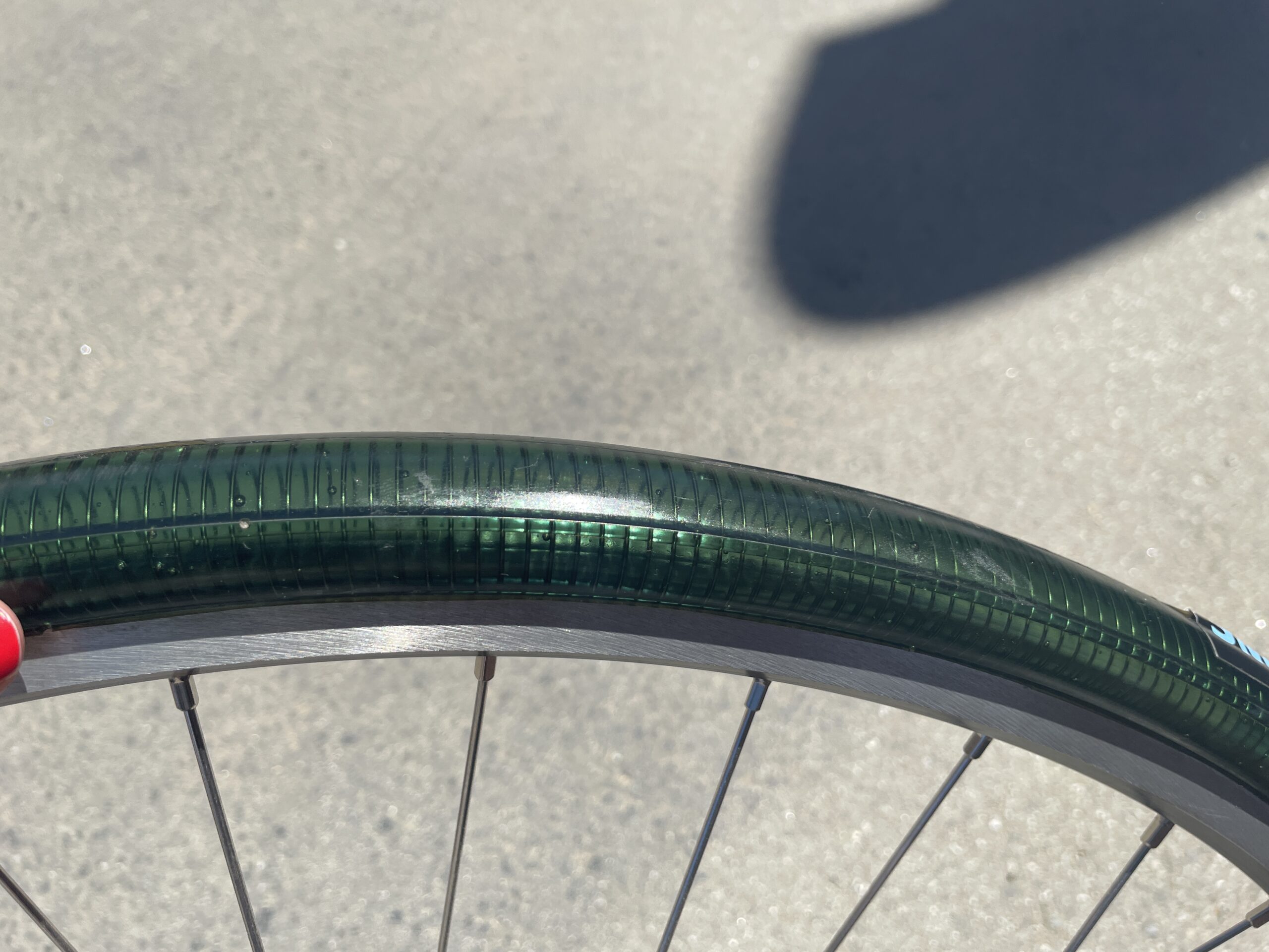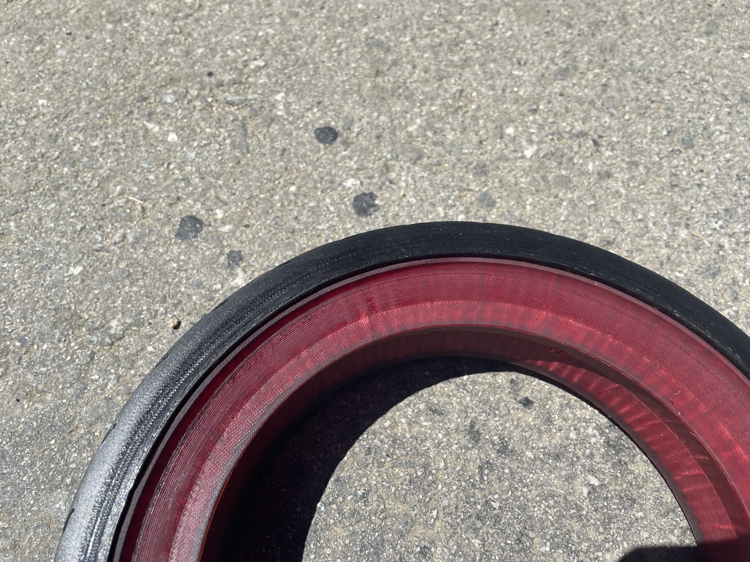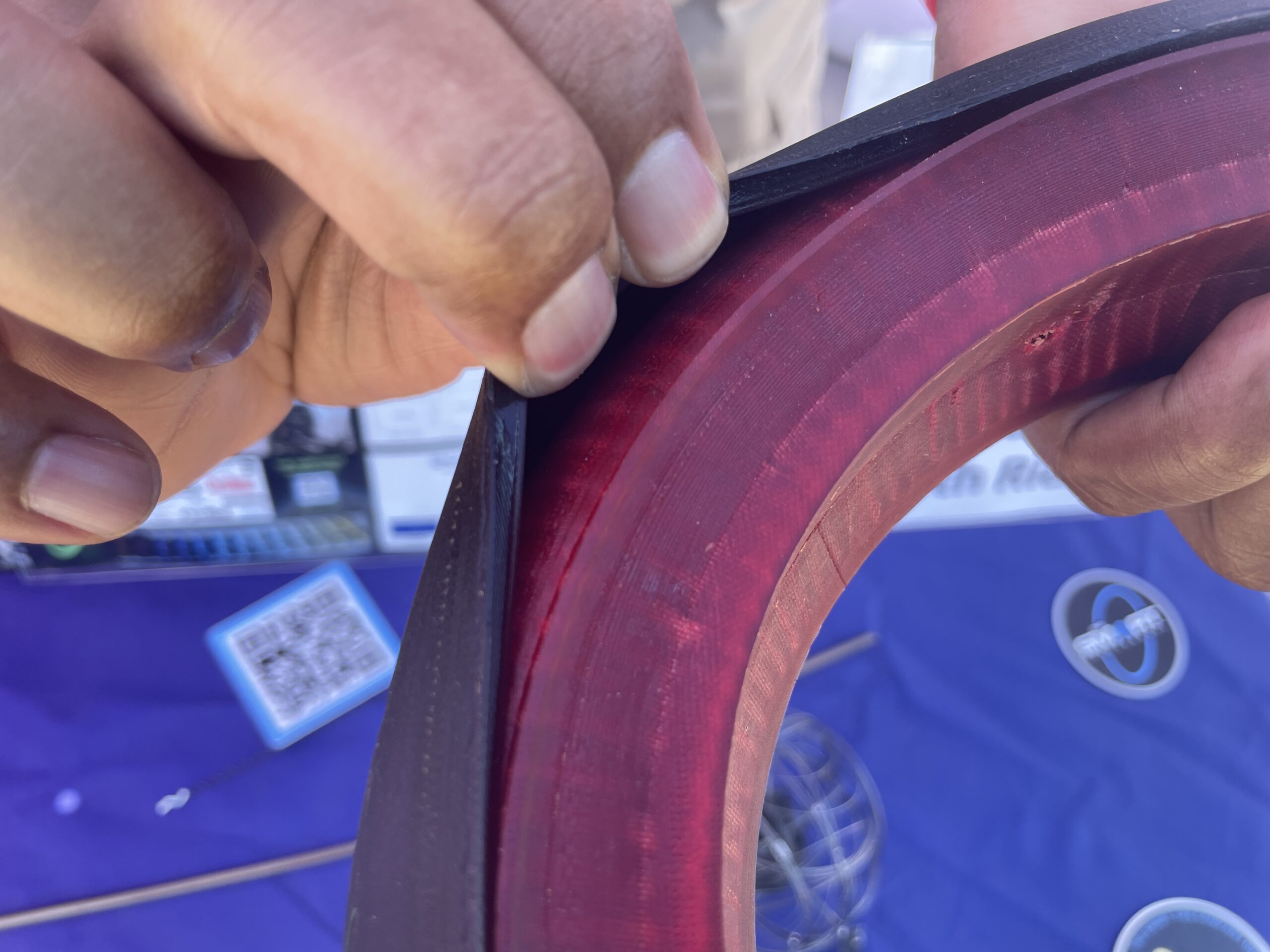 Yeah, it’s going to be the first retreadable bicycle tyre. So when a tread wears out, because the tyre itself will not, you put on another tread. Here’s an example here is a scooter tyre. So you see has this skin on top of it. This will last a life of your vehicle. So when the tread wears out like a bicycle instead of throwing out the whole tyre, you just replace this one. That’s it.