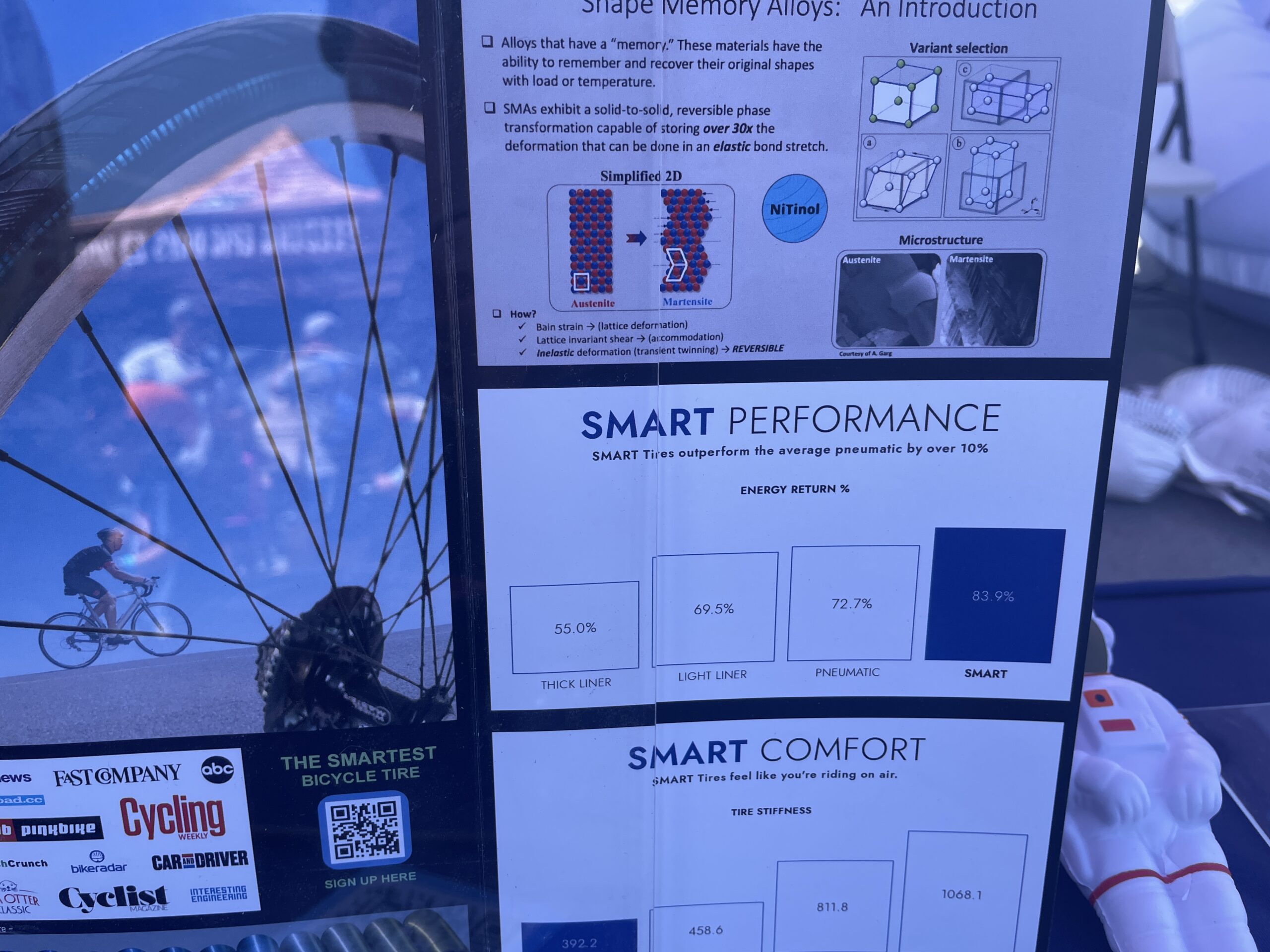 Well, that particular tube that you have that sample with is not what we’re going to be using for bicycles. It’s just a sample of the material. The material is called Nitinol, which is a shape memory alloy. It’s a combination of titanium and nickel. So, Nickel-titanium makes Nitinol. And when you put those two together, you get these magical properties. So it has a high energy return. It will always remember its shape no matter how you bend it. It’s originally from the Mars Rover program with NASA. They’re going to use it on the tyres there. And temperature won’t affect it here on Earth. You can get the hottest of hot, coldest of cold, the PSI will stay the same. It’s a wonderful thing. It’s never been used for tyres before.