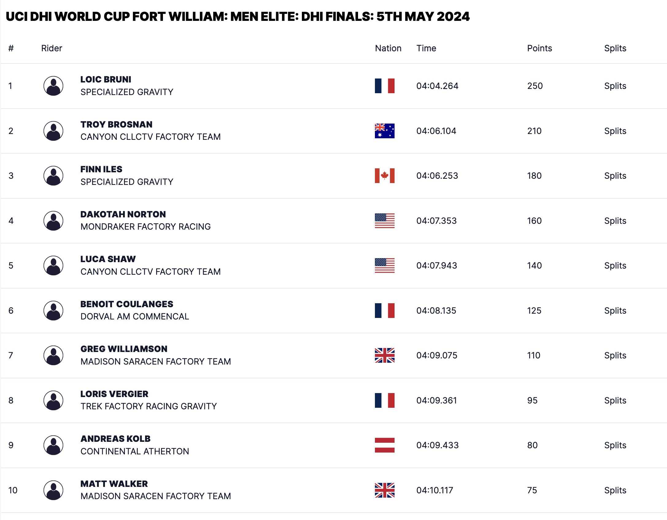 Saturday’s fastest qualifier, Troy Brosnan (Canyon CLLCTV Factory Team), came closest to knocking Bruni out of the hot seat but the Australian and 2014 Fort William UCI World Cup winner could only get within 1.8 seconds to finish in second place. Bruni’s teammate, Finn Iles (Specialized Factory Gravity), made it a successful overall weekend for Specialized Factory Gravity by taking third, while Dakotah Norton and Luca Shaw (Canyon CLLCTV Factory Team) rounded out the podium in fourth and fifth respectively.