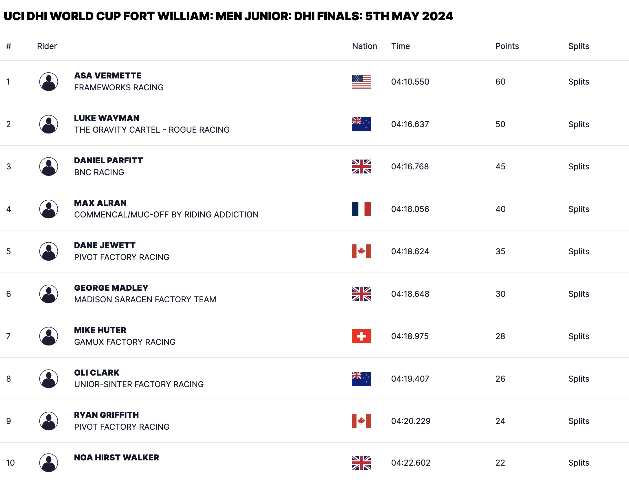 Meanwhile in the Men’s Juniors, Asa Vermette (Framework Racing) blew away the rest of the field with a storming 4:10.55. The American broke his pelvis at the end of March but showed no signs of being held back in Scotland, laying down the fastest splits in three out of four sectors. Luke Wayman (The Gravity Cartel – Rogue Racing) did enough for second, while the local rising star and fastest qualifier Daniel Parfitt (BNC Racing) gave the Scottish fans another thing to cheer with third.