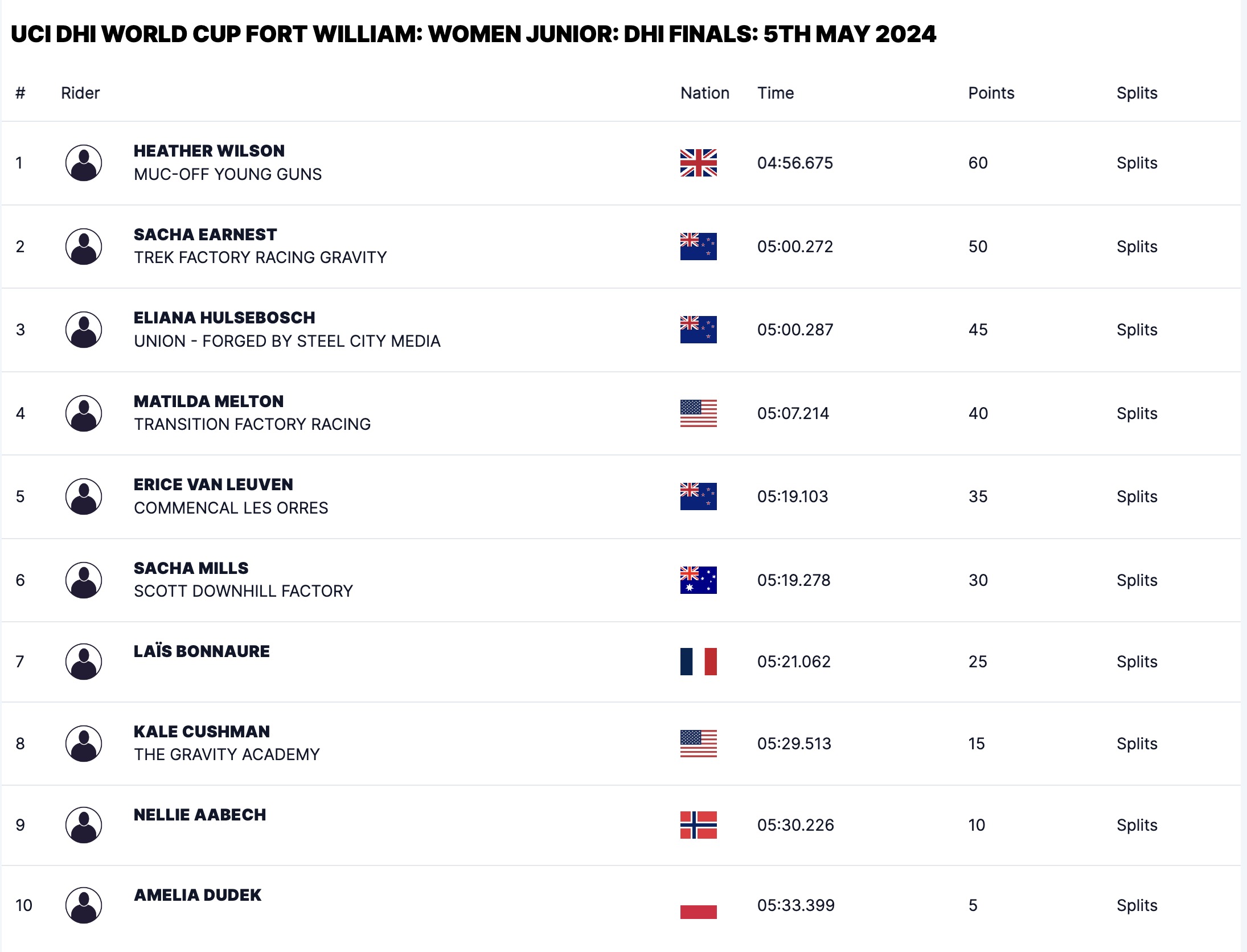 In the Juniors, there was something for the Scottish fans to cheer for in the Women’s Juniors final with local rider Heather Wilson (Muc-Off Young Guns) taking the win in her first-ever UCI World Cup Junior race. The 17-year-old used her experience on the Fort William course to post the only sub-five-minute run of the age group event, with Sacha Earnest (Trek Factory Racing Gravity) and Eliana Hulsebosch (Union – Forged by Steel City Media) finishing in second and third respectively more than 3.5 seconds back. The 2023 UCI World Champion Erice Van Leuven (Commencal Les Orres) was last down the hill and looked set to edge Wilson out of the hot seat until a rear flat in the final sector meant she had to settle for fifth.