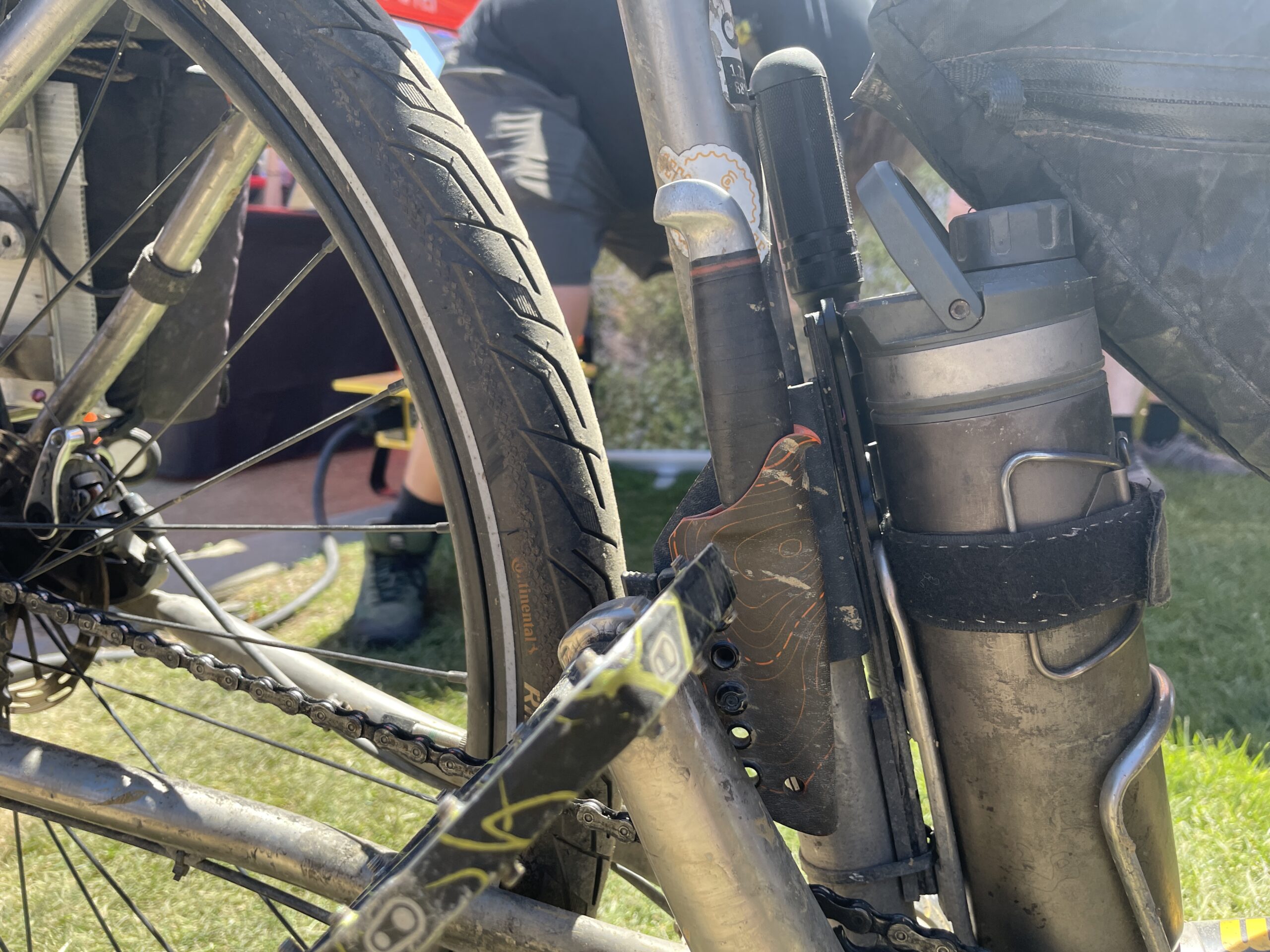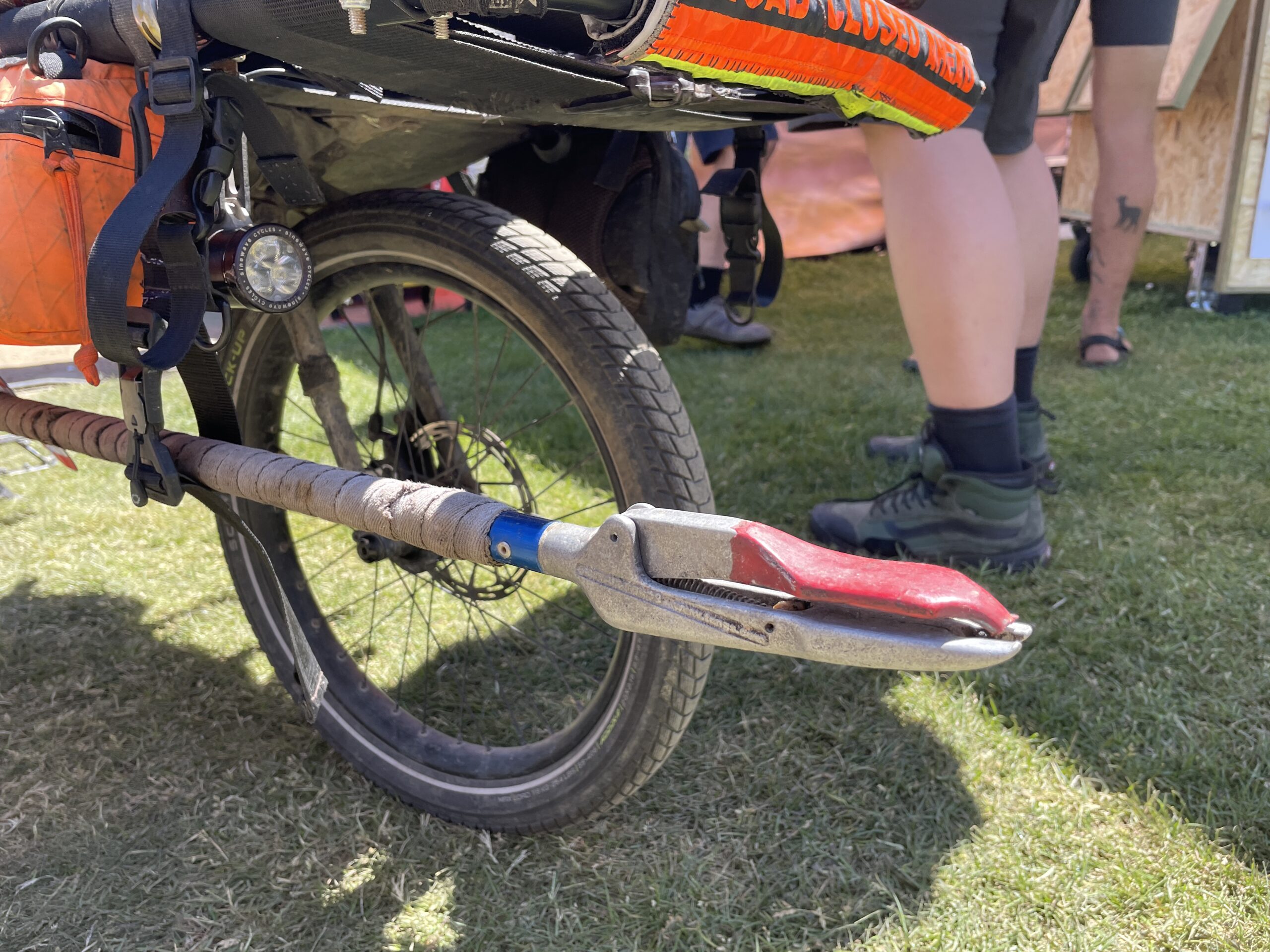 Right. Yeah, it’s a heck of a lot of stuff strapped onto a Omnium cargo bike. It’s a cargo bike made for and intended to be used by bike messengers who might be carrying, you know, 20 pizzas or a bunch of banker boxes or, you know, a sofa or anything like that doing deliveries. But I’ve been riding it around North America for about a year and a half.